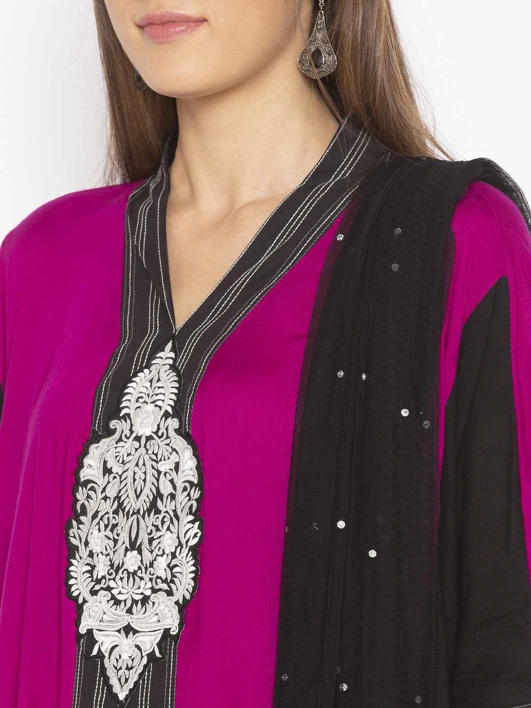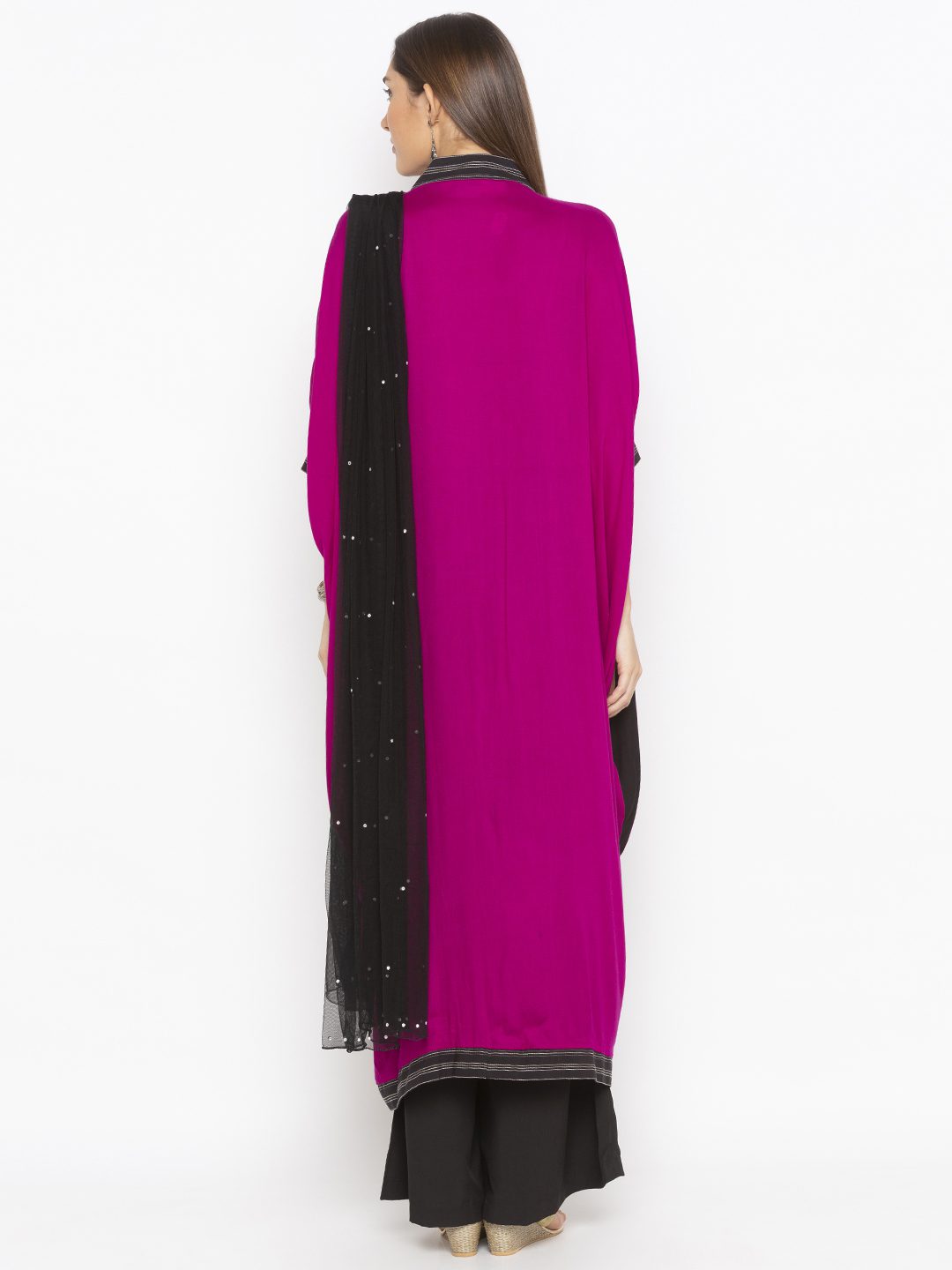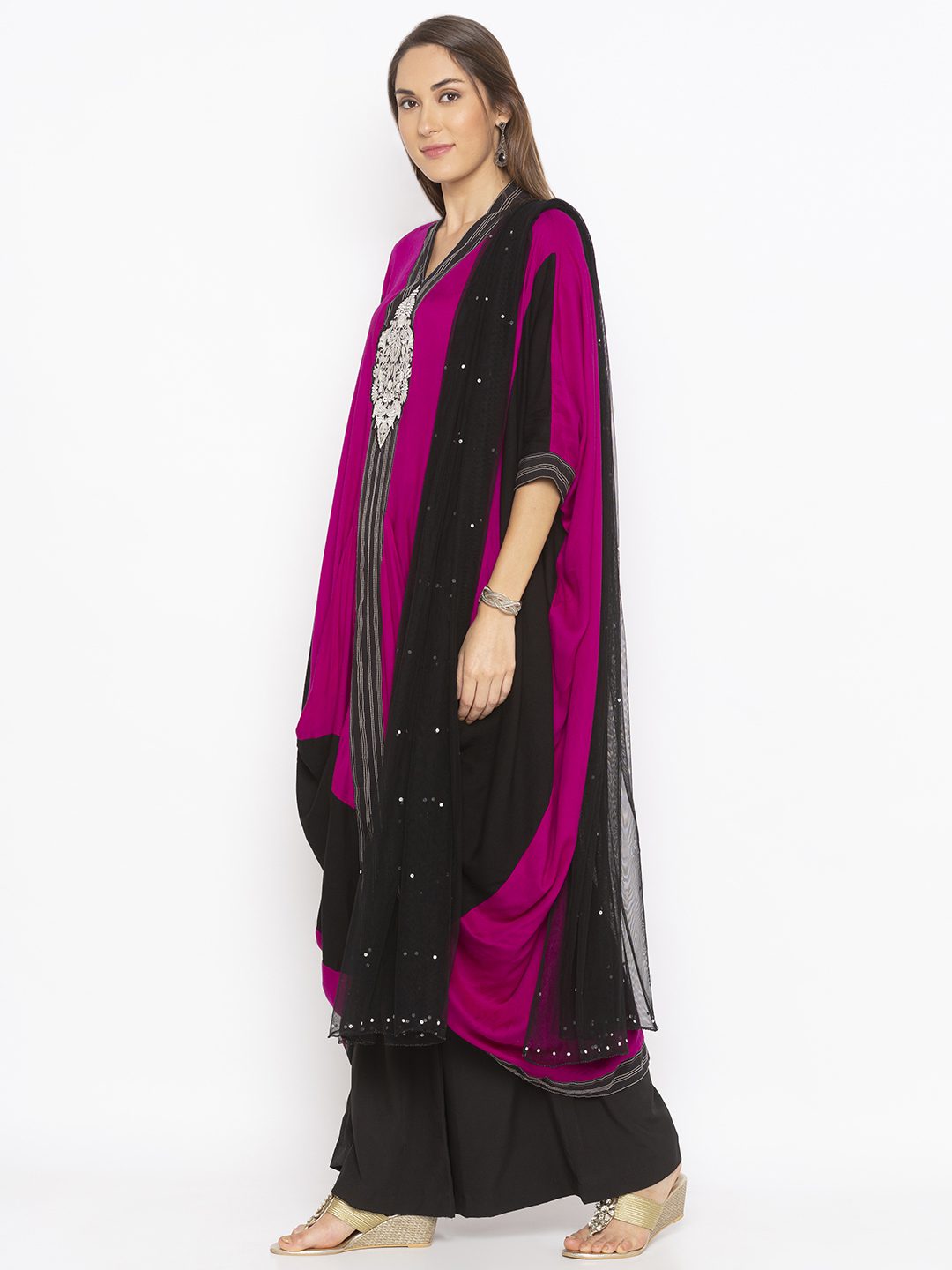 Pink Black Cotton Kaftan Style Kurta Draped On Both Sides With Black And White Stitching Detailing Running In Front Panel Going At The Sides And On Two Toned Semi Three Quarter Sleeves Embroidered Motif Below Neck Worn With Black Palazzos And Black Chiffon Dupatta With Silver Borders On It.
