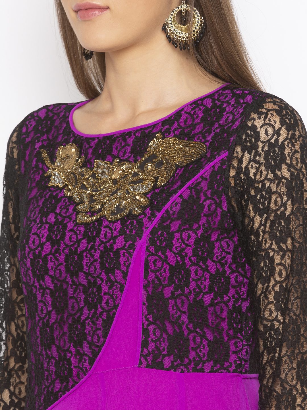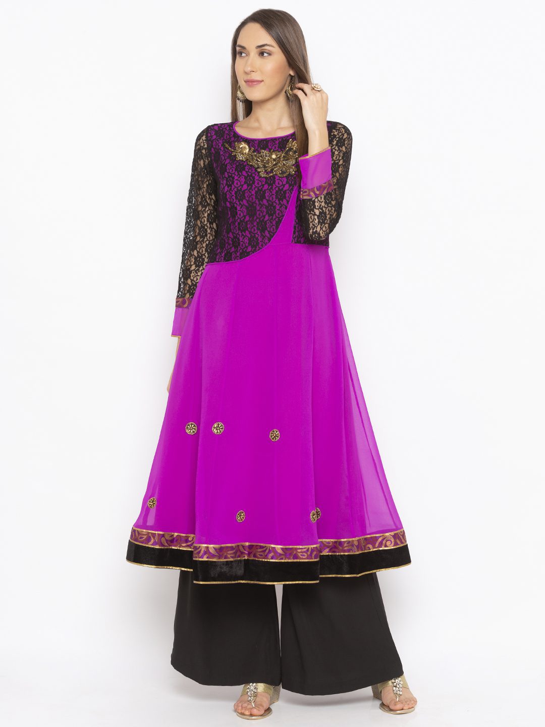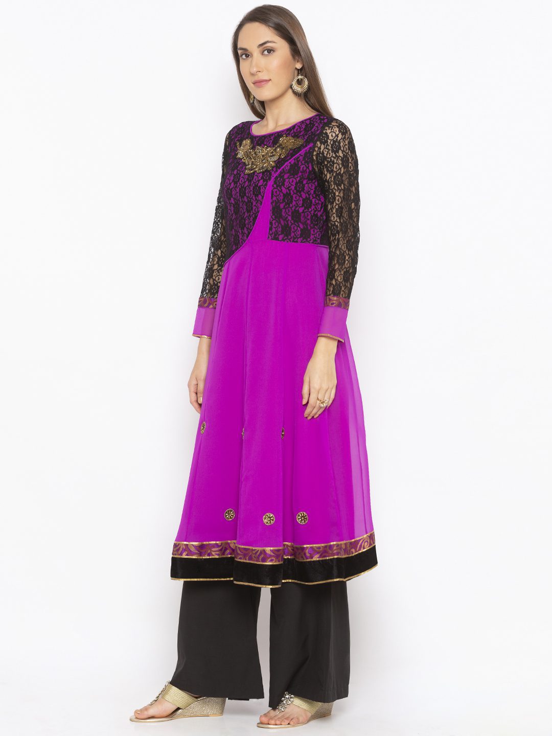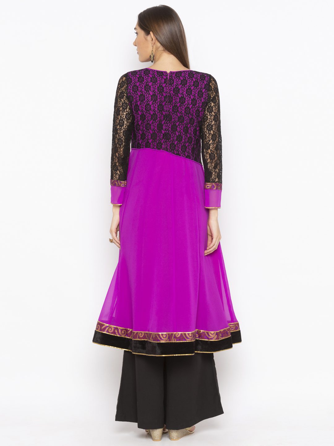 Magenta Georgette Kalidar Kurta With Black Net Lace Half Body And Full Sleeves With Hand Embroidery On Neckline And Hemline.. Brocade Print And Velvet Detailing With Antique Gold Gota Patti On Sleeves And Ghera Worn With Black Palazzos.