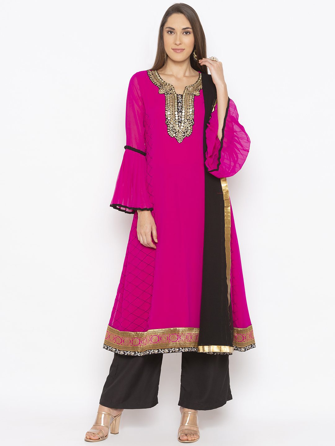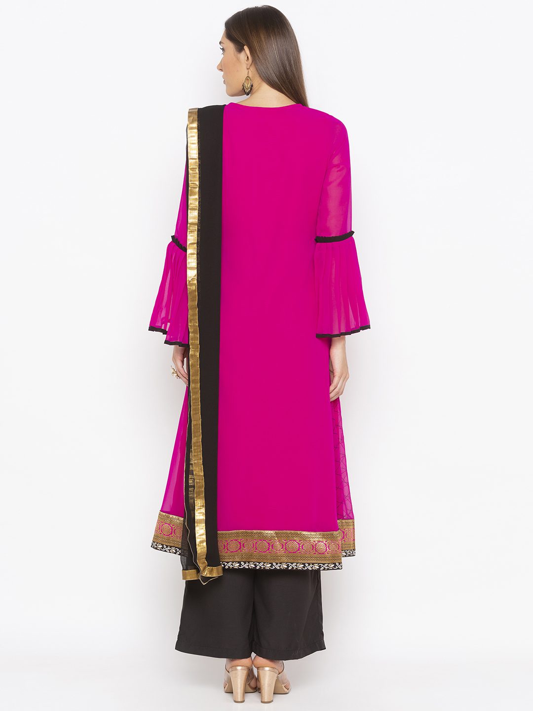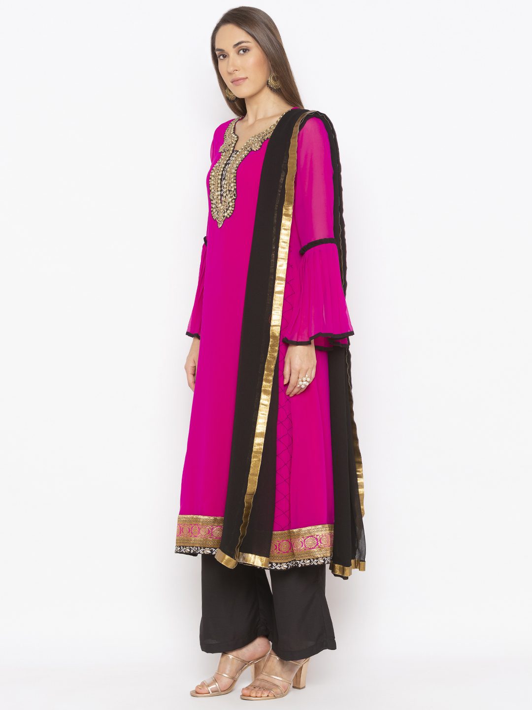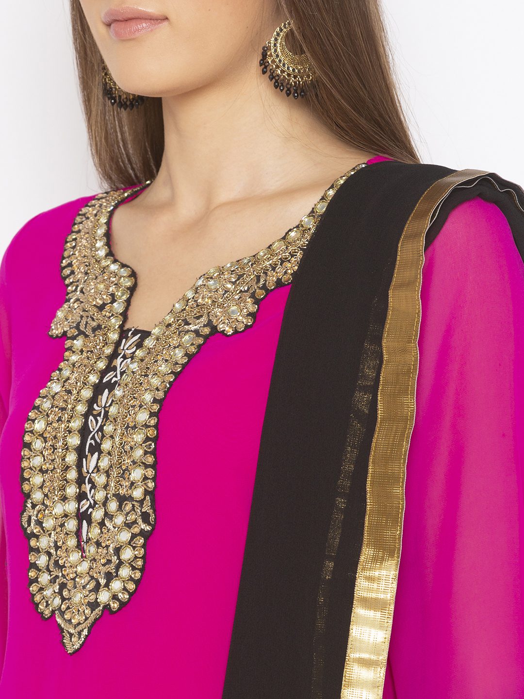 Bright Pink Georgette Kalidar Kurta With Mirror And Gold Zardozi Hand Embroidery On Neckline… Three Quarter Semi Bell Sleeves With Pleat Detailing Of Black On It And Black Stitching Detail On Side Panels ..Brocade Border At The Edge Of The Kurta And Black Print Border At The End Worn With Black Culottes And Black Chiffon Dupatta.
