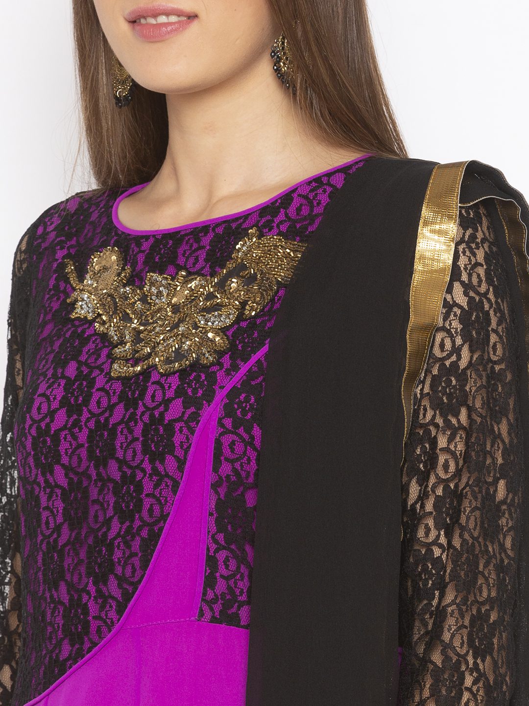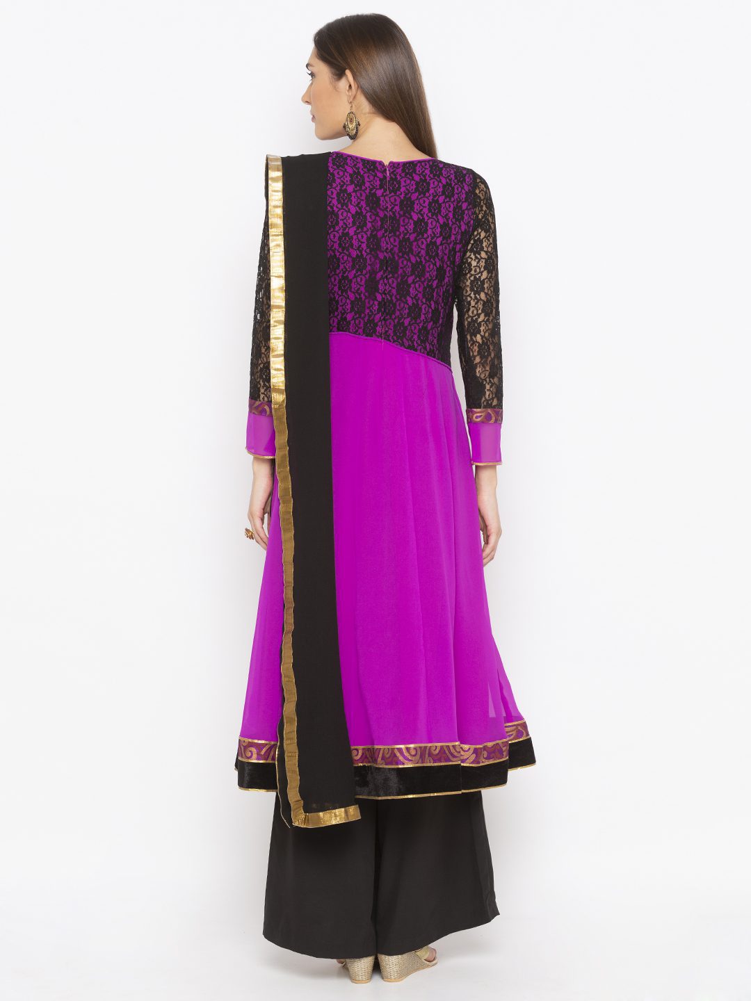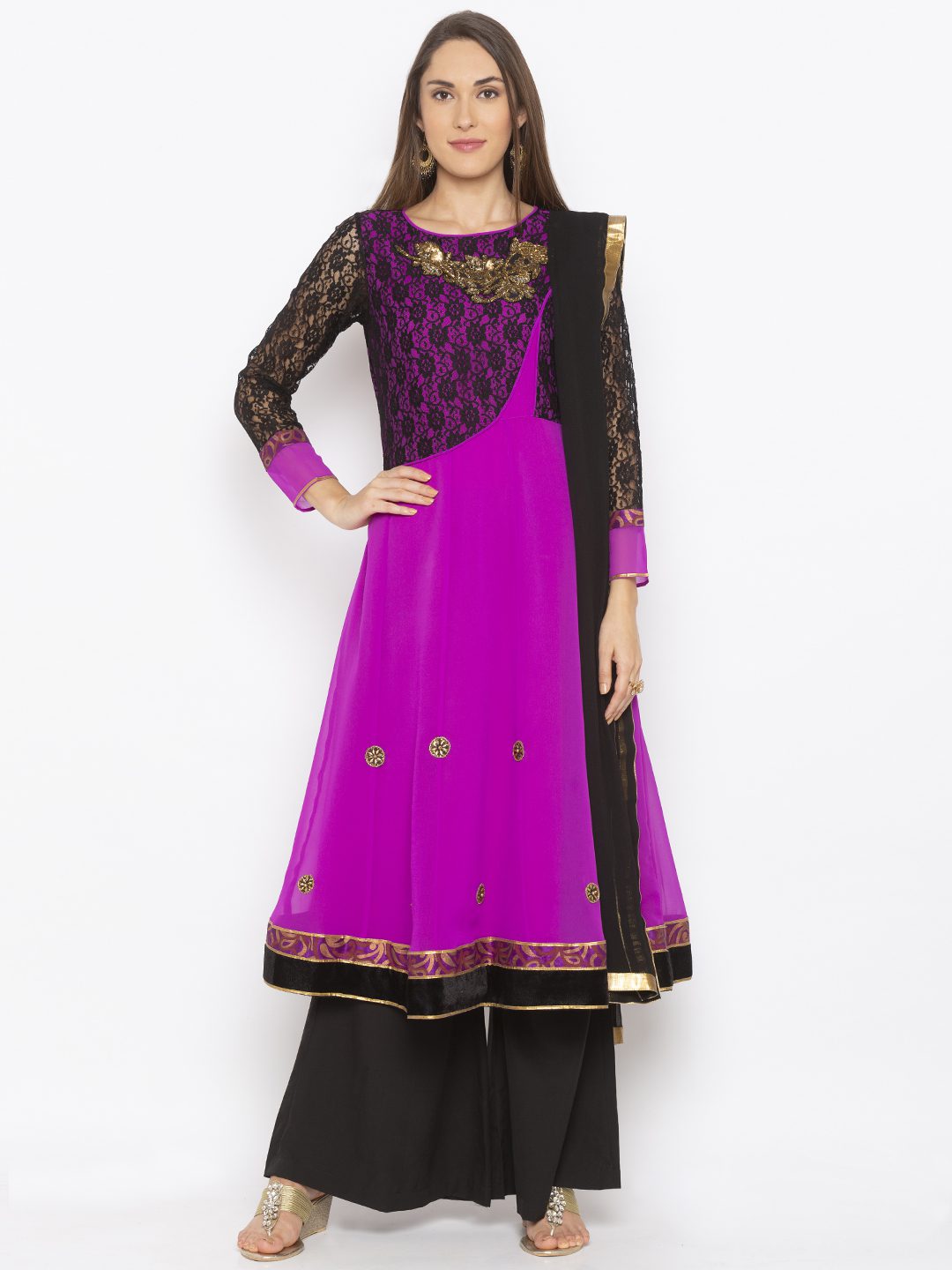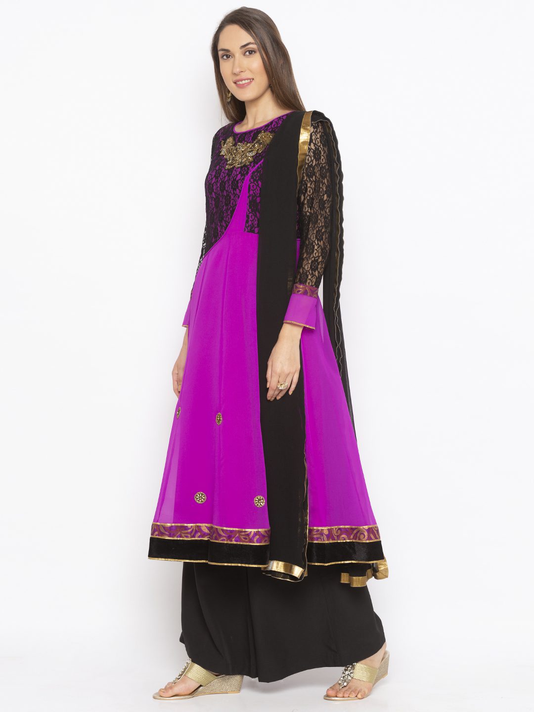 Magenta Georgette Kalidar Kurta With Black Net Lace Half Body And Full Sleeves With Hand Embroidery On Neckline And Hemline.. Brocade Print And Velvet Detailing With Antique Gold Gota Patti On Sleeves And hemline Worn With Black Palazzos And Black Chiffon Dupatta With Gold Border On It