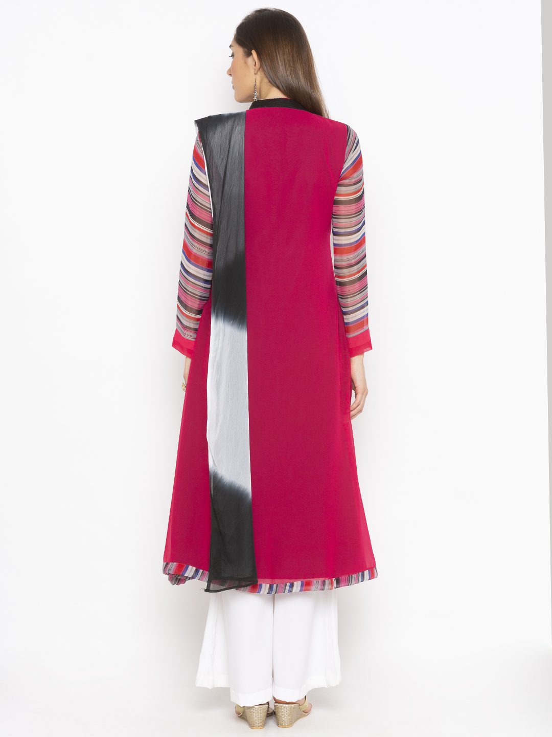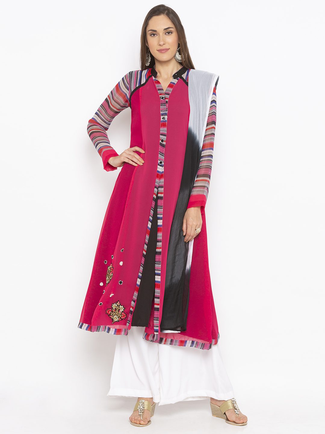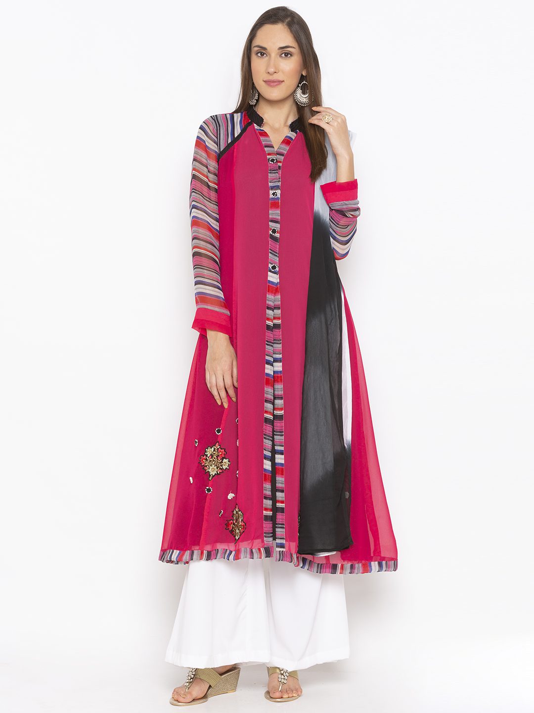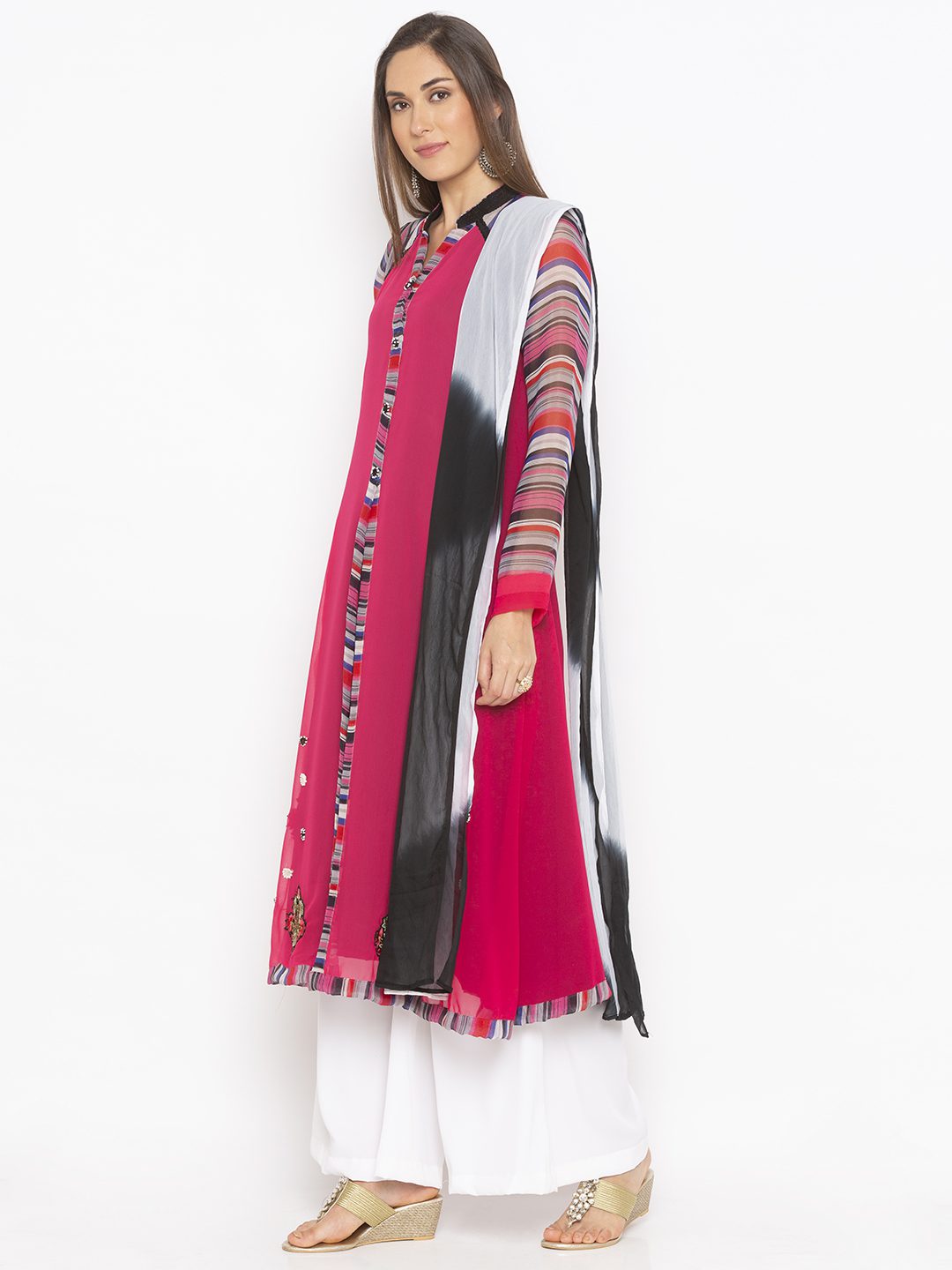 Light Pink Dark Pink Georgette Slightly Flared Jacket Style Kurta With Black Inner Kurta Having Print Detailing In Front .. Full Sleeves With Double Color Edging And Hemline With Black Sequence Detailing On Collar… Shoulder With Embroidery Spread All Over The Hemline. Worn With White Palazzos And Black Off White Shaded Dupatta.
