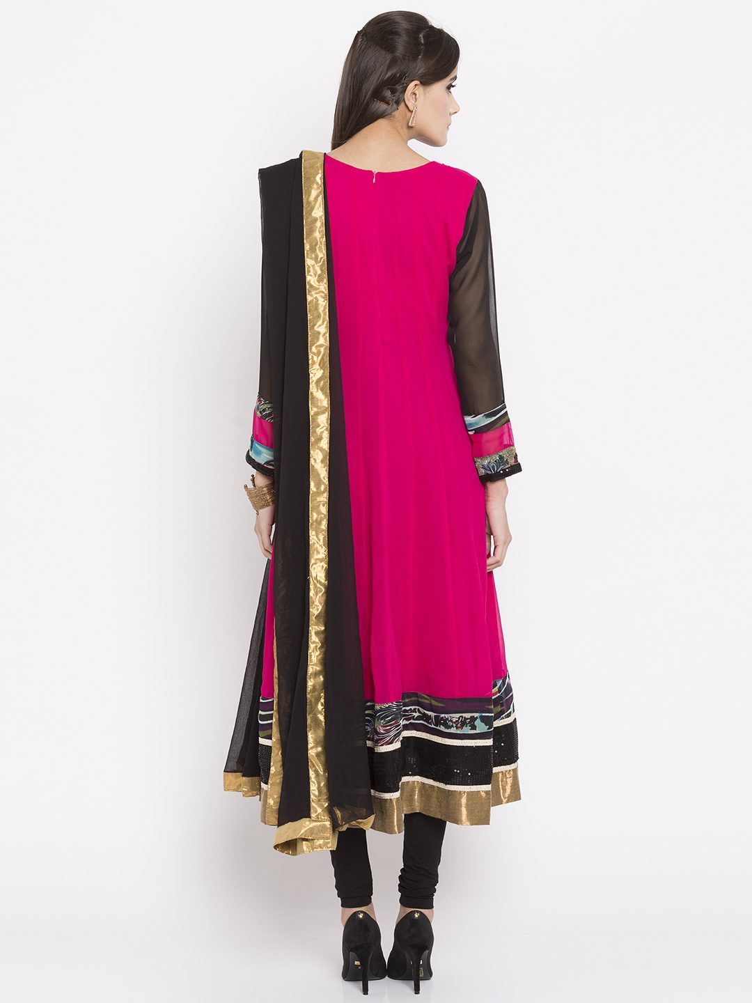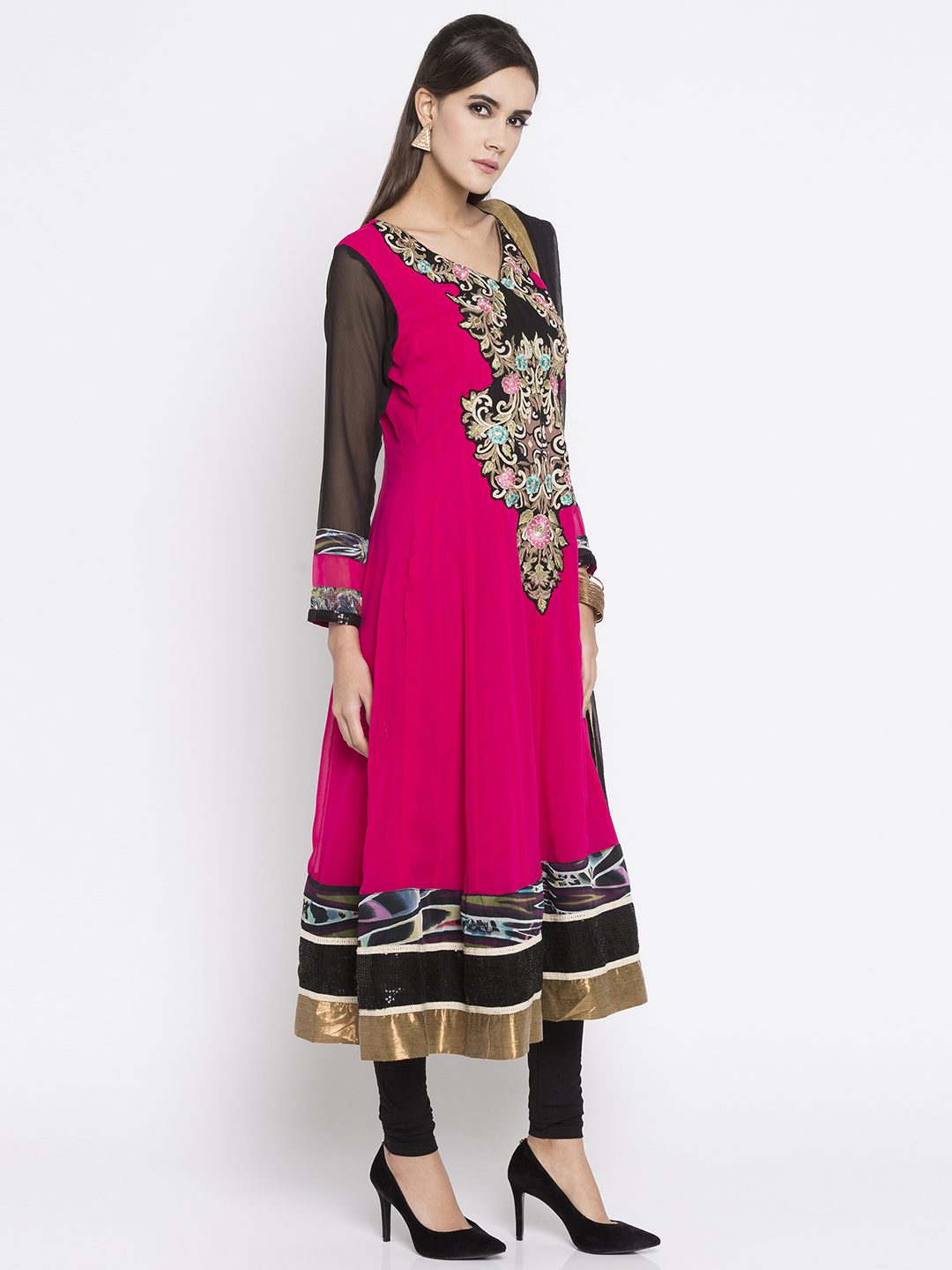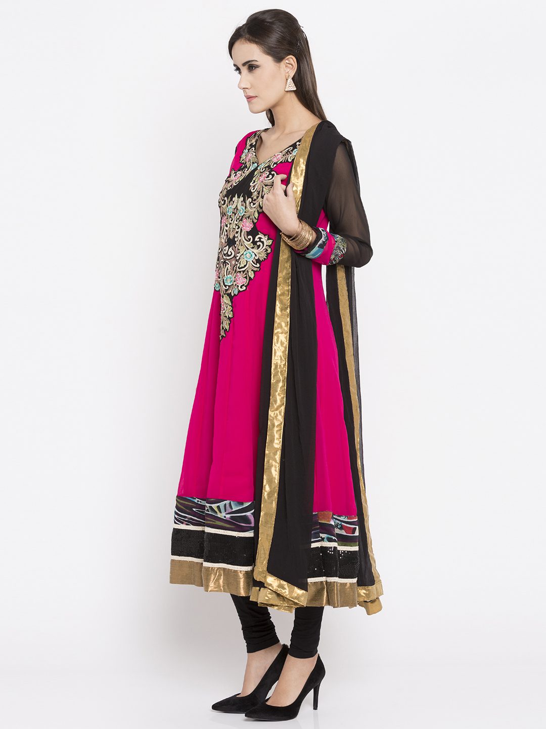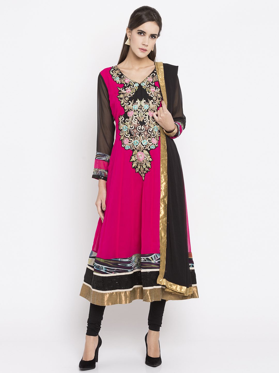 Pink georgette readymade quarter sleeves kalidar kameez designed with rich resham embroidery detailing at the neckyoke enhanced by printed, sequined and tissue fabric attachement at the hemline and sleeves. This flared kameez comes with a crape churidar and a laced Black chiffon dupatta.