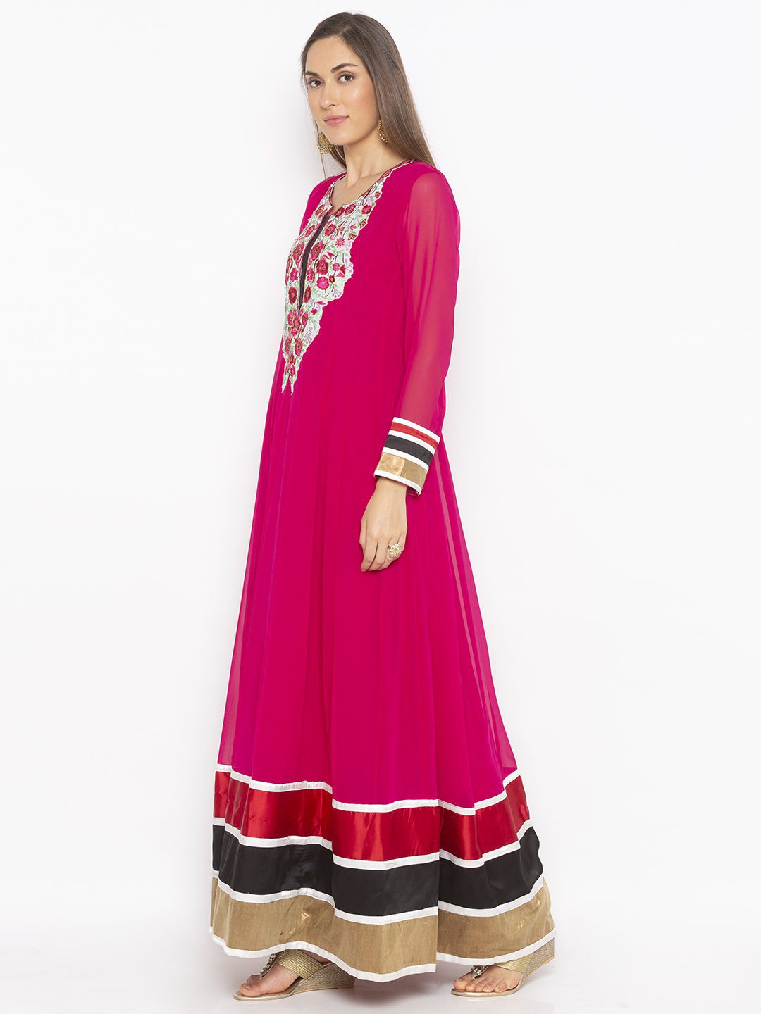 Rani Pink Georgette Kalidar Floor Length Kurta With Satin And Tissue Detailing On Full Sleeves Edge And Flair Of Kurta With Multicolored Thread And Gold Zari Embroidery On The Yoke Worn With White Pants.