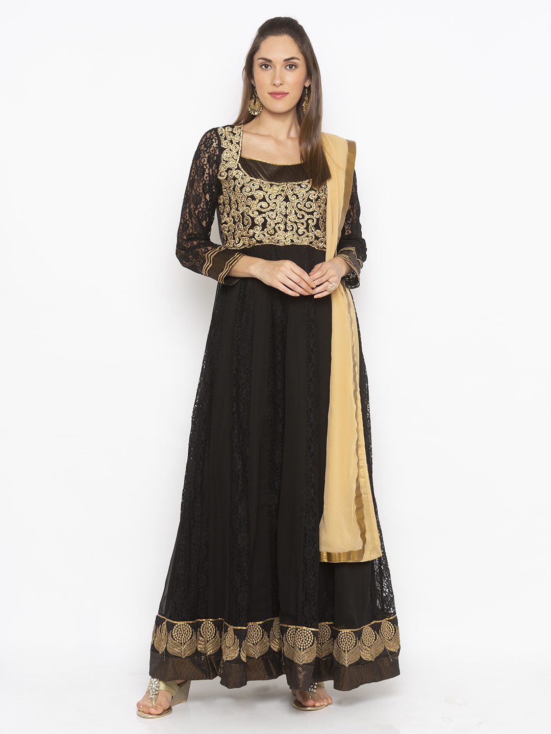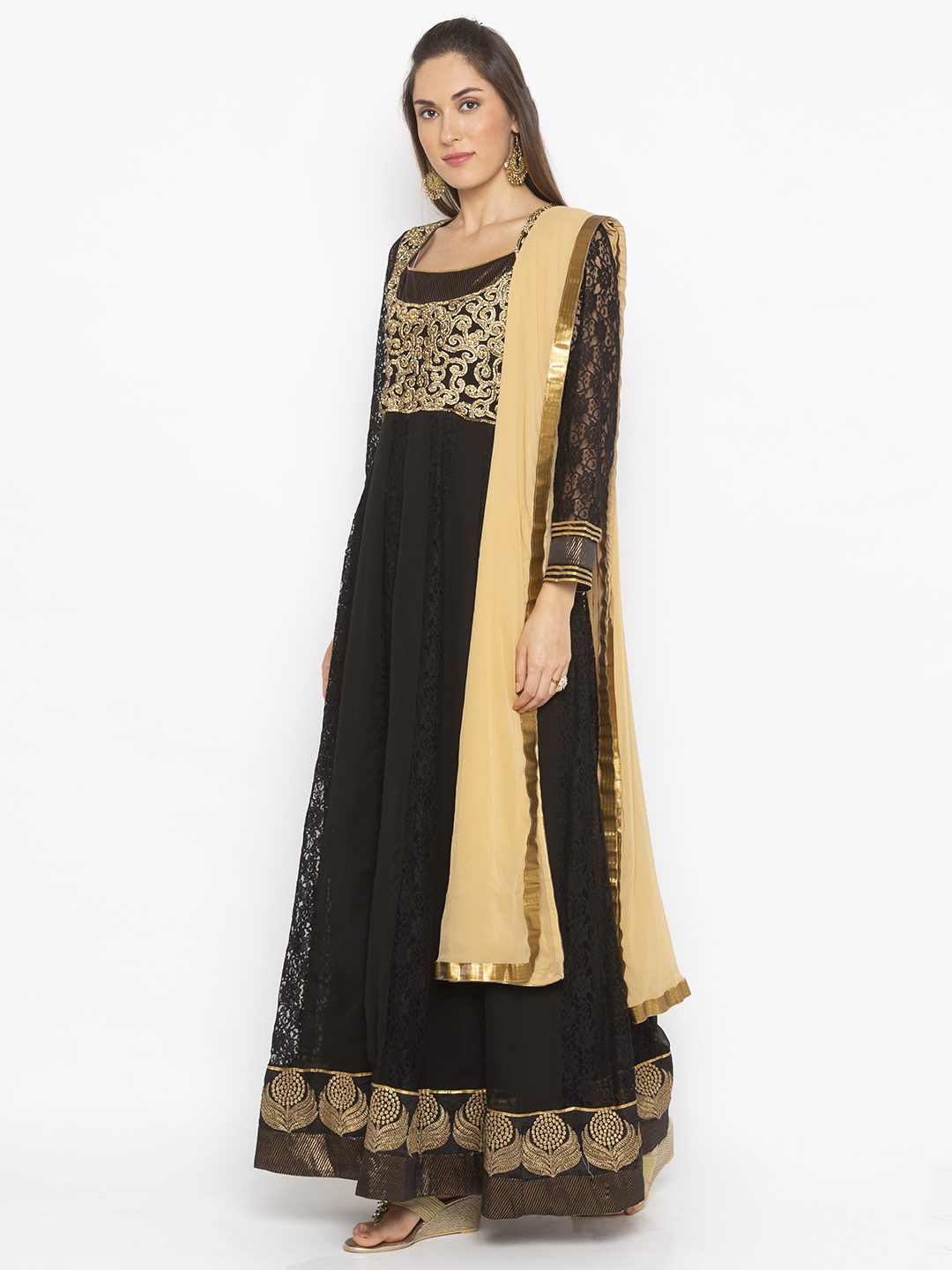 Black Georgette Net Lace Full Length Kalidar Kurta With Champagne Gold Heavy Embroidered Yoke ..Black Net Lace See-Through Full Sleeves With Brocade Detailing Below Neckline And Sleeves Edge And Embroidered Antique Gold Border On Hemline. Work With Black Churidar And Beige Dupatta With Gold Borders On All Sides.