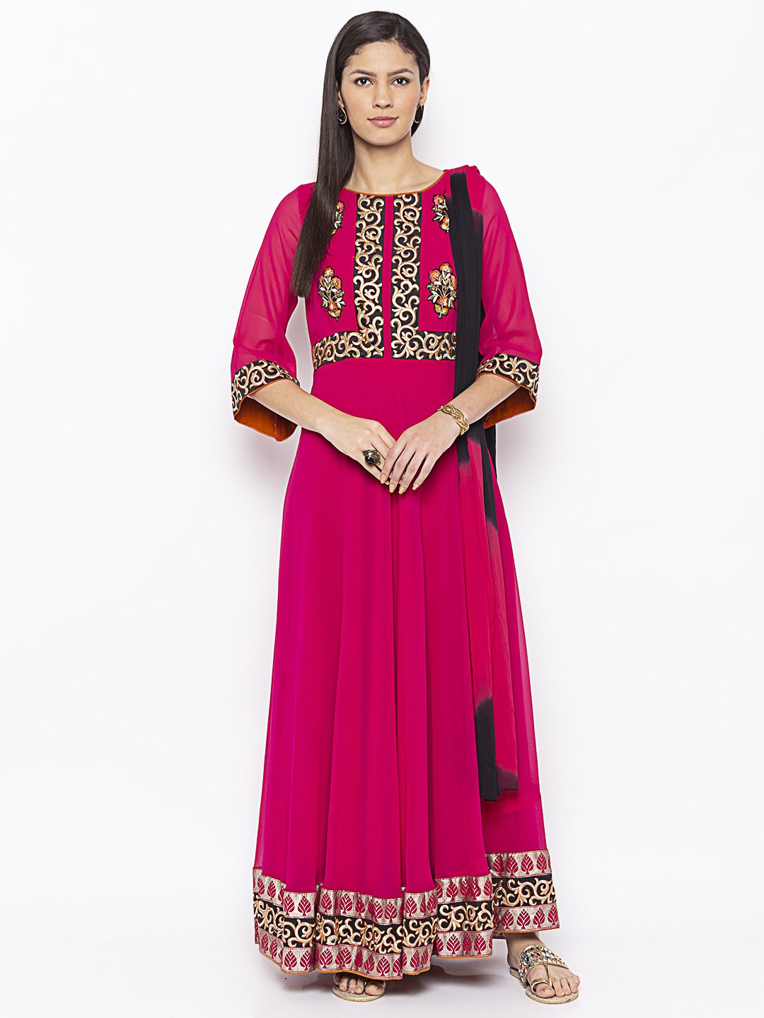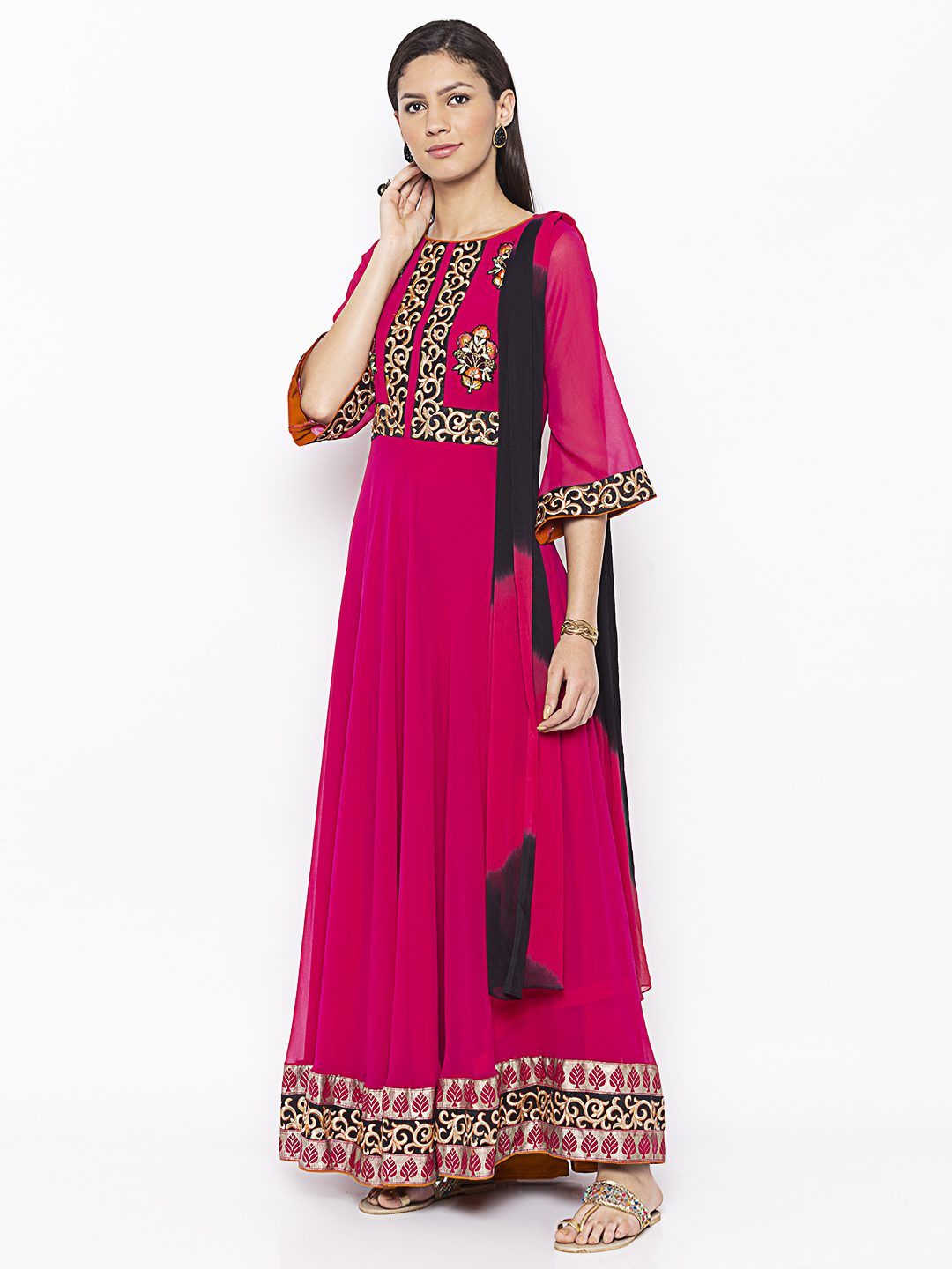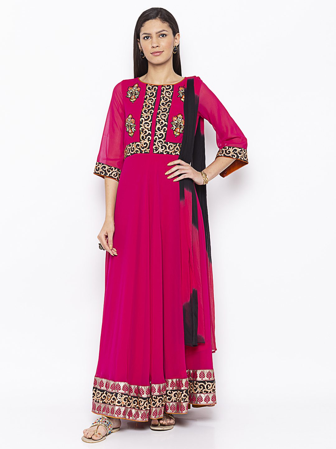 Rani Pink Georgette Flared Floor Length Kurta With Black Gold Multicolor Embroidery On Upper Body Three Fourth Semi Bell Sleeves And Hemline With Contrast Rust Piping Detailings Around Them Worn With Black Cigarette Pants And Black Pink Shaded Chiffon Dupatta