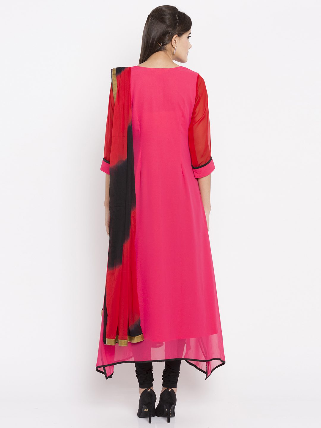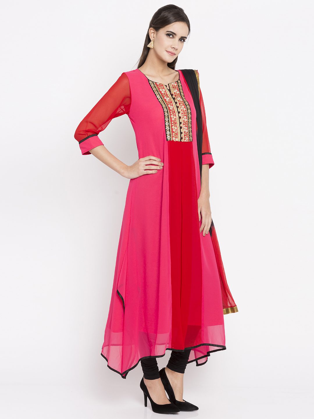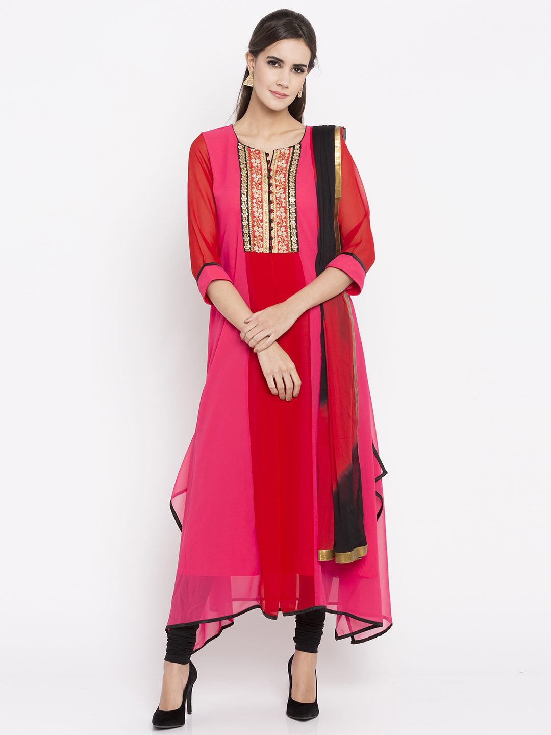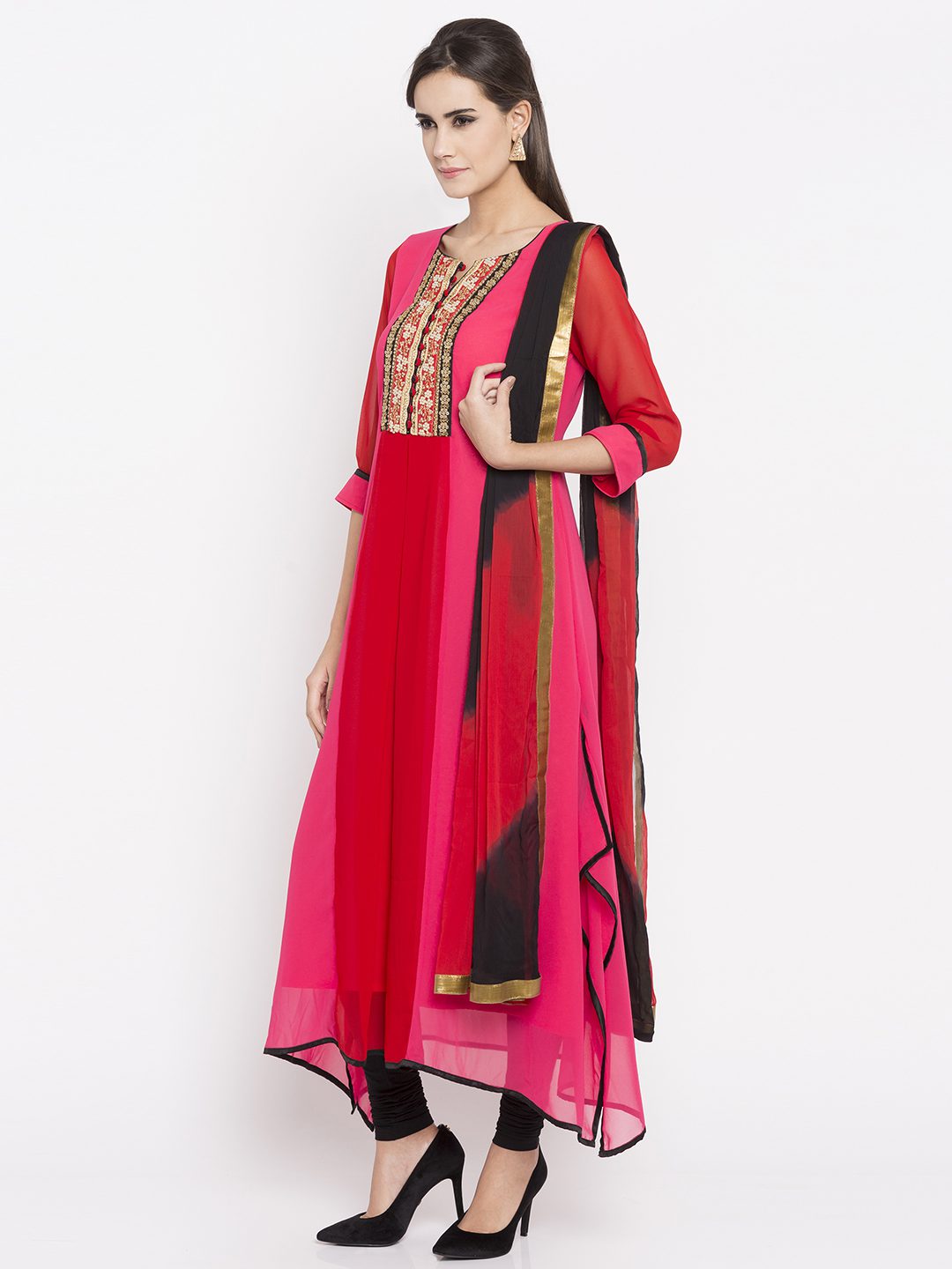 Pink georgette readymade quarter sleeves asymmetrical kameez designed with rich embroidery detailing at the neckyoke including beads and sequins work. As shown, it comes along with a black crape churidar and a laced chiffon dupatta in shaded red And black colour.
