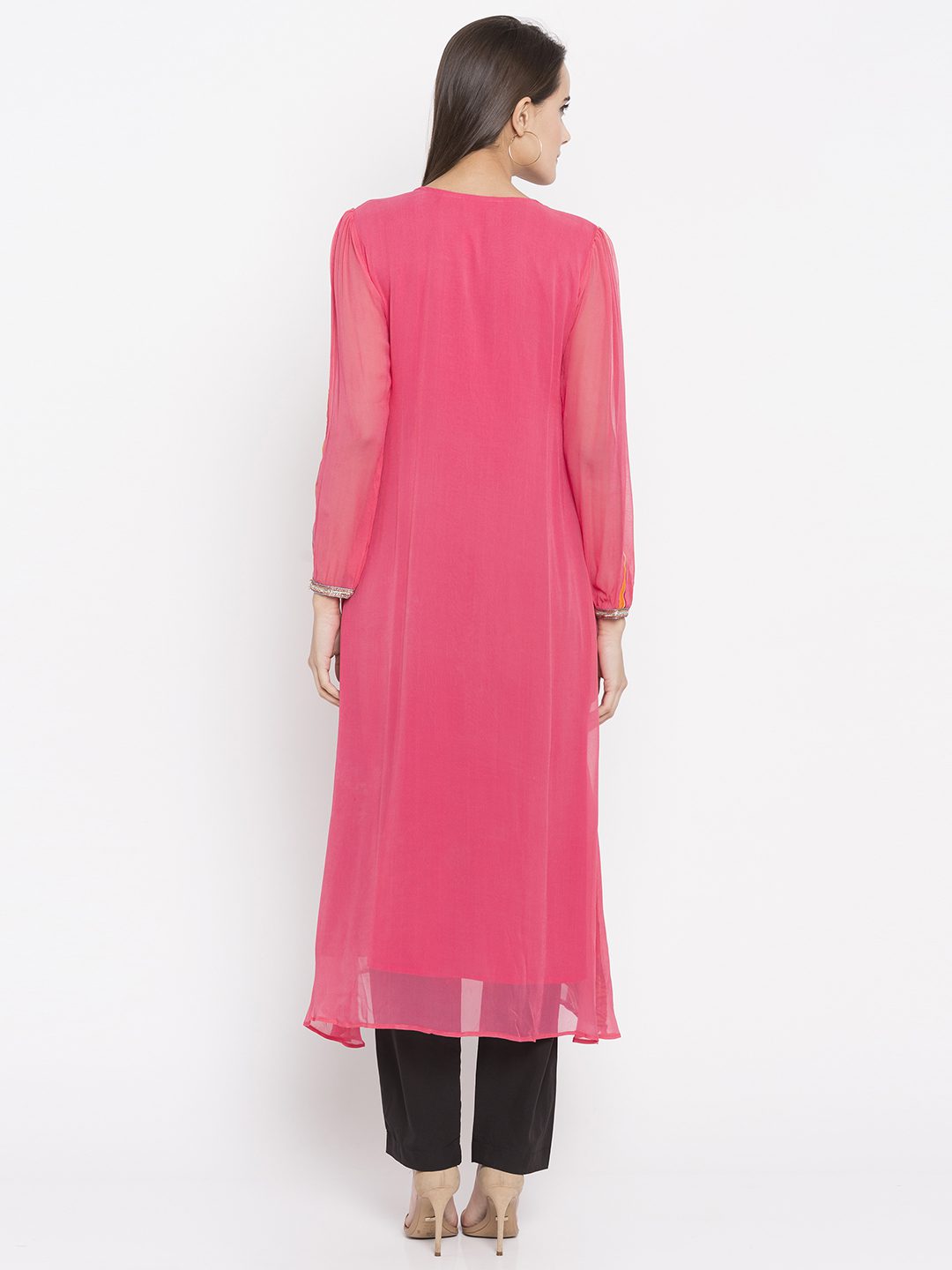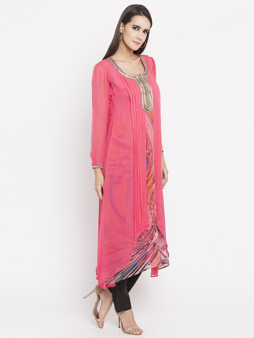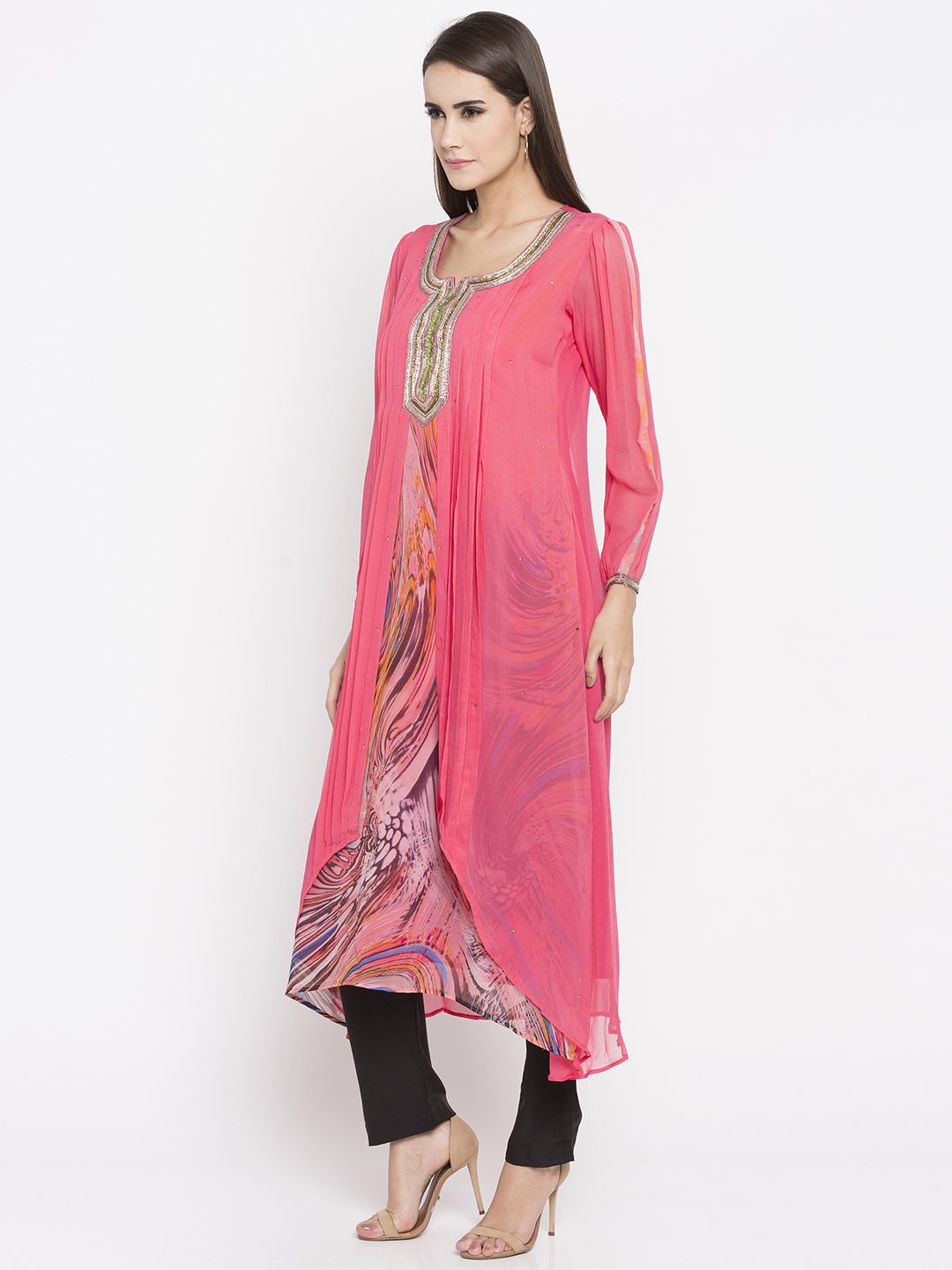 Pink twin layered asymmetrical readymade kameez in georgette designed with striking abstract print detailing enhanced by sequins & beads embroidery work at the yoke and stone embellishment. worn with Black Pants.