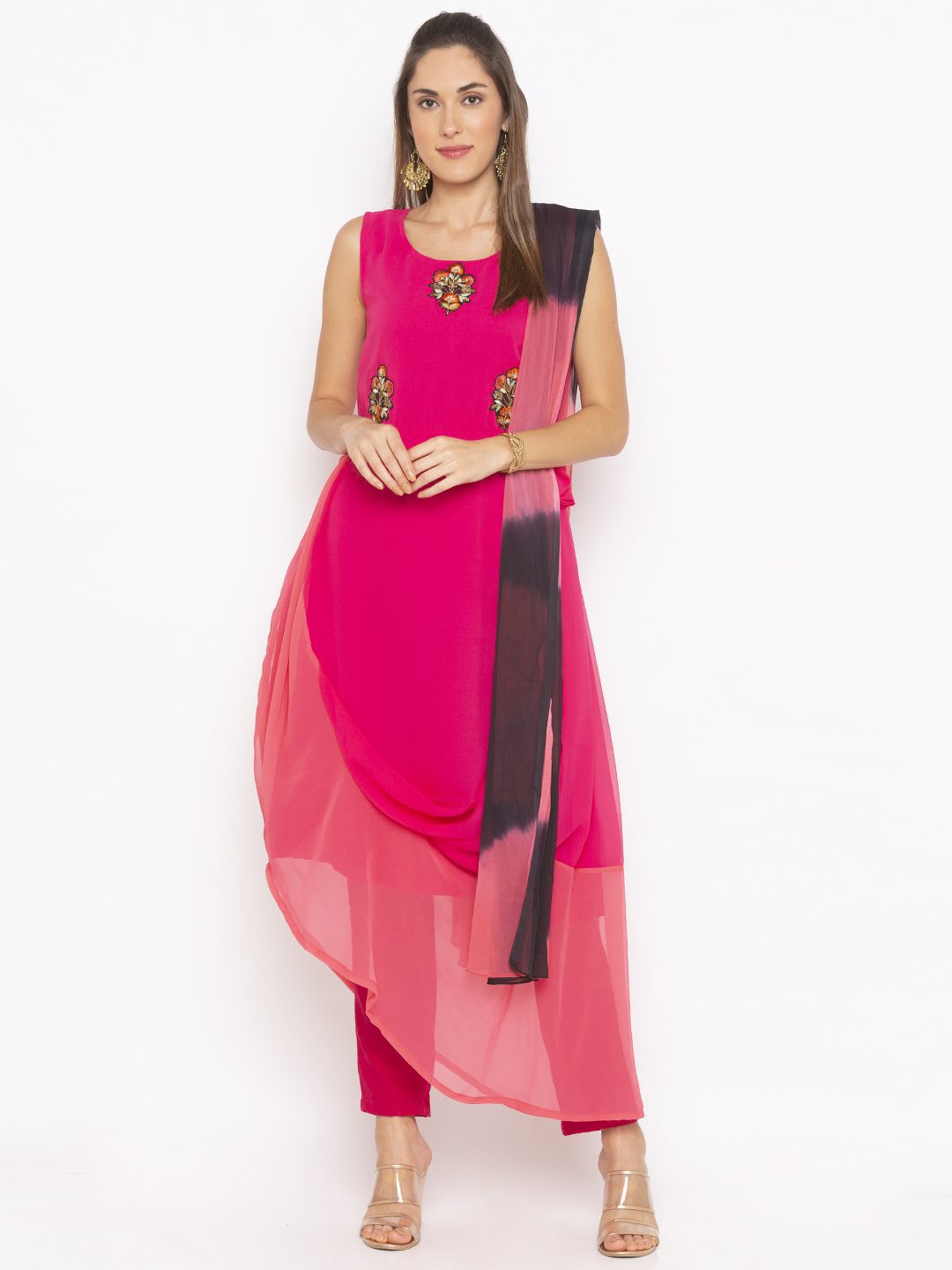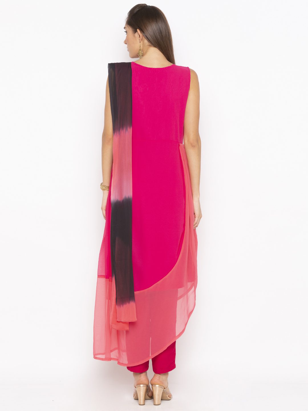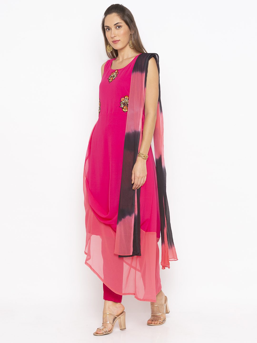 Pink Light Dark Two-Toned Georgette Asymmetrical Draped Kurta Sleeveless With Embroidered Zari Resham Motifs On Upper Body Worn With Pink Cigarette Pants And Light Pink And Black Shaded Dupatta.