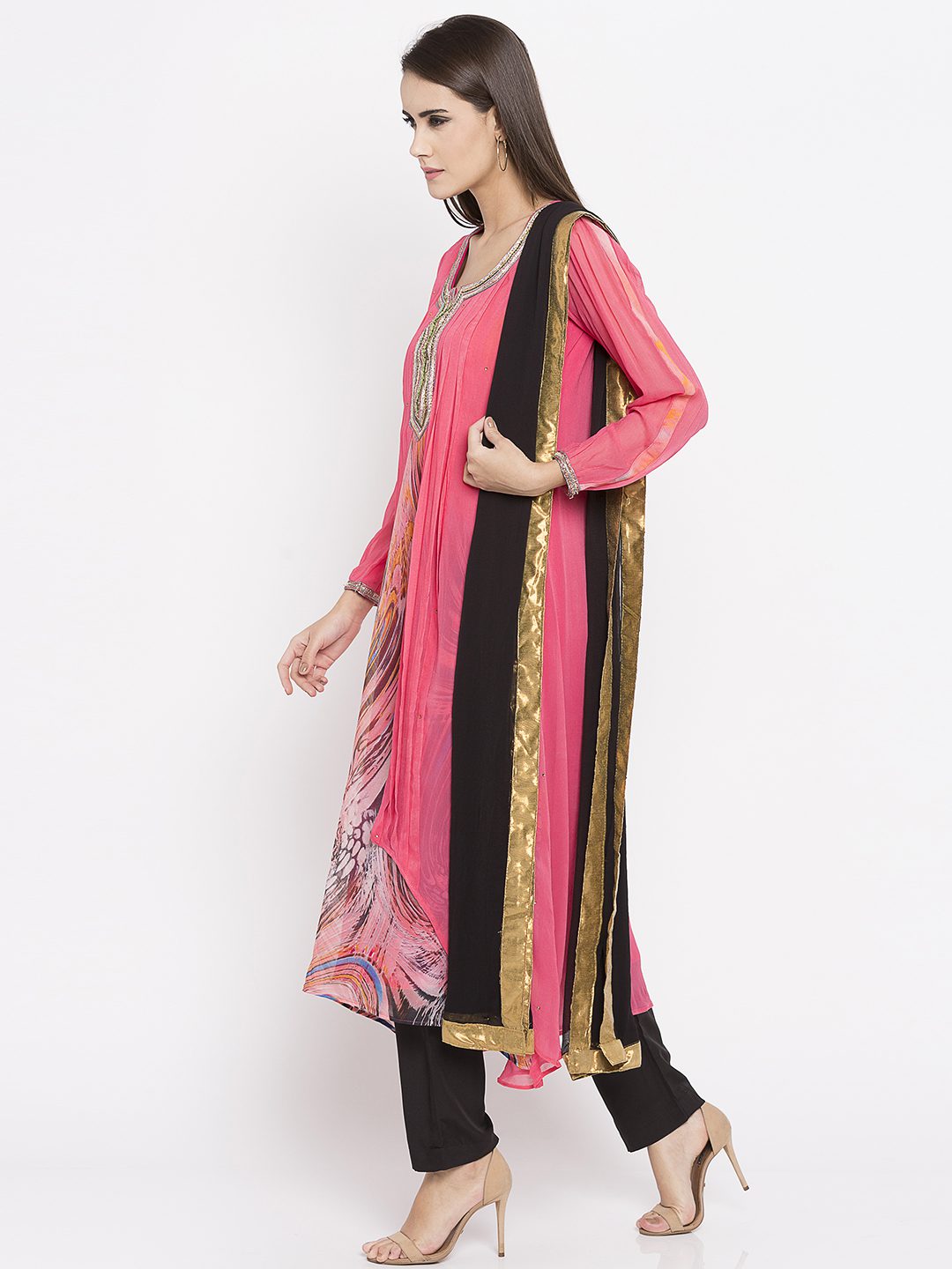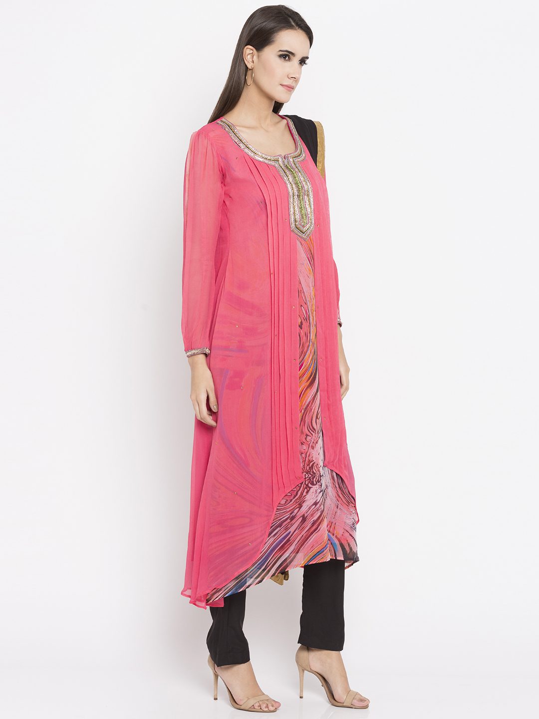 Pink twin layered asymmetrical readymade kameez in georgette designed with striking abstract print detailing enhanced by sequins & beads embroidery work at the yoke and stone embellishment. worn with Black Pants And Black Chiffon Dupatta.