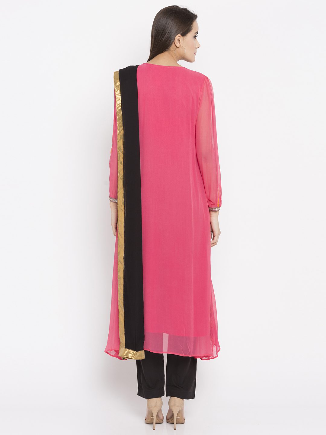 Nikhaar Creations Pink Embroidered georgette Asymmetrical Trouser Kurta Dupatta
