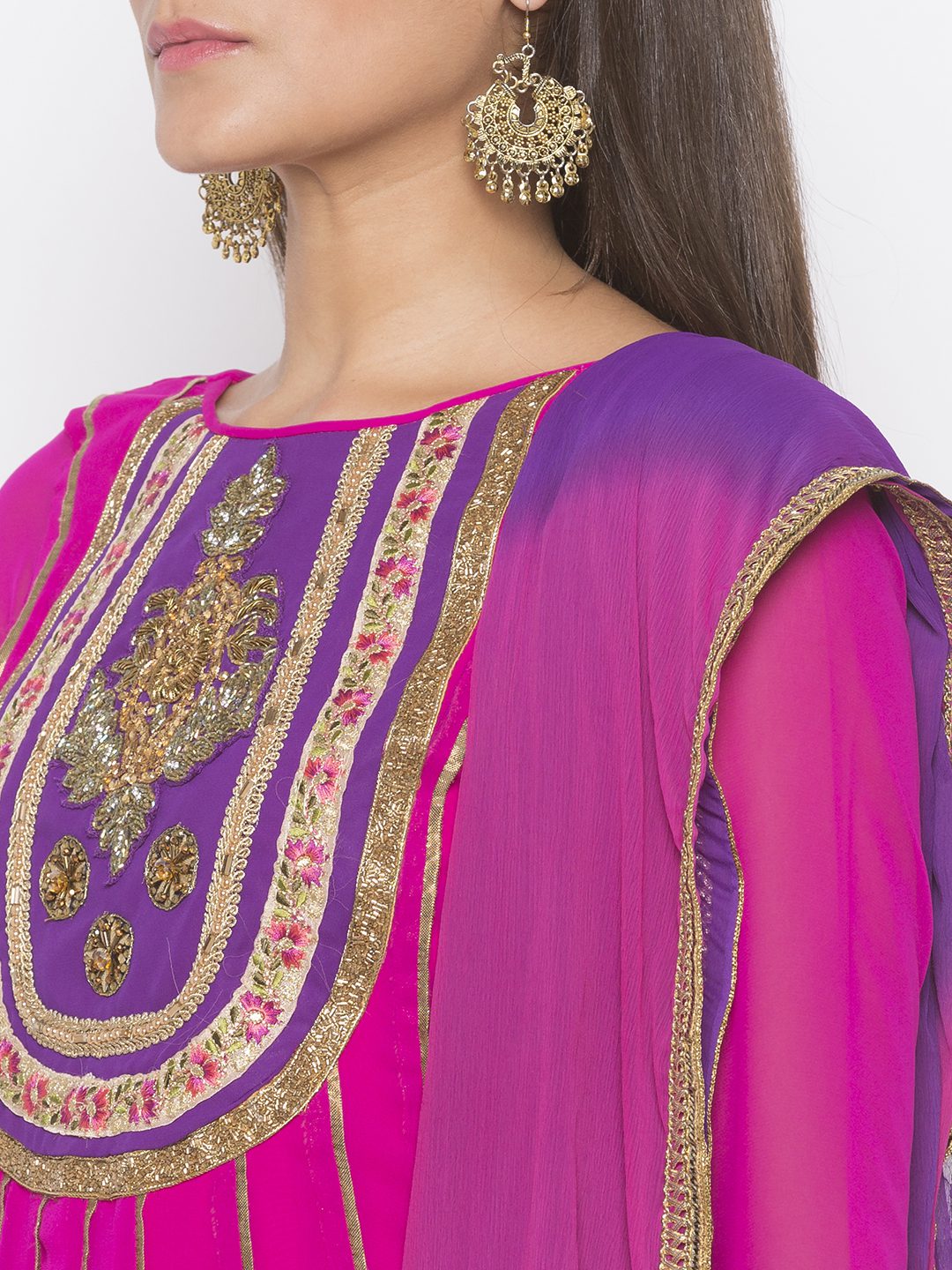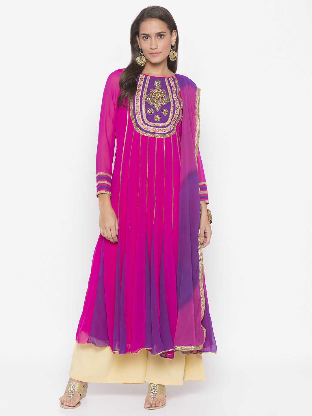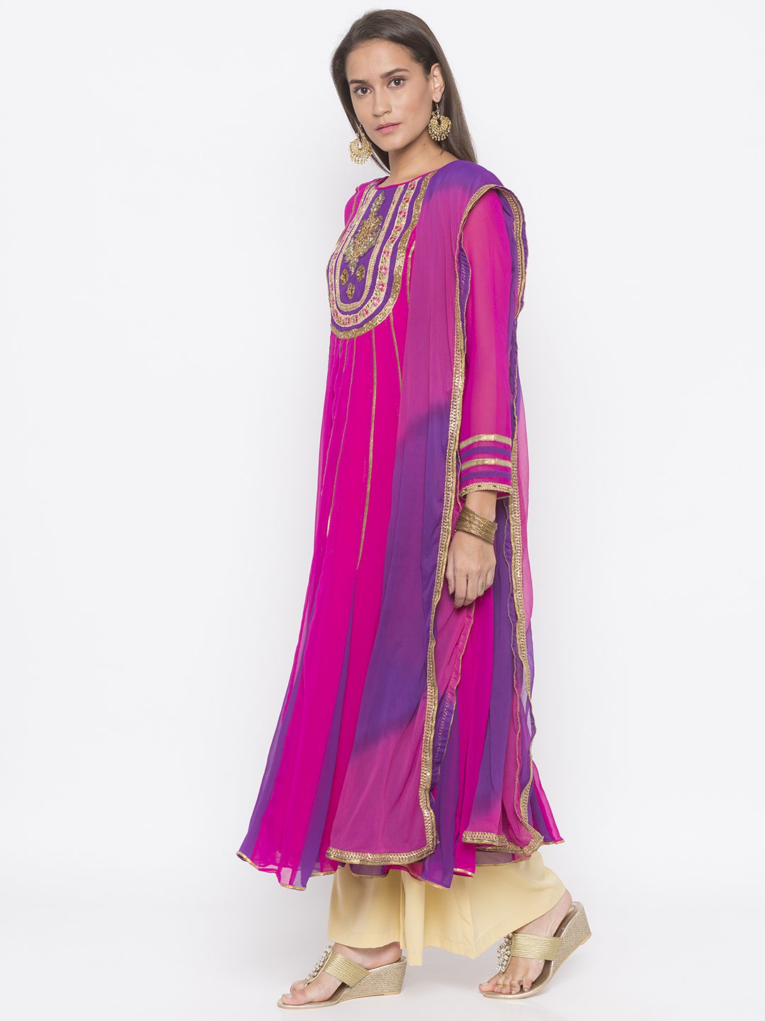 Magenta Pink Georgette Kalidar Kurta With Full Sleeves Tissue Piping Detailing On Front Kalas With Purple Contrast Fish Colours In The Front And Back Of The Hemline Bead Work Thread And Zardosi Embroidery On The Neck Yoke And Sleeves Edge With Gold Gota Patti De Tailing In The Hemline. Worn With Black Palazzos And Hot Pink Shaded Dupatta.
