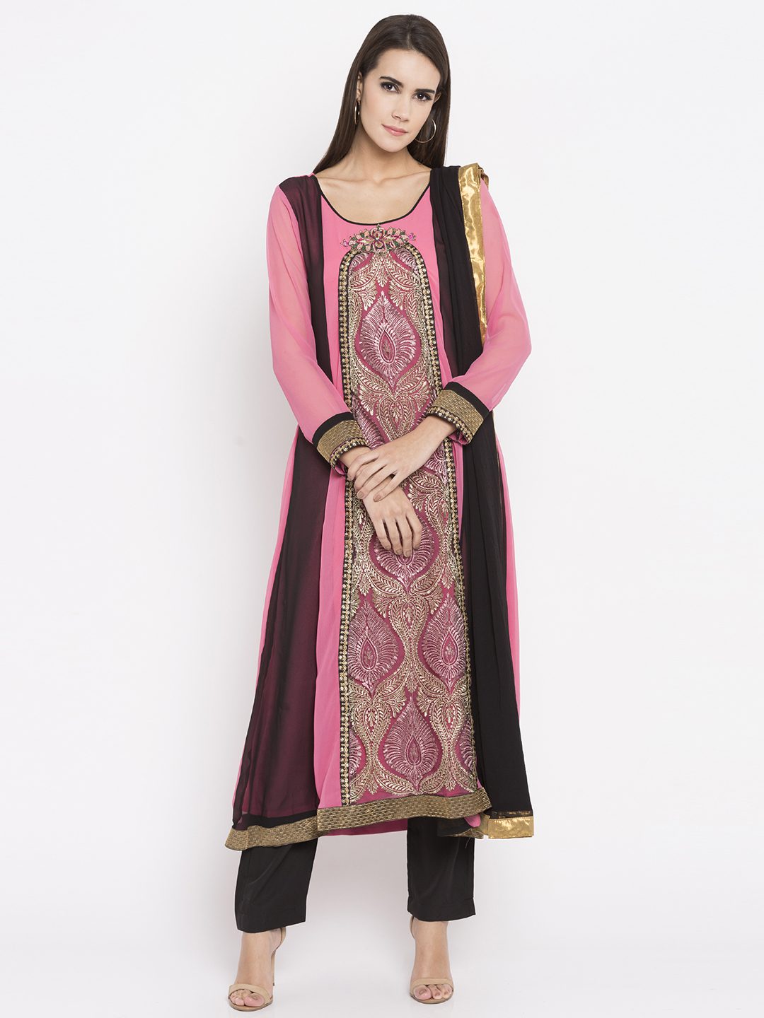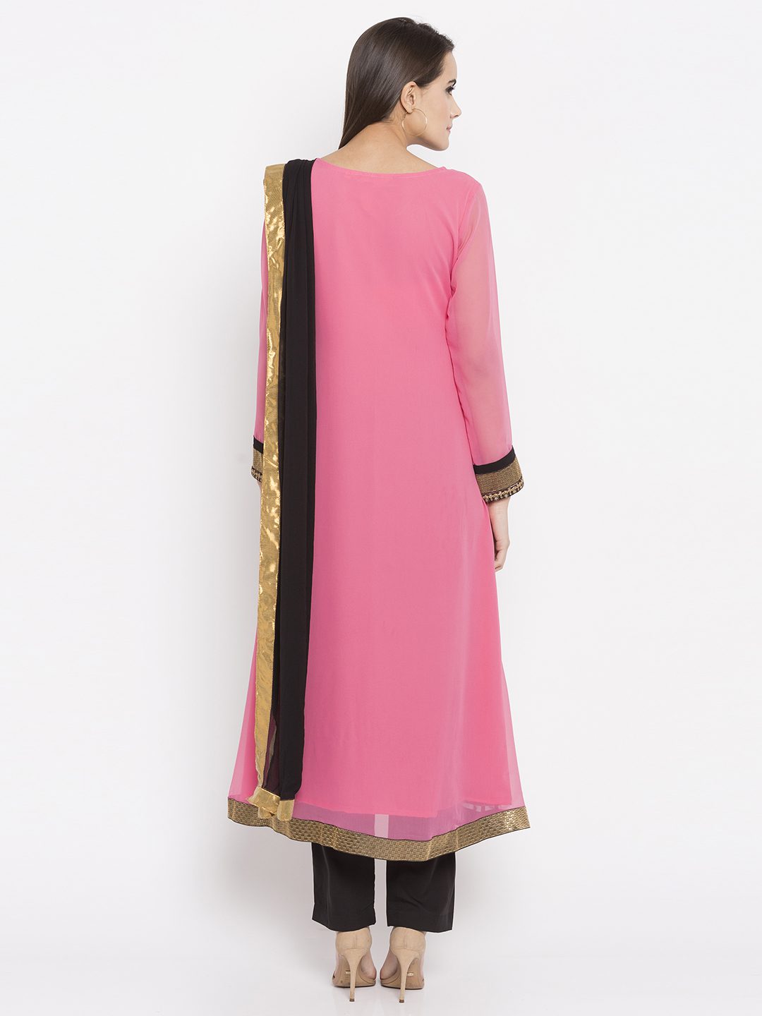 Nikhaar Creations Pink Embroidered georgette kalidar Trouser Kurta Dupatta