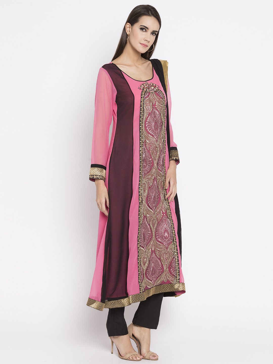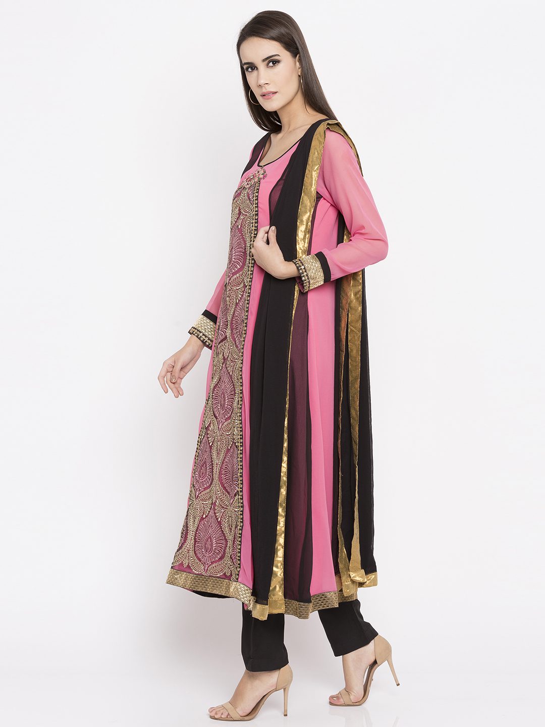 Pink Black Color Blocked Kalidaar Kurta With Embroidered Front Panel Brocade And Tissue Detailing On Sleeves And Ghera. worn with Black pants And Black Chiffon Dupatta.