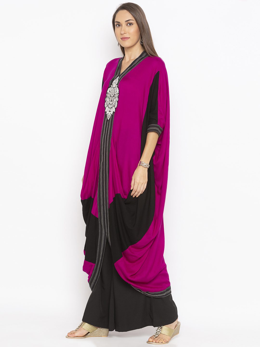 Pink Black Cotton Kaftan Style Kurta Draped On Both Sides With Black And White Stitching Detailing Running In Front Panel Going At The Sides And On Two Toned Semi Three Quarter Sleeves Embroidered Motif Below Neck Worn With Black Palazzos.
