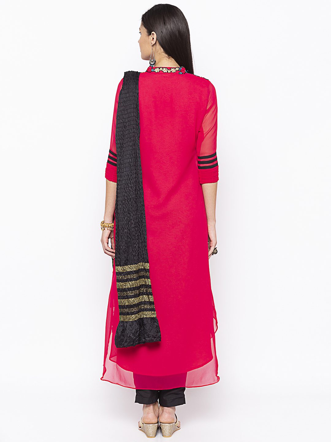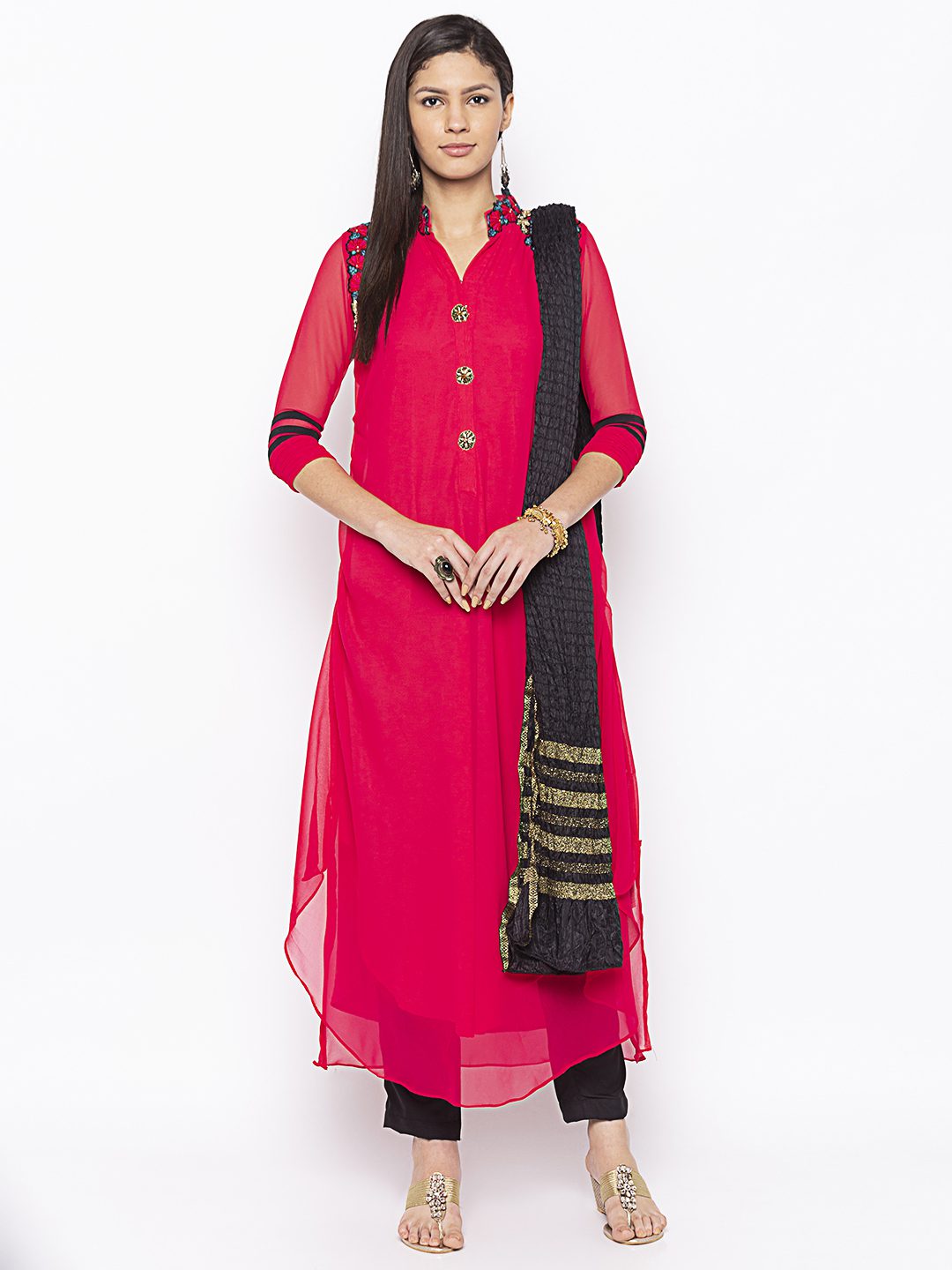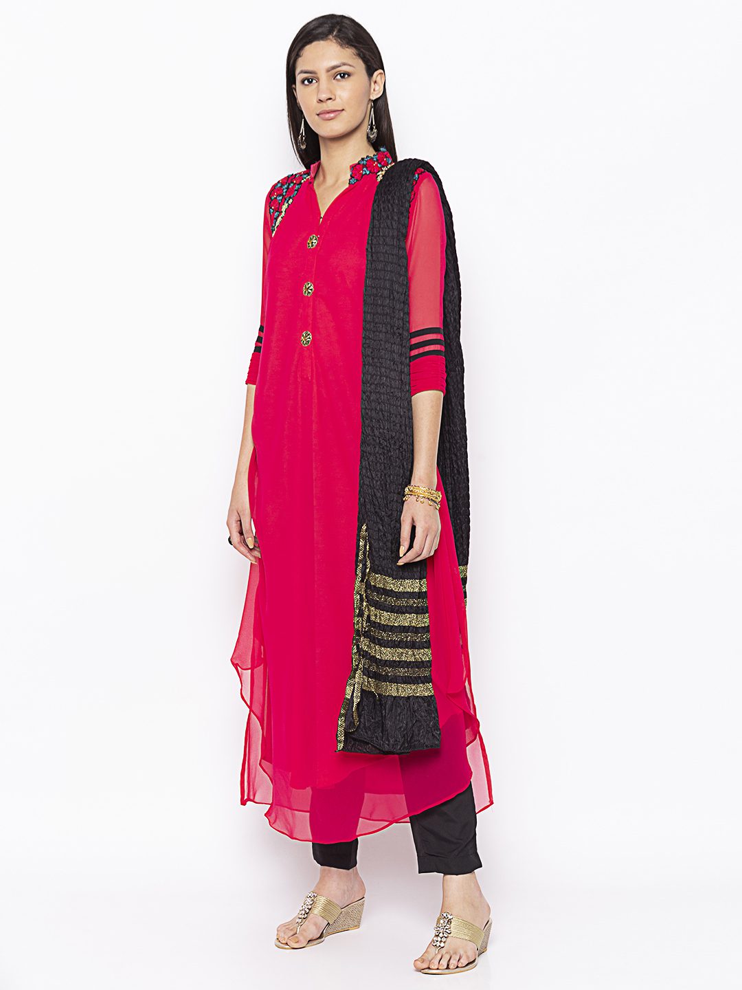 Coral Pink Georgette Slight Gathered On Both Sides Asymmetrical With A Curved Hem Line Kurta With Embroidery Around Collar Shoulders Having Three Quarter Sleeves With Gathers Of Self And Black Detailing On It With Embroidered Button Detailing Below Neckline. Worn with Black Cigarette Pants and Black Embellished Dupatta.
