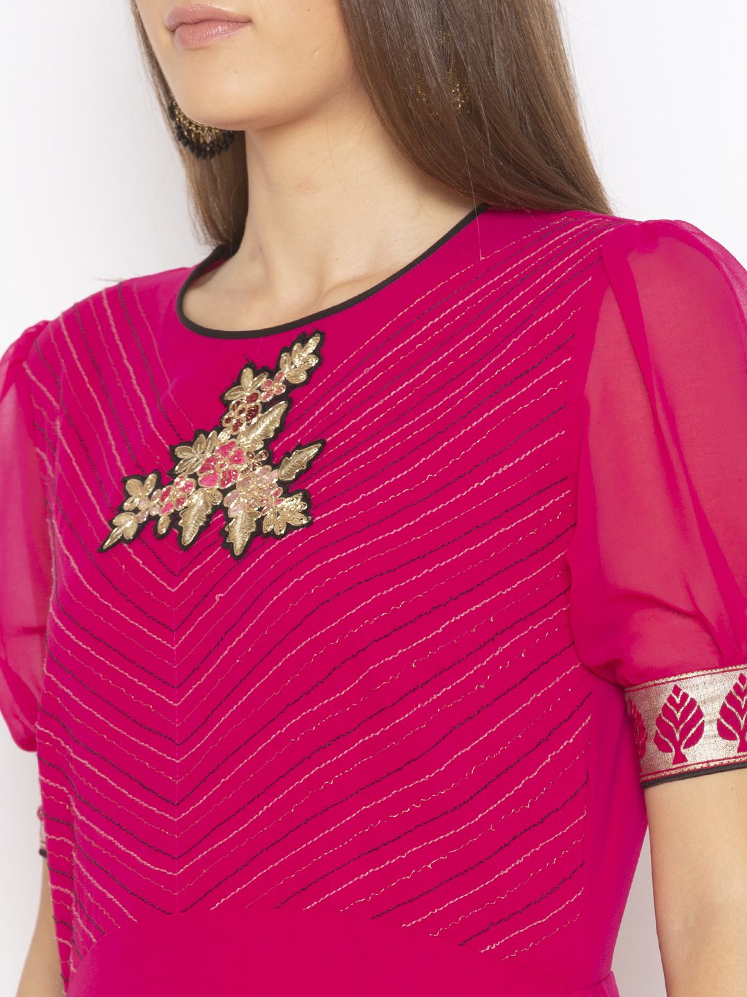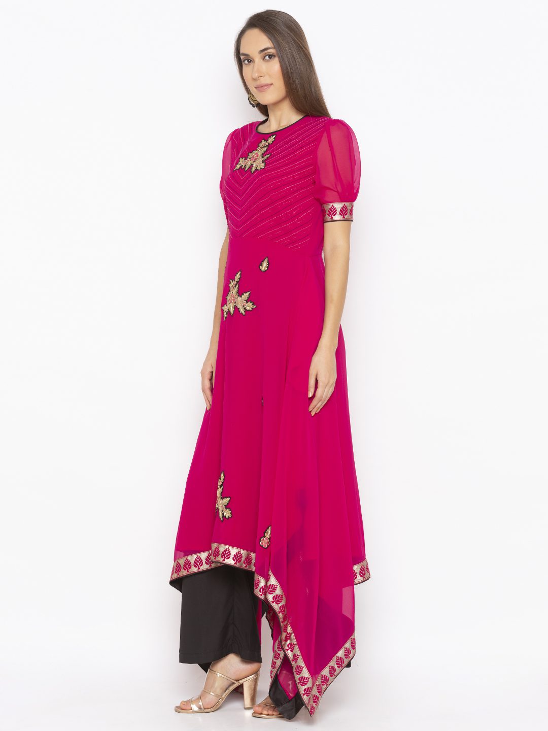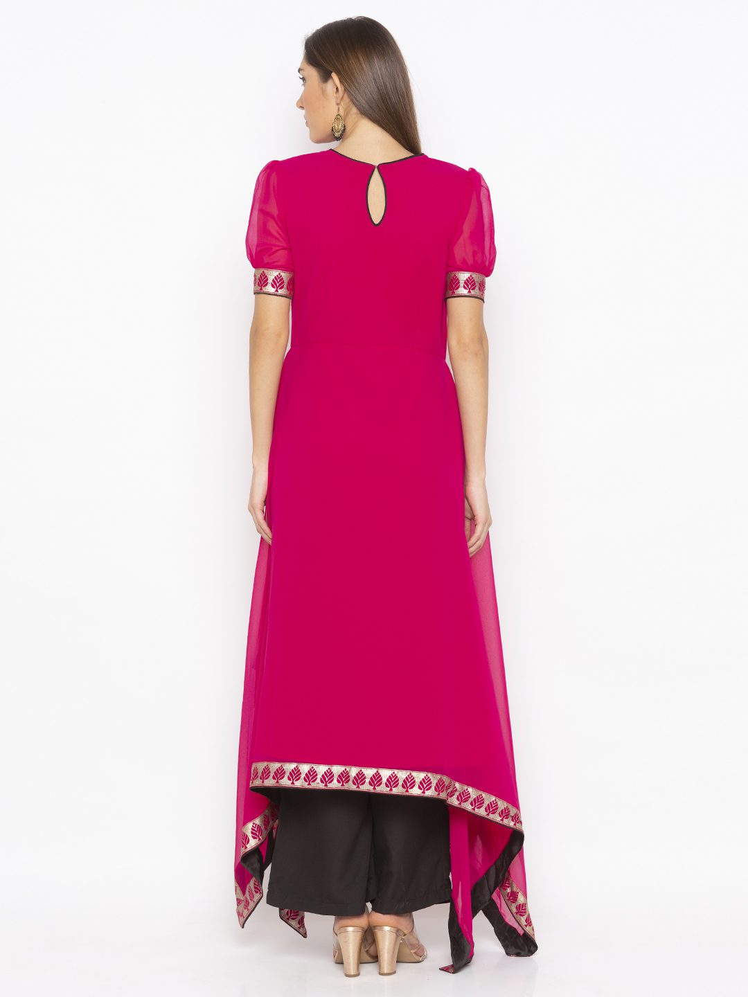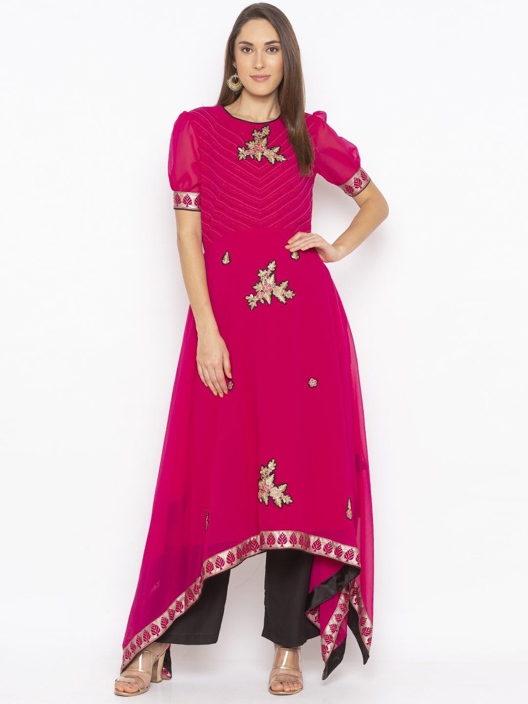 Rani Pink Georgette Asymmetrical Long Kurta With Thread Nad Zari Embroidered Detail On Upper Body… Elbow Length Sleeves Gathered With Fitted Printed Cuff At Sleeves Edge.Printed Border On The Asymmetrical Hemline With Embr Of Resham And Zari In The Front..And Peek A Boo Neckline At The Back With Black Piping Around It. Worn With Black Parallel Pants.