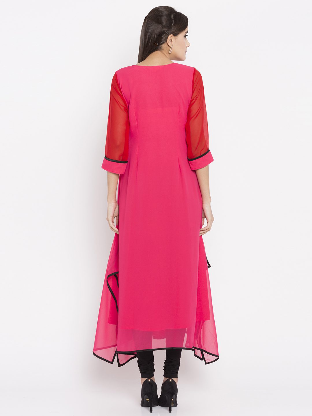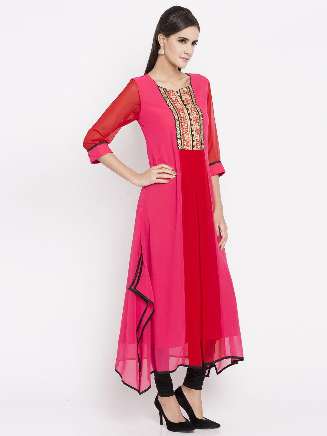 pink georgette readymade quarter sleeves asymmetrical kameez designed with rich embroidery detailing at the neckyoke including beads and sequins work. As shown, it comes along with a black crape churidar.