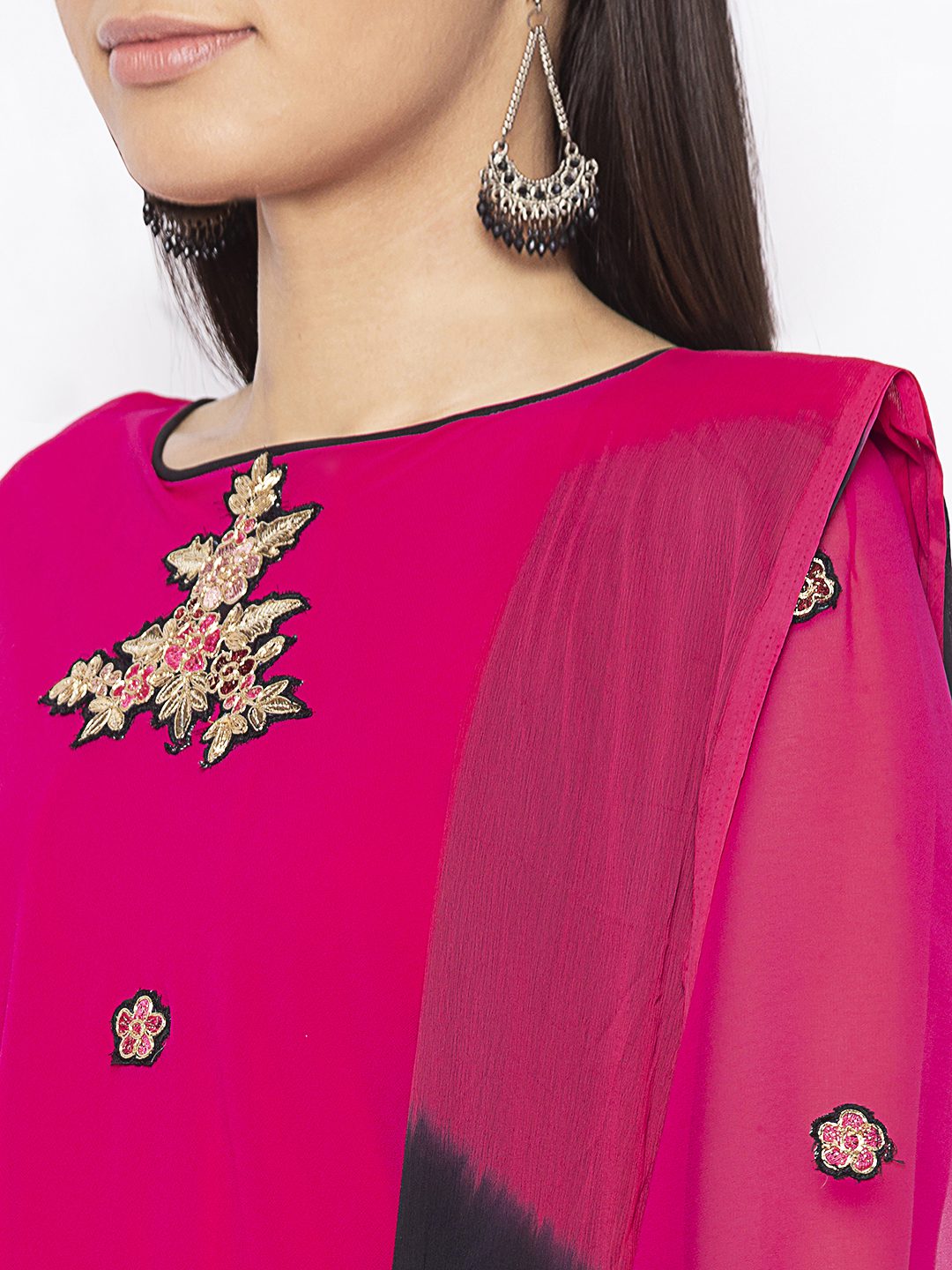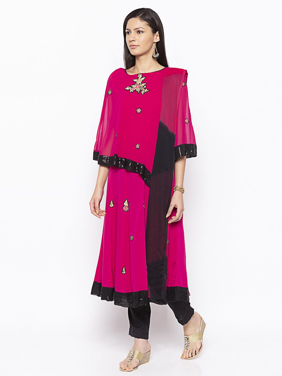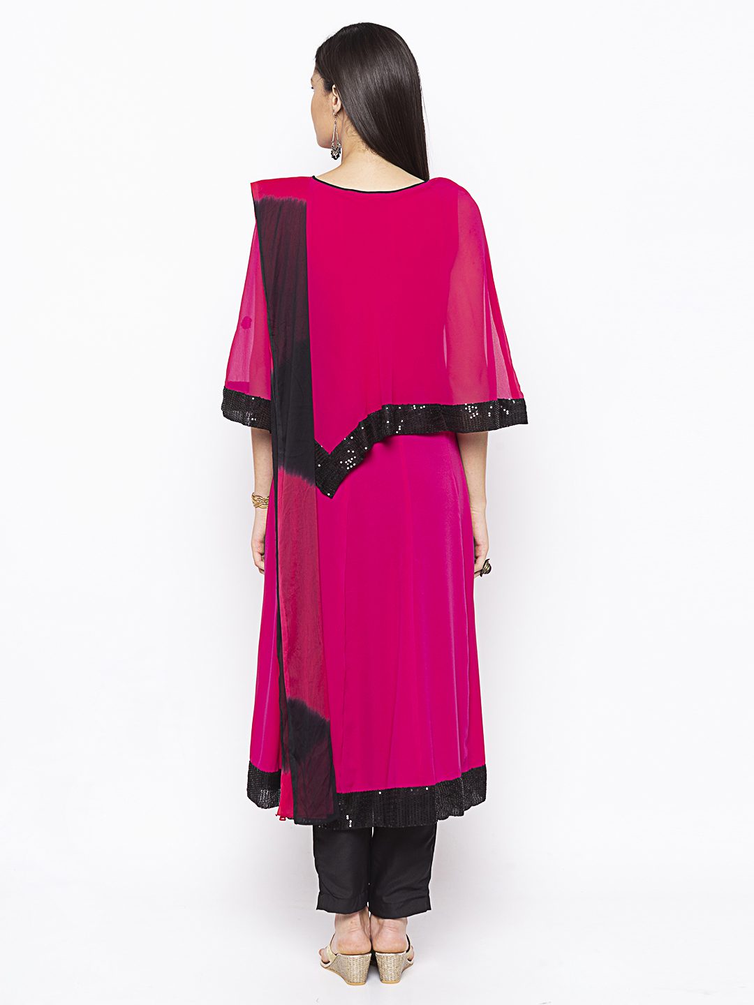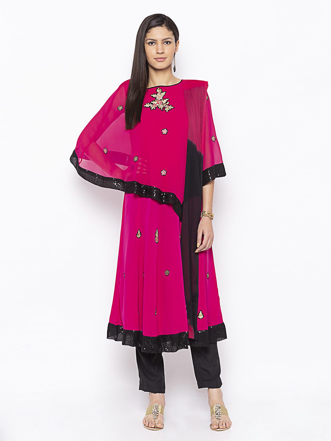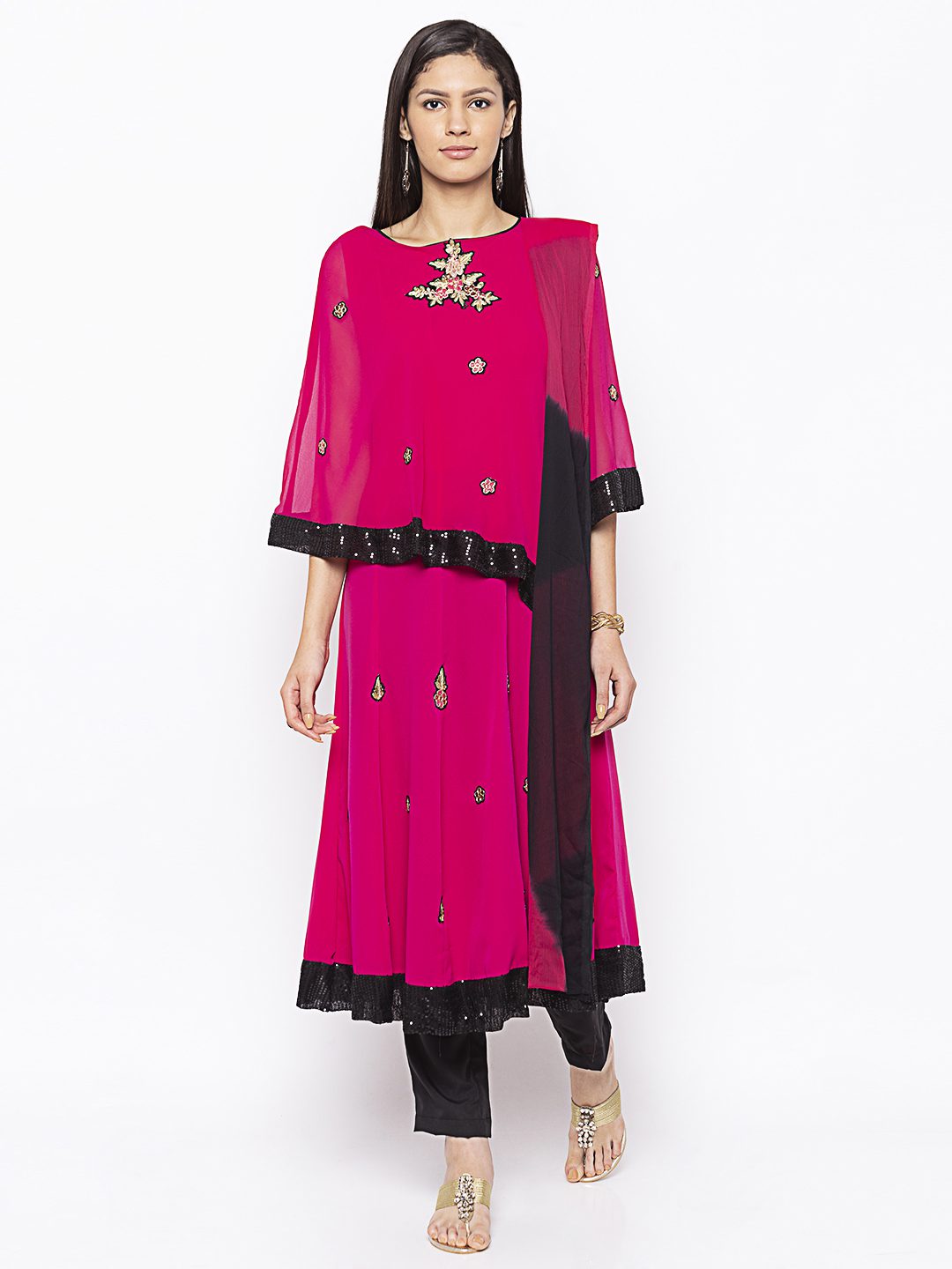 Magenta Pink Georgette Cape Over American Crepe Kalidar Kurta With Black Sequence Detailing On Cape Edges And Hemline Of Kalidar With Gold Embroidery All Over In The Cape And Kurta Worn With Black Cigarette Pants And Black Pink Shaded Chiffon Dupatta.