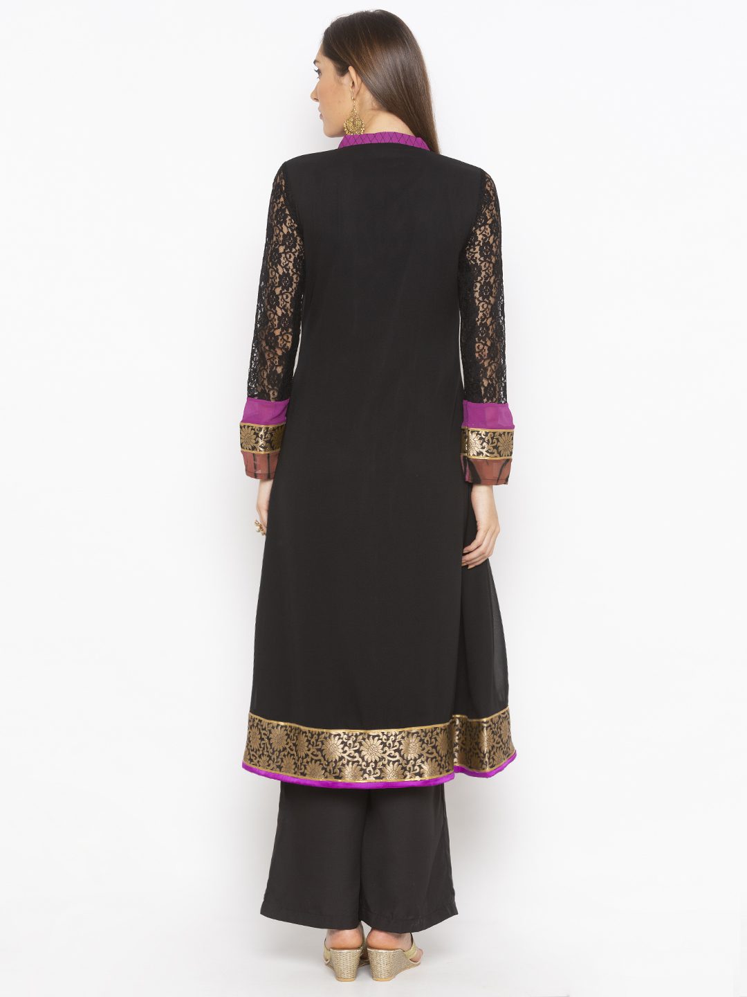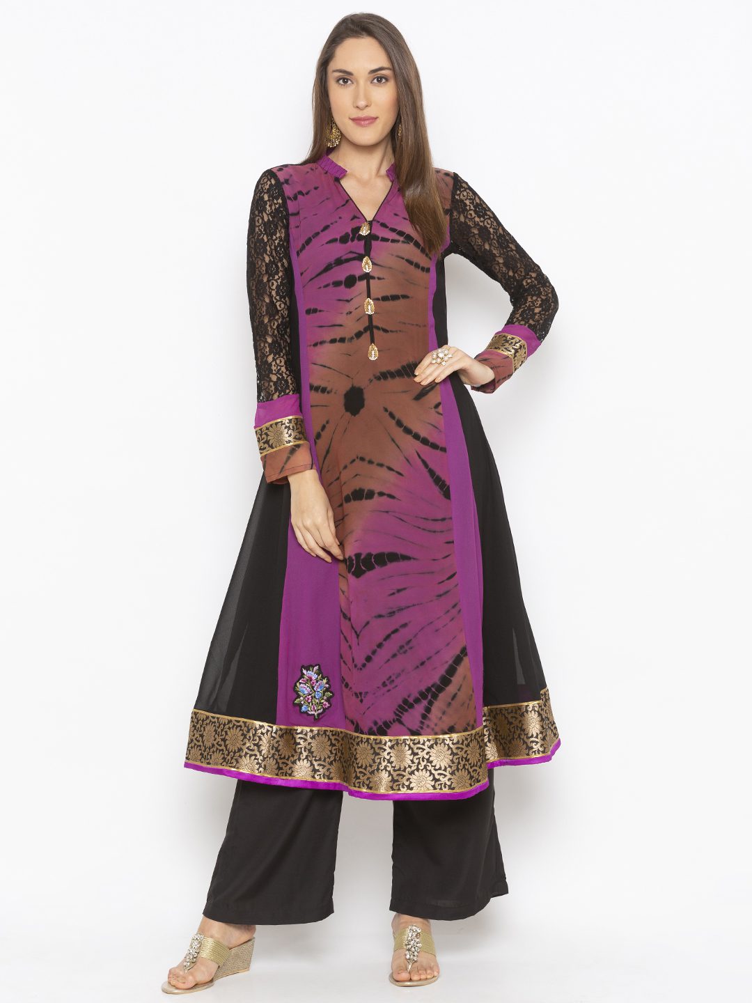 Purple Black Tie Dye Batik Style Shaded Kalidar Kurta With Black Lace Piece Full Sleeves With Embroidered Buttons And Motifs And Brocade Border With Detailing In Ghera And Chinese Collar.Worn With Black Parallel Pants.