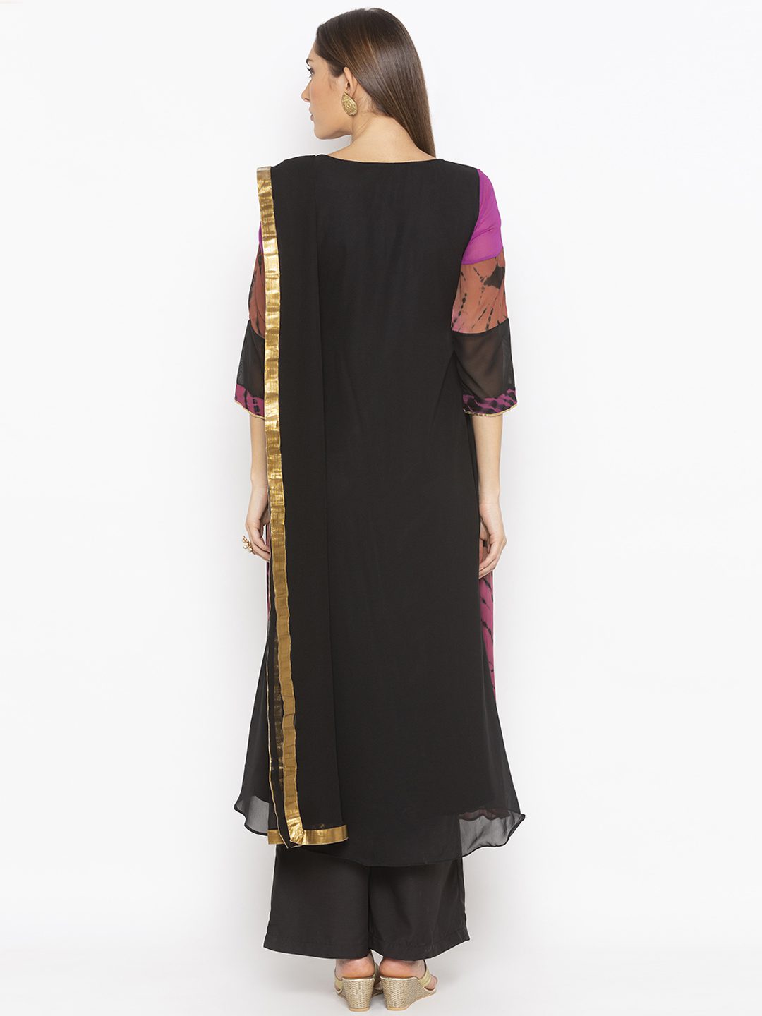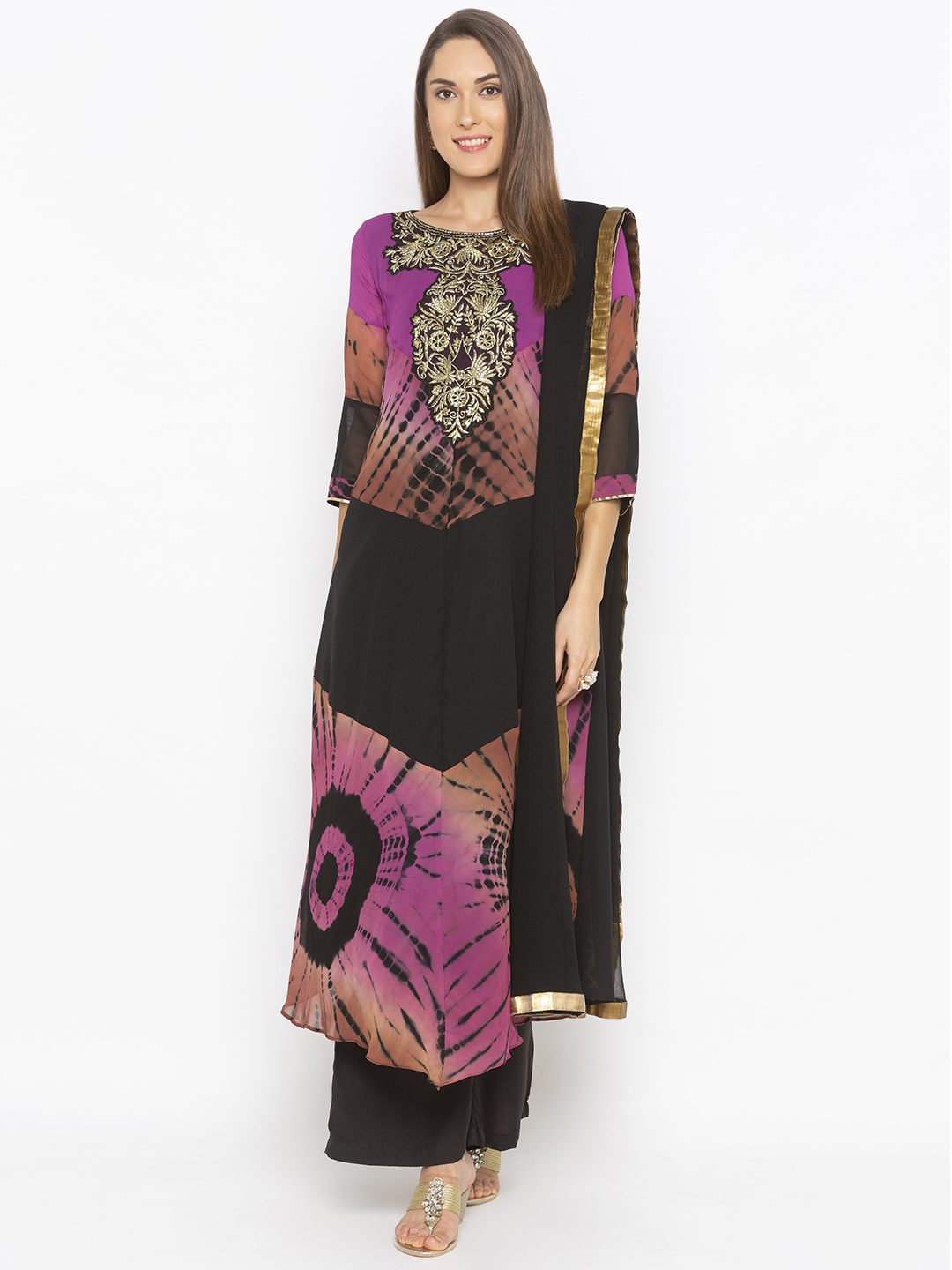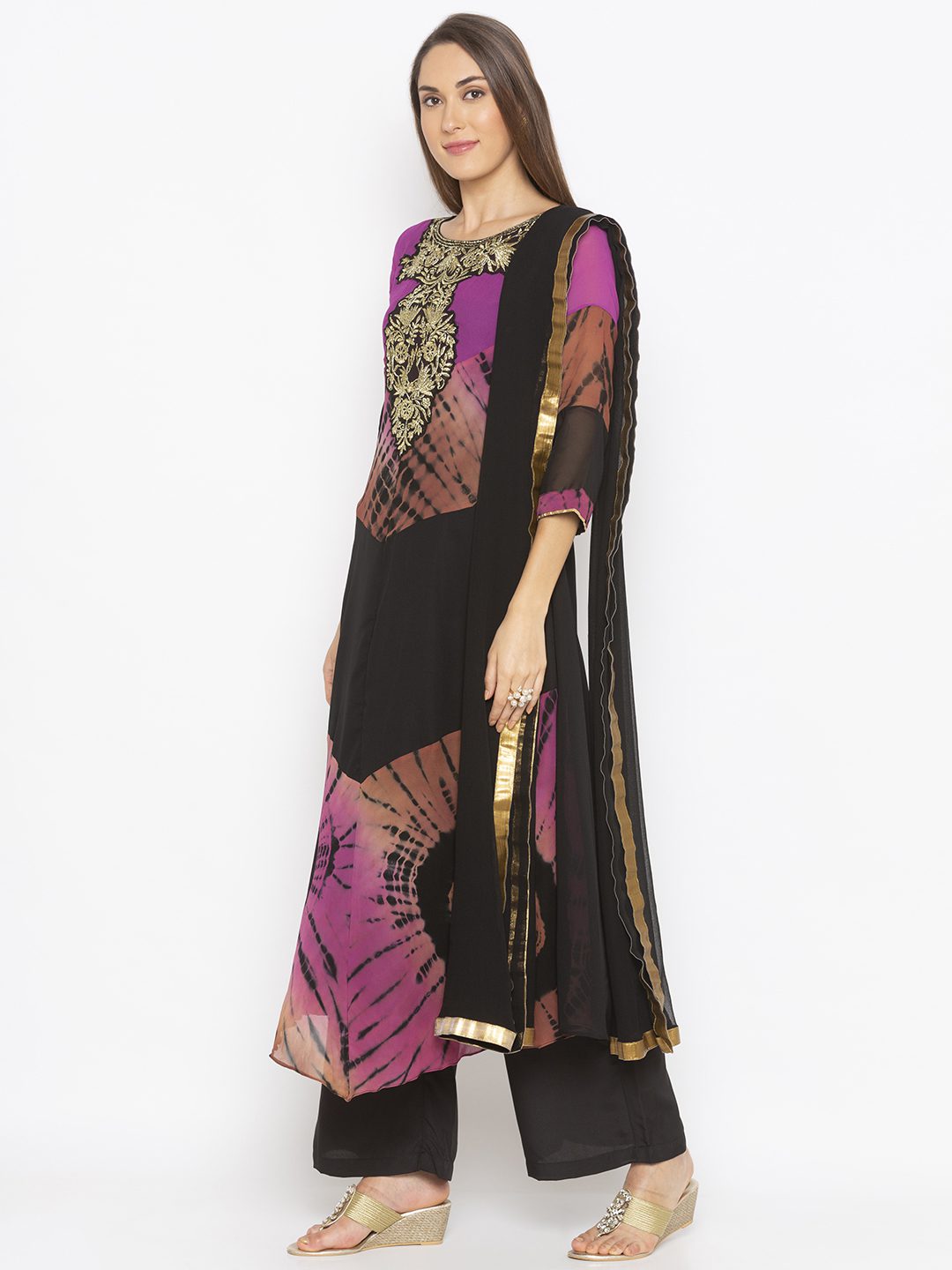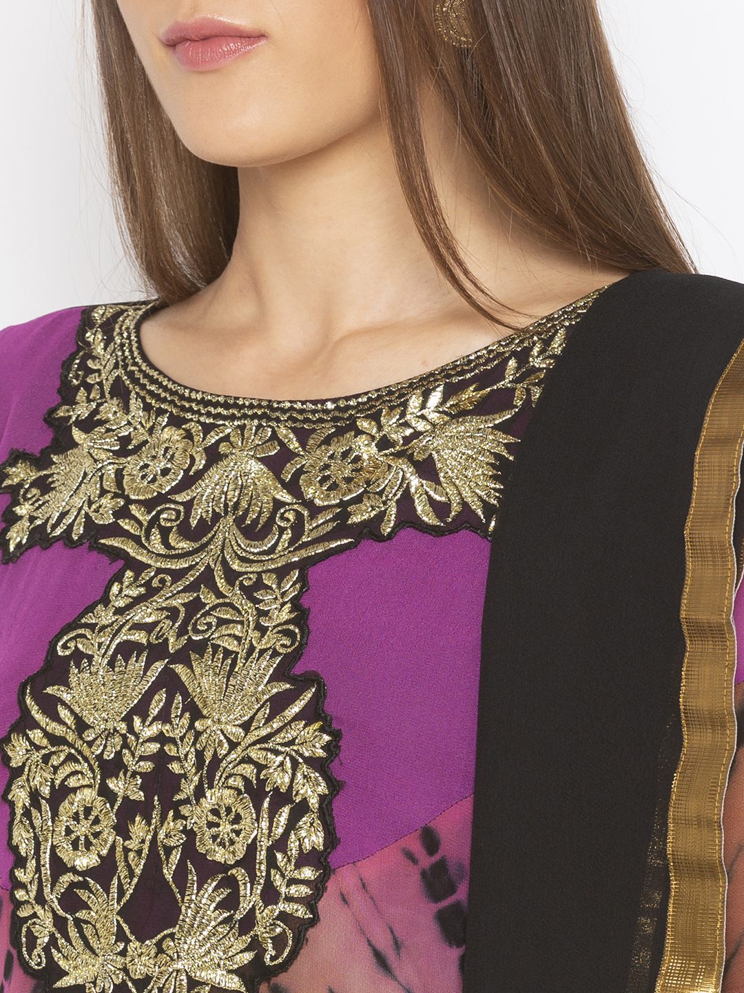 Purple Rust Tie-Dye Shaded And Black Plain Georgette A Line Kurta With Embroidery On Neckline With Print And Tissue Detailing On Three Quarter Sleeves.Worn With Black Culottes And Black Chiffon Dupatta.