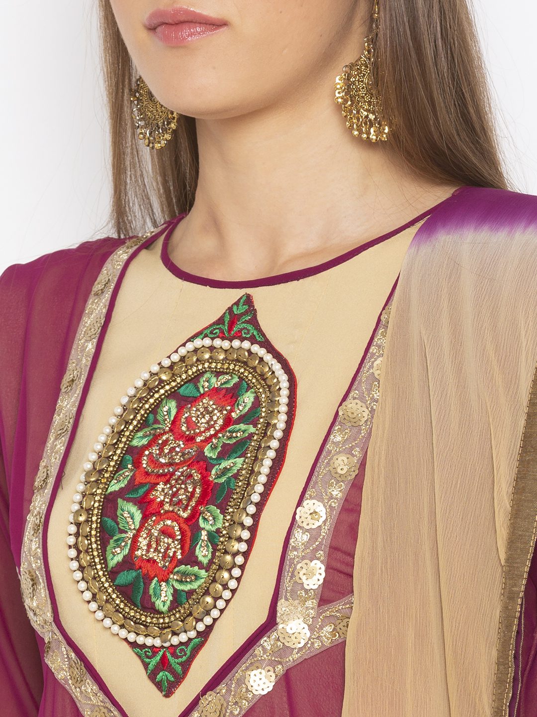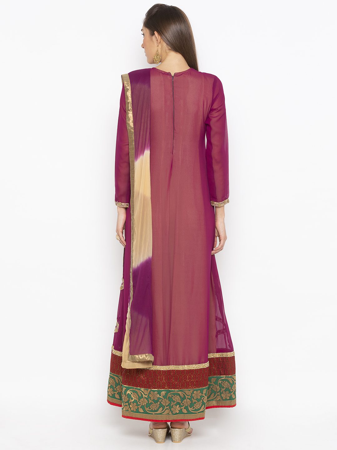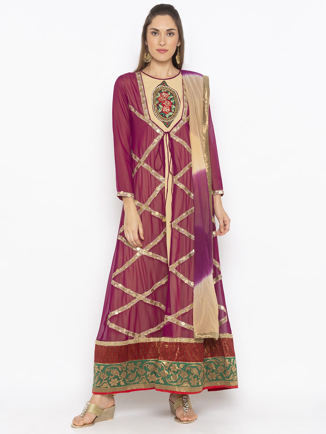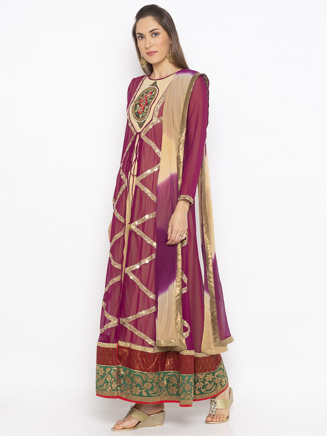 Violet Georgette Full Length Jacket With Embroidery Border Detailings On Entire Front And Sleeves Edge Pearls Embroidery Border On Hemline With Two Colour Brocade On Hemline Having Bhej Flared Lining Of American Crepe With Hand Embroidered Motif On Neckline. Worn With Beige Cigarette Pants And Violet Beige Shaded Dupatta With Borders On All Sides.