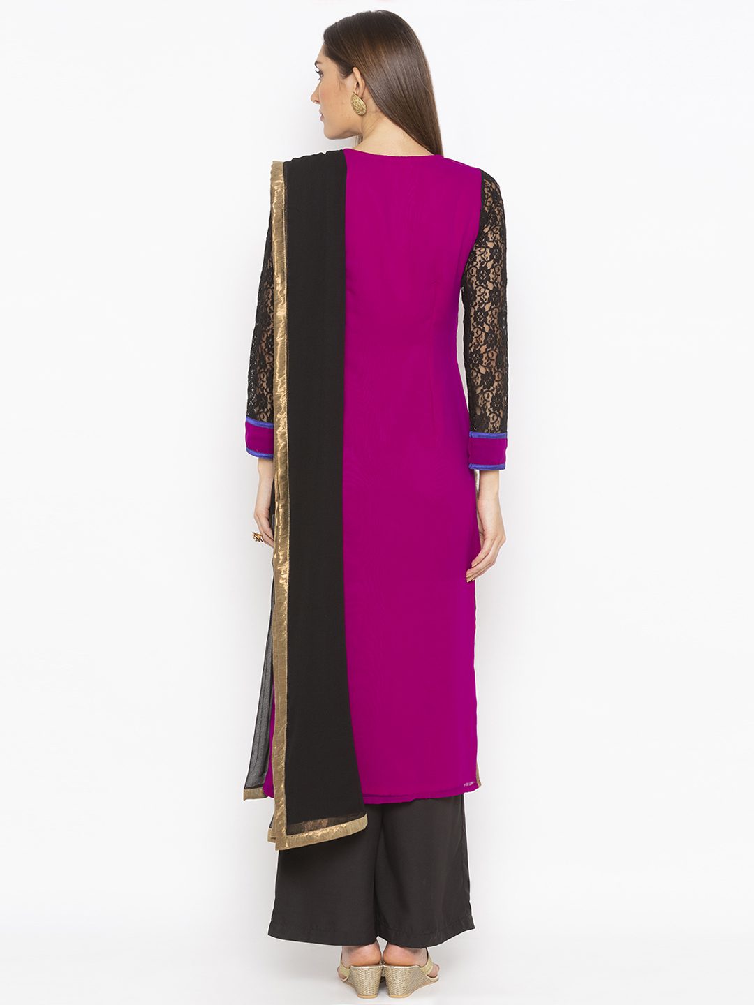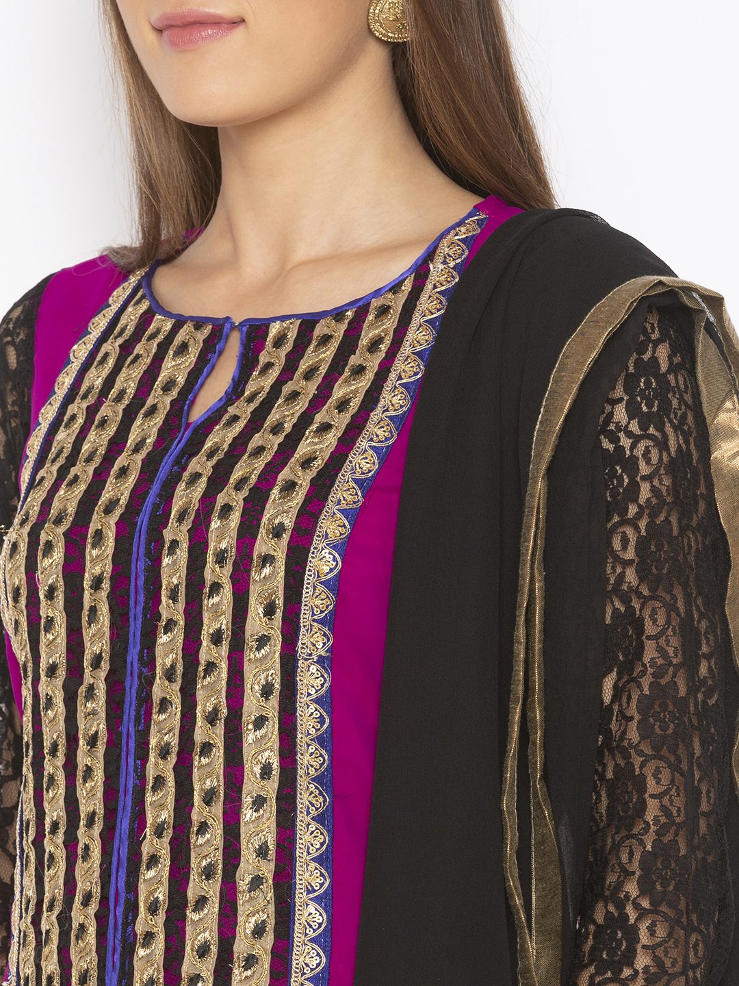 PurpleĀ Georgette Straight Cut Kurta With Heavy Embroidered Yoke Purple Contrast Piping On Yoke And Three Quarter Lace Net Sleeves And Detailing Of Embroidery Lace Tissue And Print In Hemline And Side Slits Worn With Black Culottes Black Chiffon Dupatta With Gold Borders On It.
