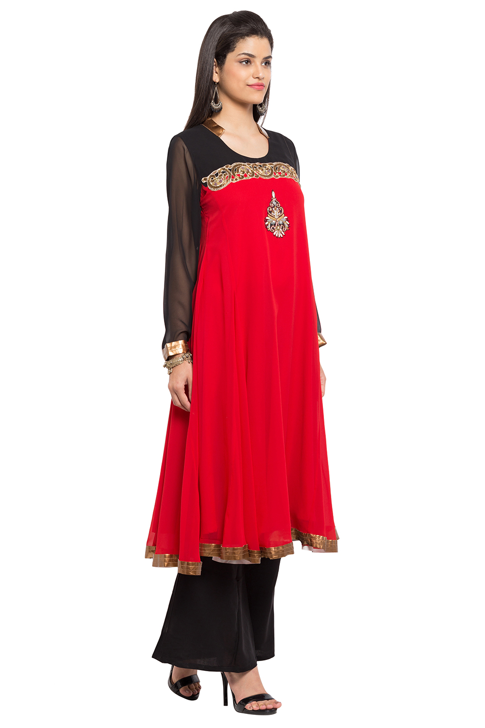 Red Black Kalidar Kurta With Hand Embroidery On Empire Line And Motif With Detailing In Hemline.