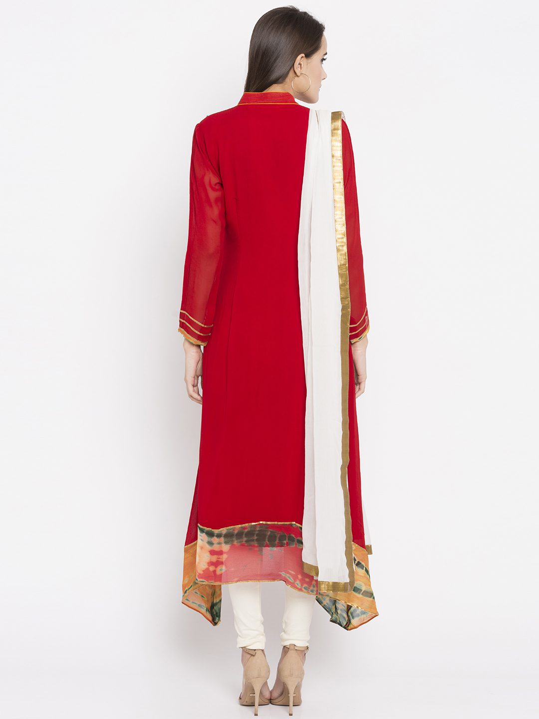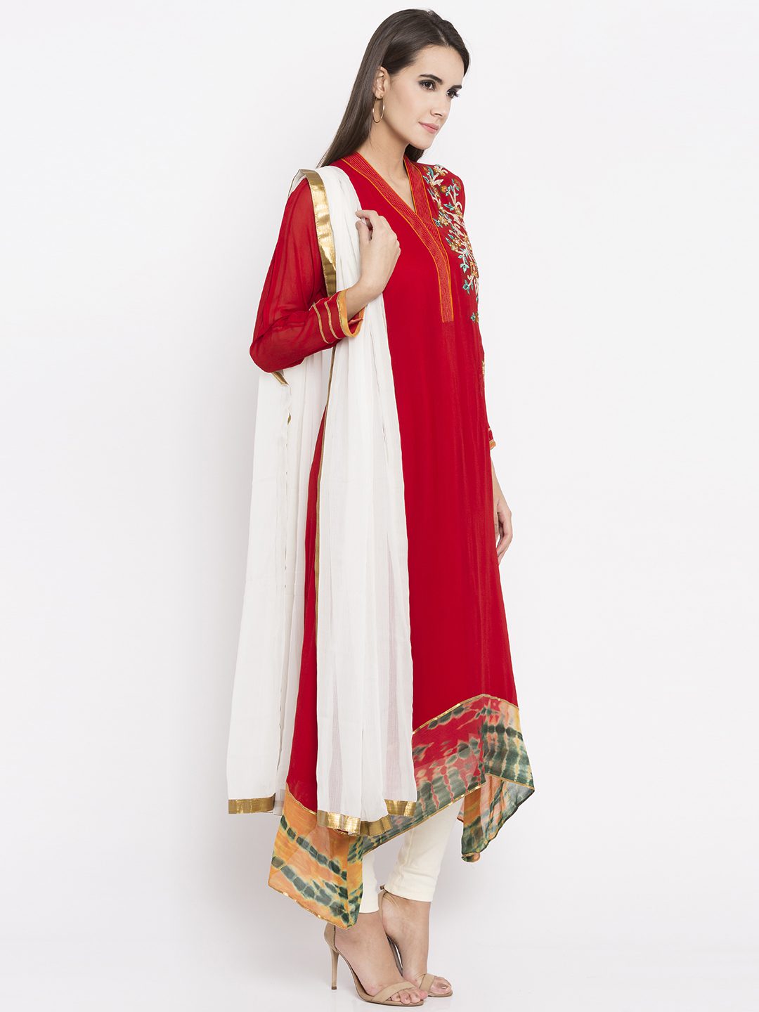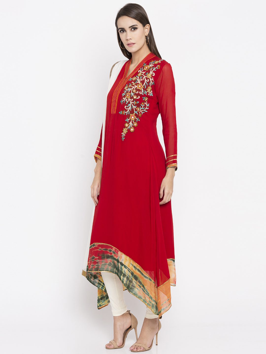 Red asymmetrical readymade kameez in georgette designed with striking resham and beads embroidery work enhanced by shibori print on the hemline.worn with white churidar And white chiffon Dupatta.