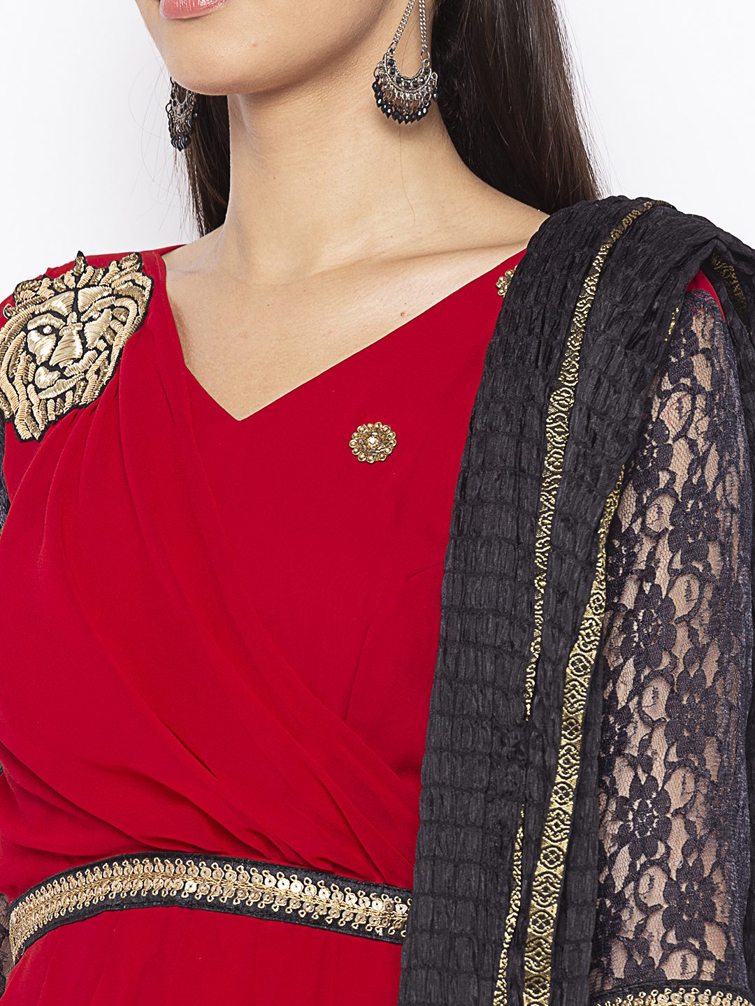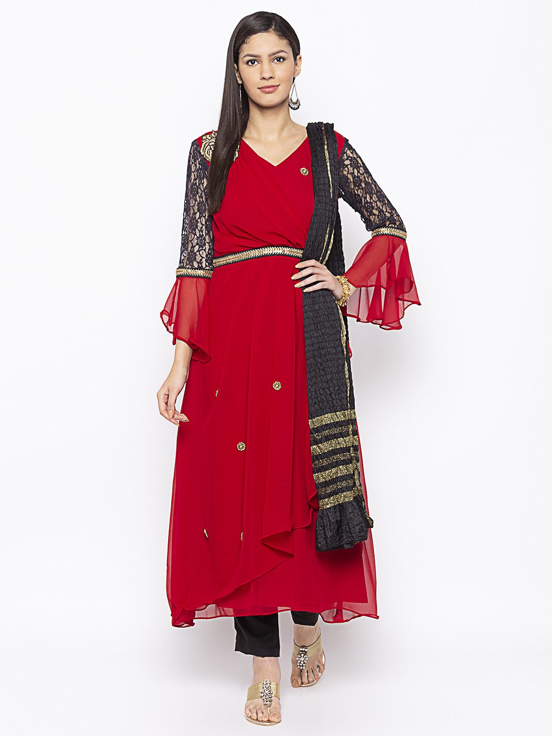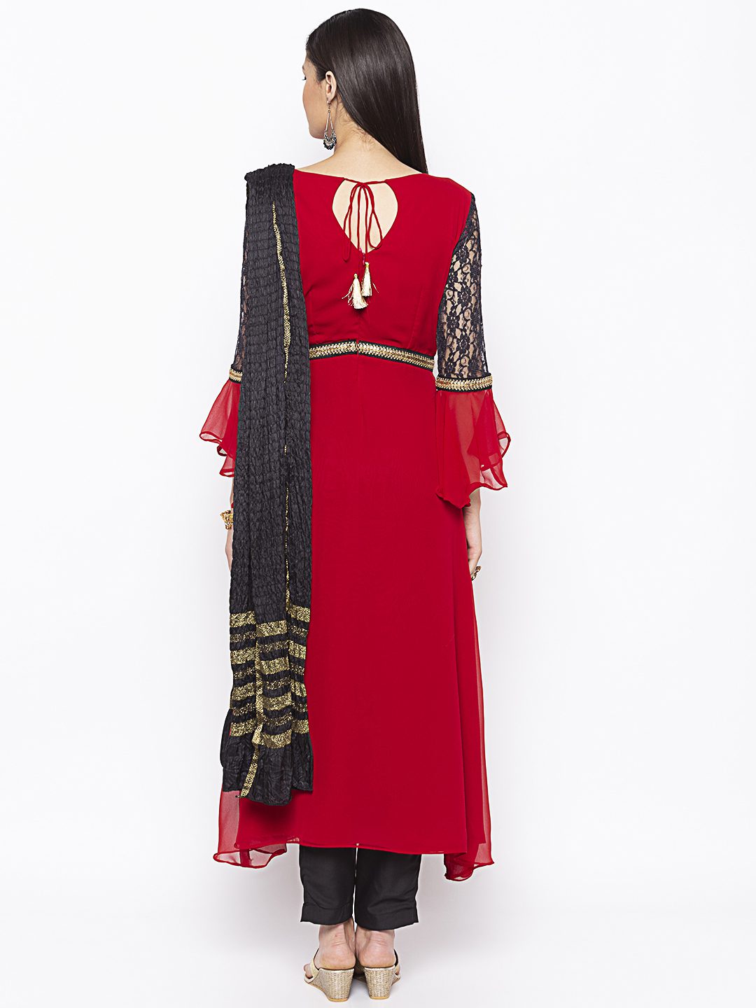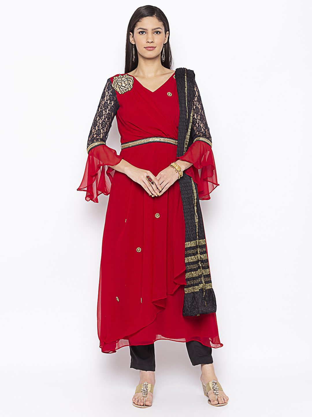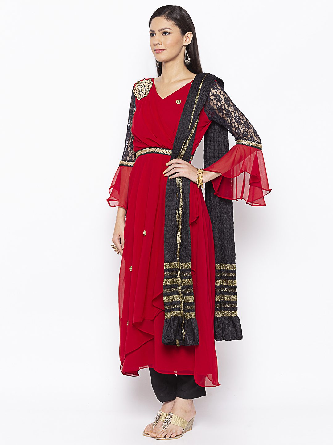 Reddish Maroon Georgette Asymmetrical Double Layered Long Kurta With Black Semi Bell Net Lace Sleeves Hand Embroidery On The Front With Black Gold Embroidered Border On Body And Sleeves. Paired With Black Cigarette Pants And Black Dupatta.