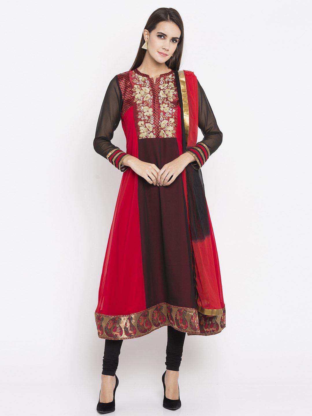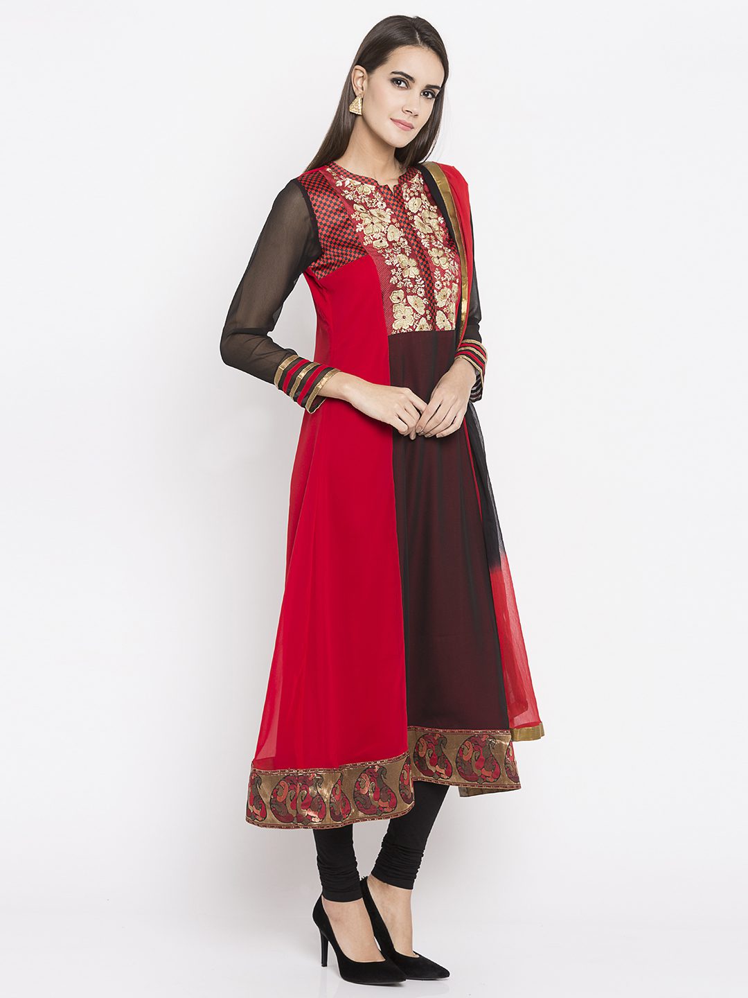 Red & Black georgette readymade full sleeves kalidar kameez designed with rich zari embroidery detailing at the neckyoke including stone & sequins work. worn with Black Churidar And Red Black Shaded Dupatta.