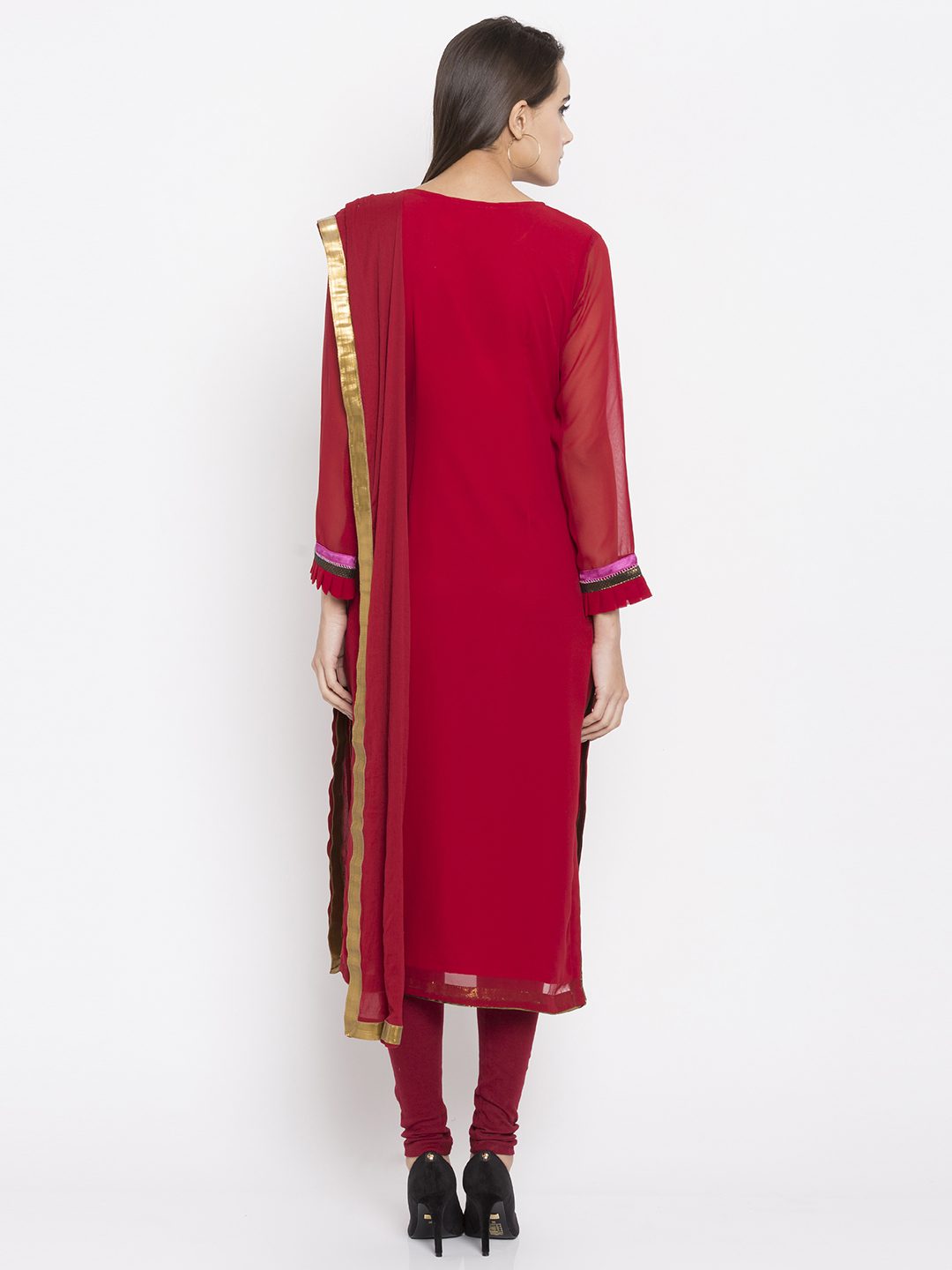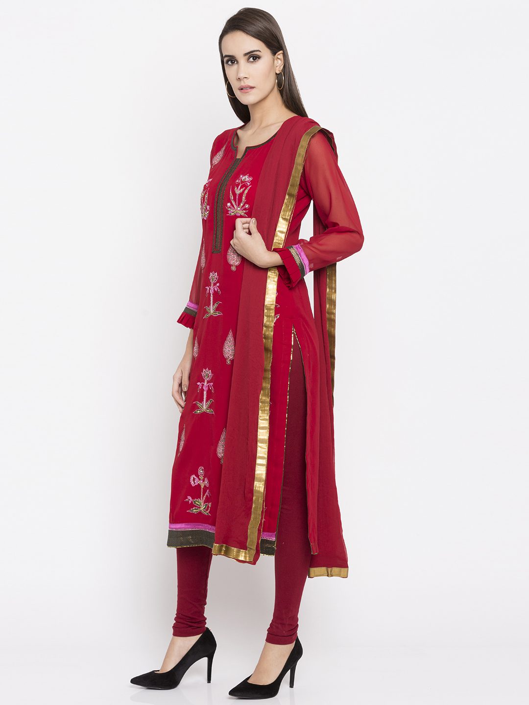 Red straight cut readymade kameez in georgette designed with striking hand embroidery motifs all over enhanced by brocade woven detailing at the hemline and neck.worn with red churidar And red chiffon Dupatta.