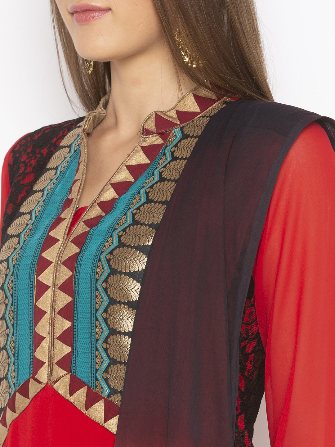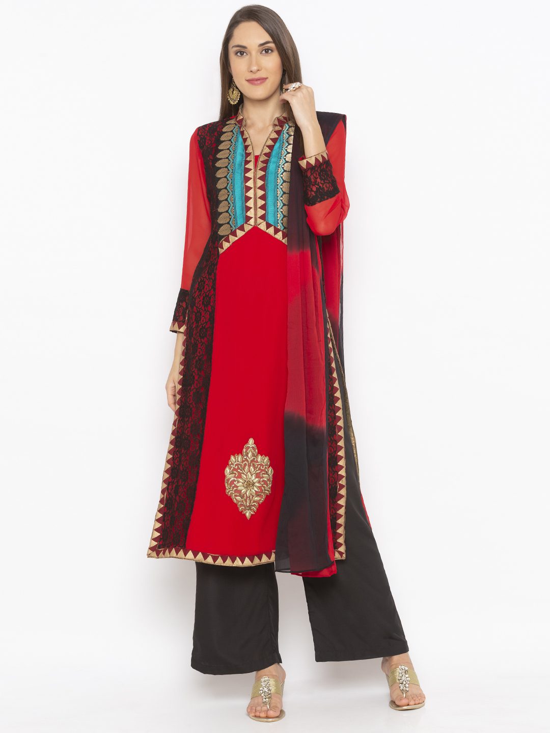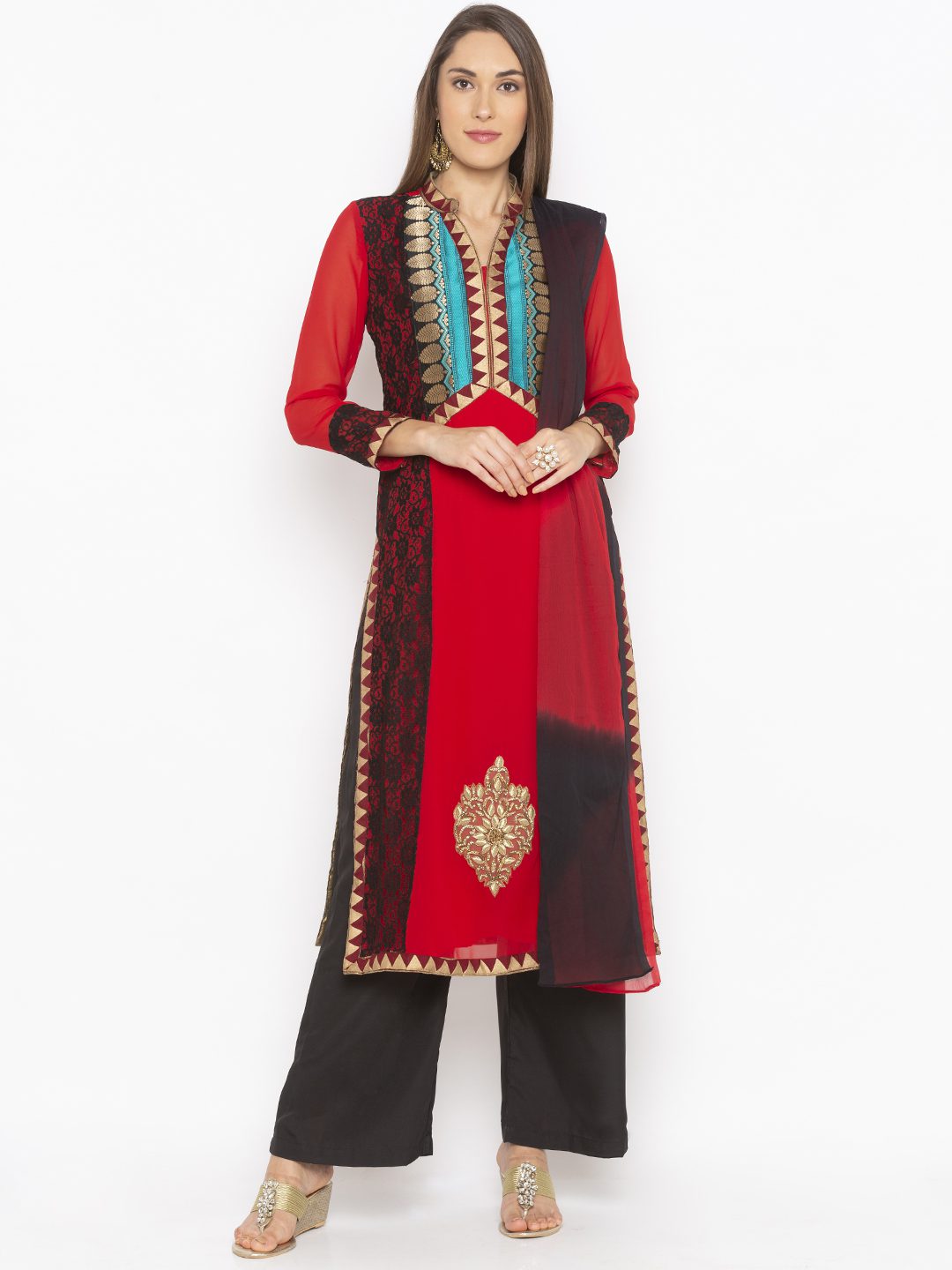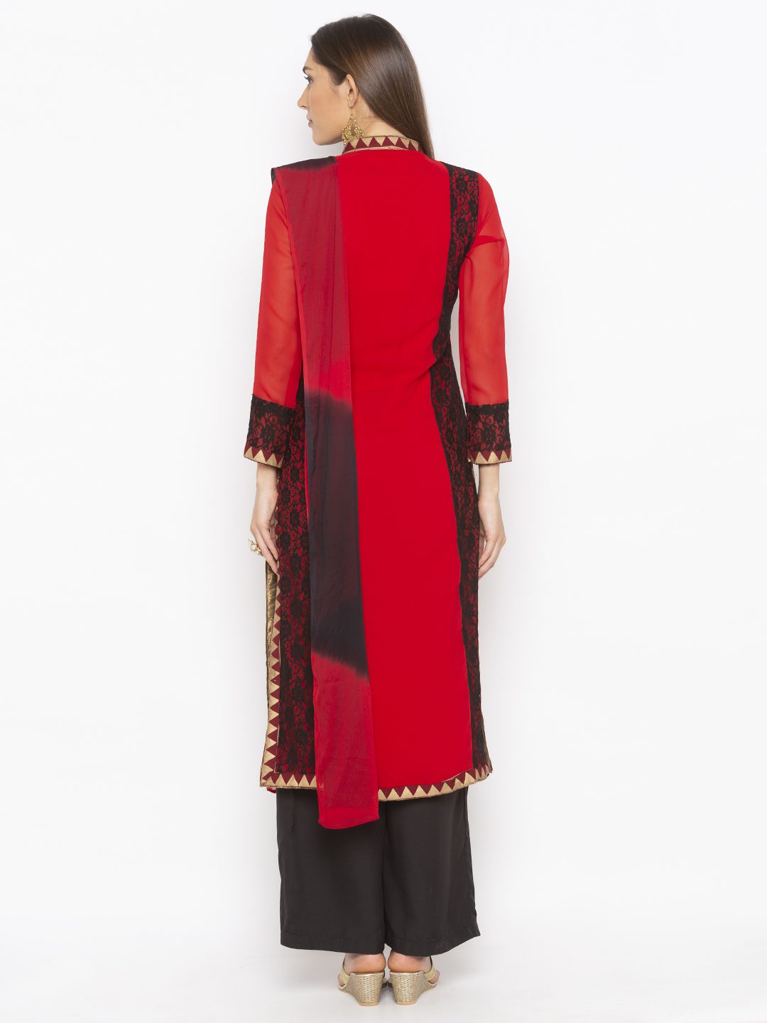 Red Georgette Straight Cut Kurta With Black Lace Detailing On Side Panels And Full Sleeves..Gold Brocade Yoke With Maroon Border Detailing On Yoke.. Full Sleeves Edge ..Side Slits And Hemline With Embroidered Motif In Hemline Worn With Black Qlots And Shaded Red Black Dupatta With Gold Border On It.