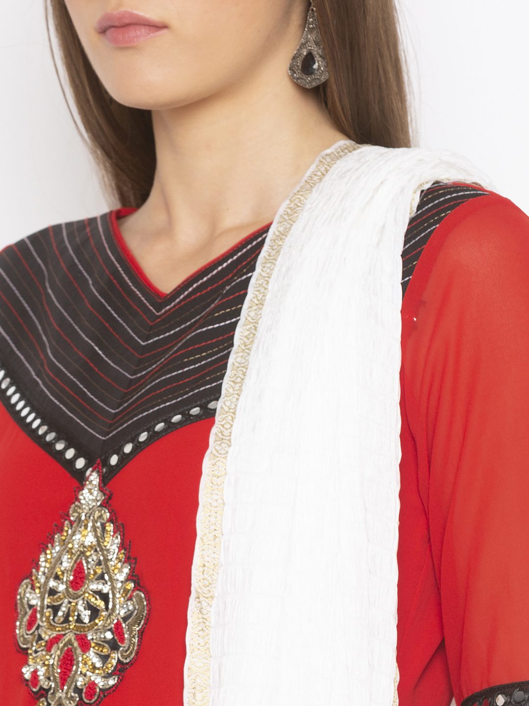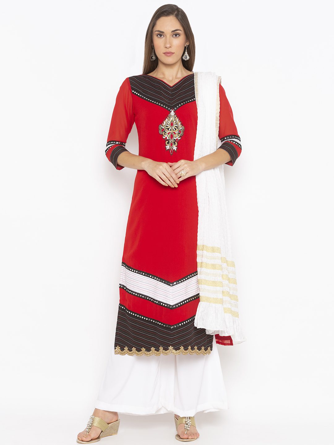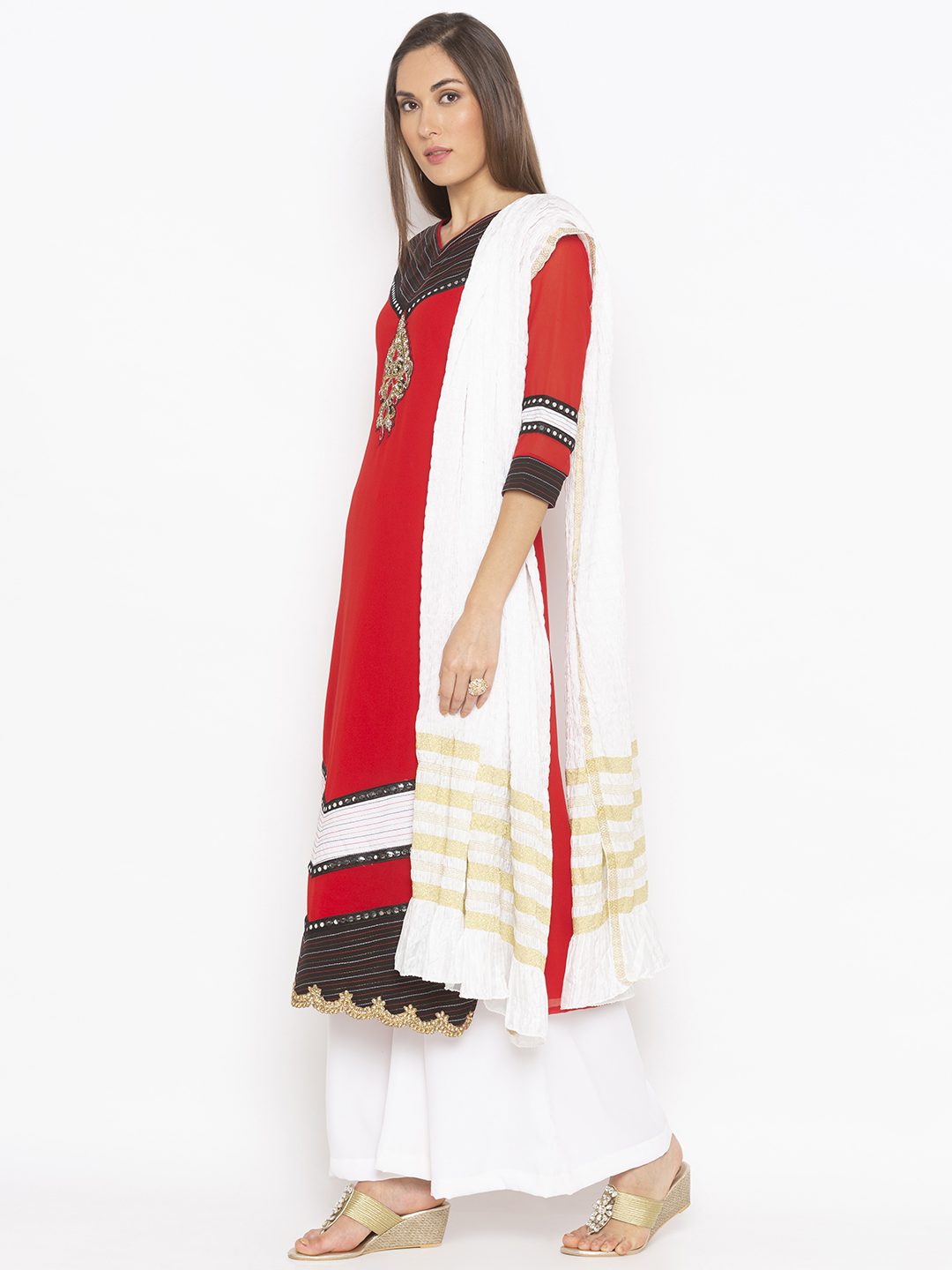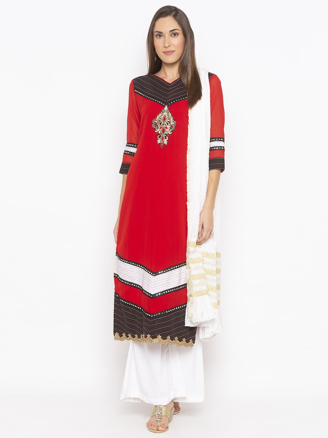 Red Straight Cut Georgette Kurta With Black And White Contrast Detailing Around Neck And Hemline And Three-Quarter Sleeves With Mirror Embroidered Border Around It… Antique Gold Diamond Hand Embroidered Motif Below Neck With Embroidered Gold Border In Hemline. Worn With White Palazzo And White Gold Crushed Silk Dupatta.