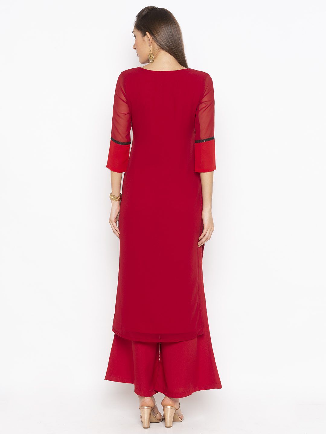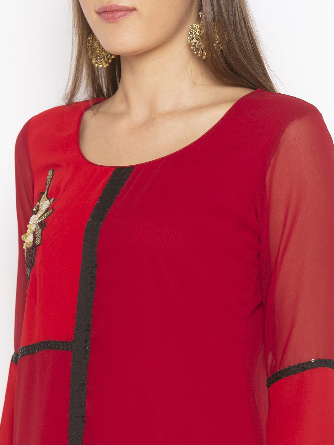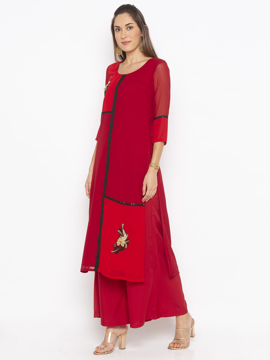 2 Coloured Red And Maroon Georgette Straight Cut Panelled Kurta.. Three Quarters Sleeves With Black Sequence Detailing At Panel Edges Hand Embroidery On Neckline And Hemline Worn With Red Pallazos.
