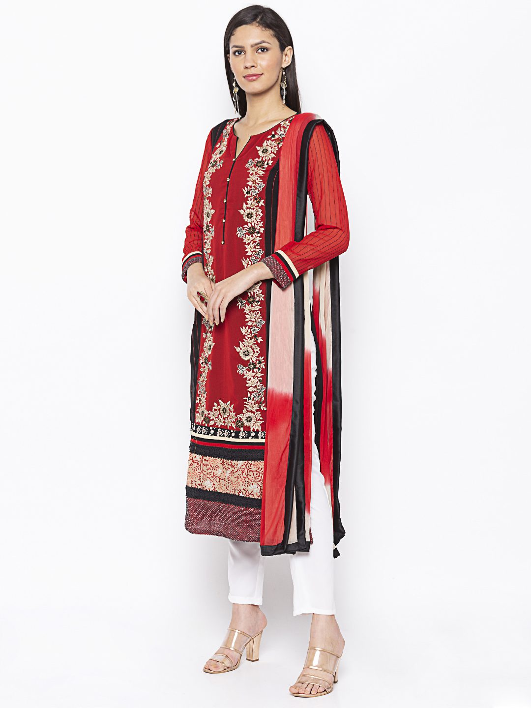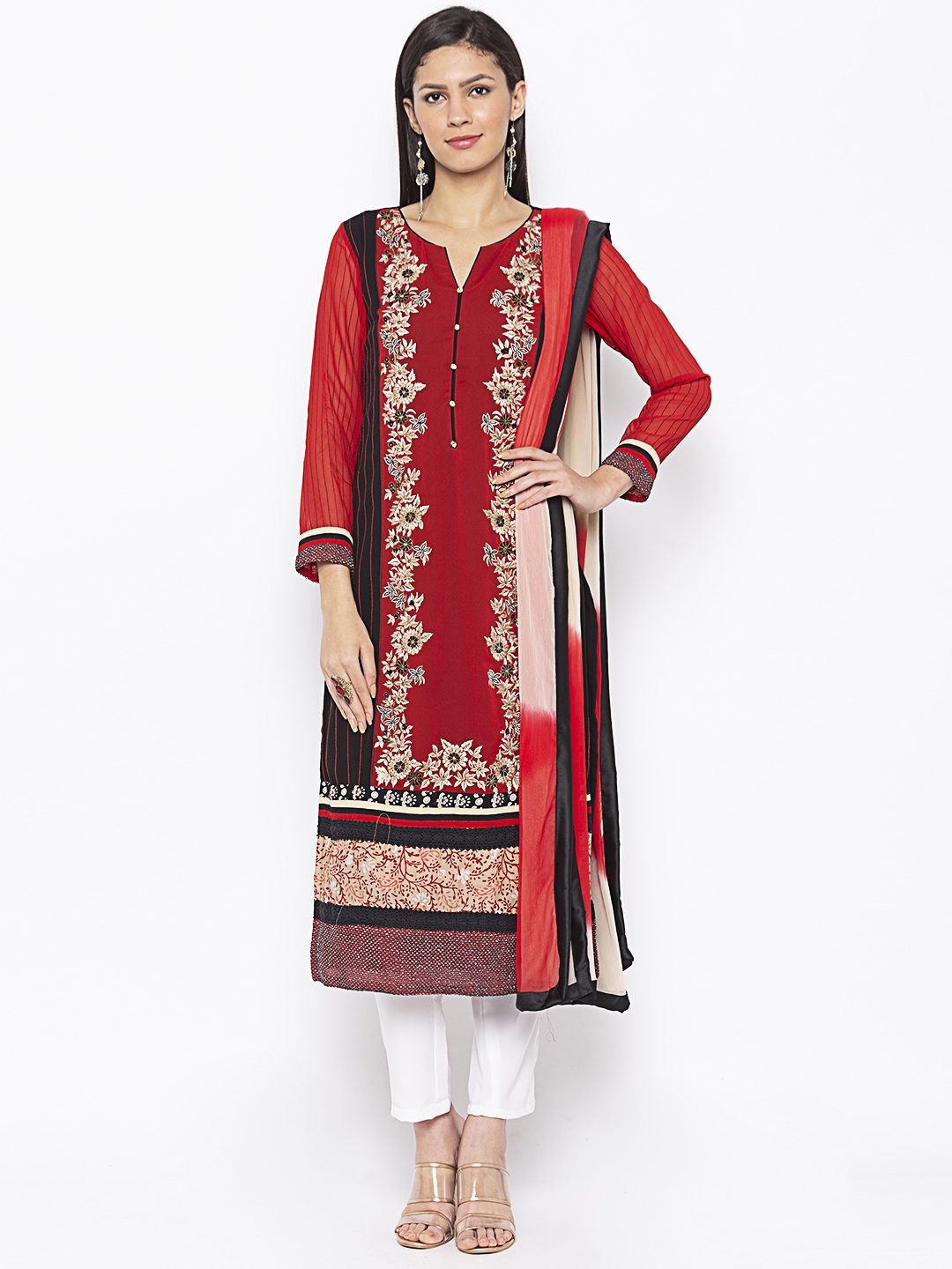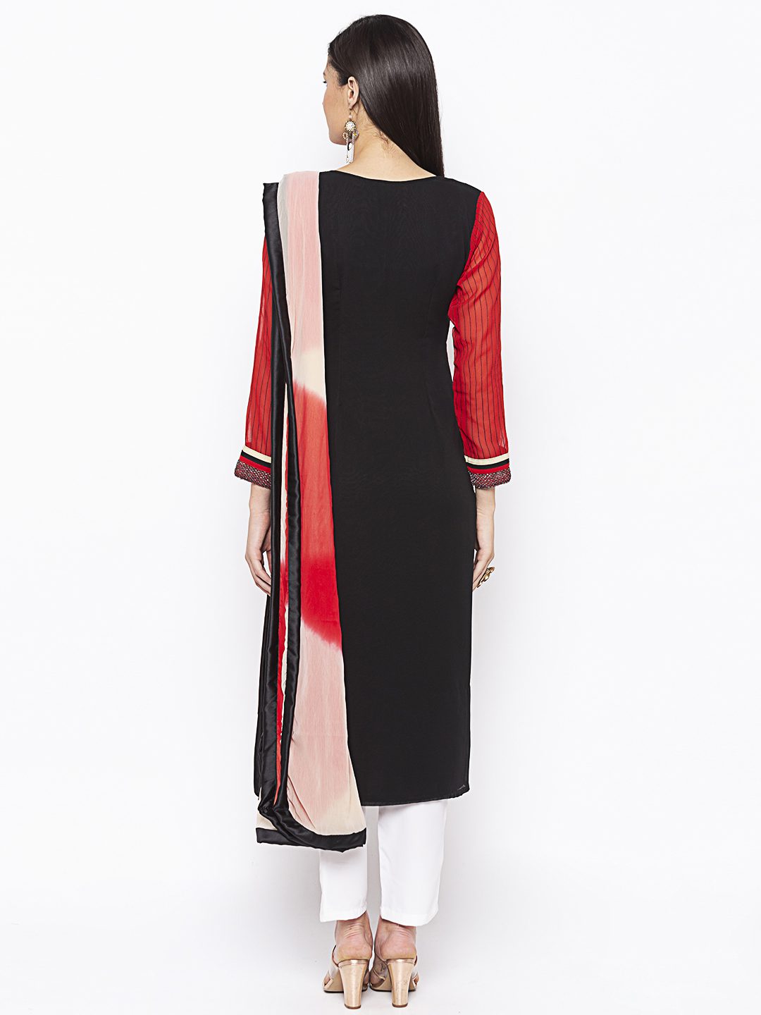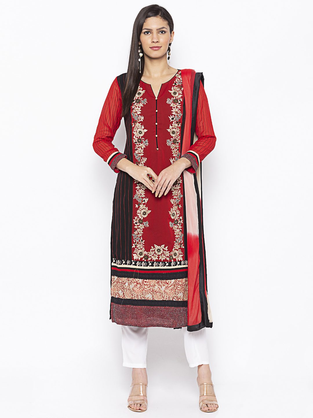 Black Maroonish Red Two Coloured Straight Cut Georgette Kurta With Red Sheer Georgette Sleeves Full With Black Stitching Detailings On It And On Side Panels.. Thread Antique Gold Embroidery On Front Panel With Champagne Gold Diamond Buttons Having Multi Print Plain Combo Hemline And Sleeves Edge. Worn With Off White Cigarette Pants And Creme Maroon Shaded Dupatta With Borders On All Sides.