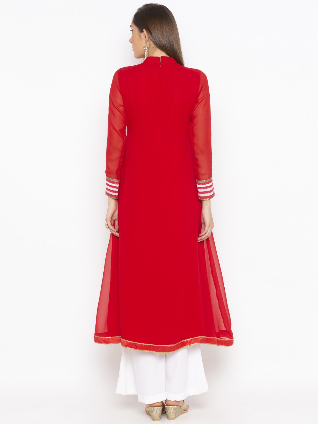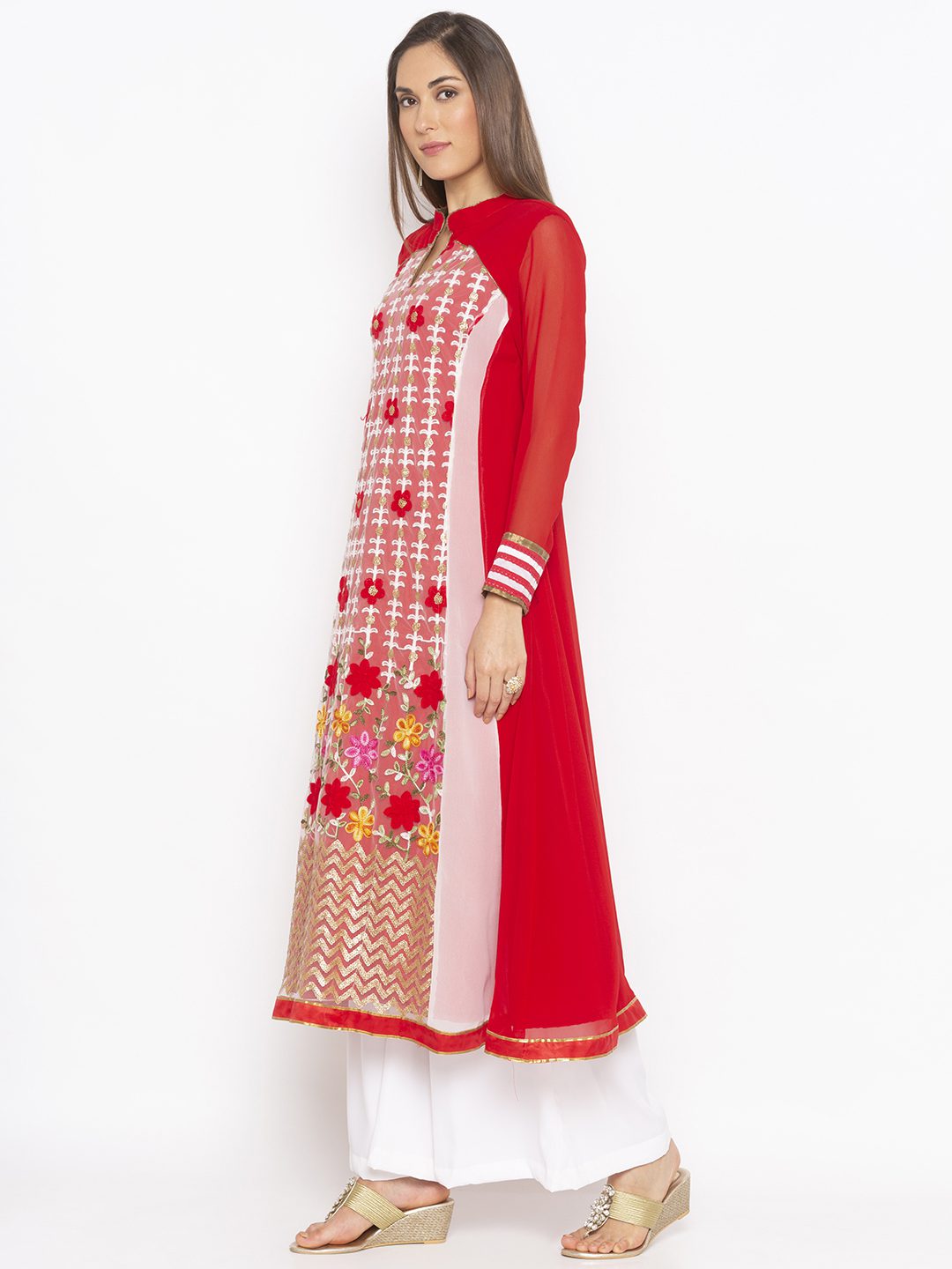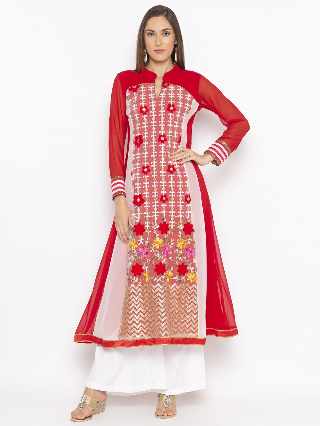 Red And White Georgette Kalidar Kurta With White Heavy Embroidery On Front Brocade Detailing On Three Quarter Sleeves And Hemline Worn With White Palazzos .