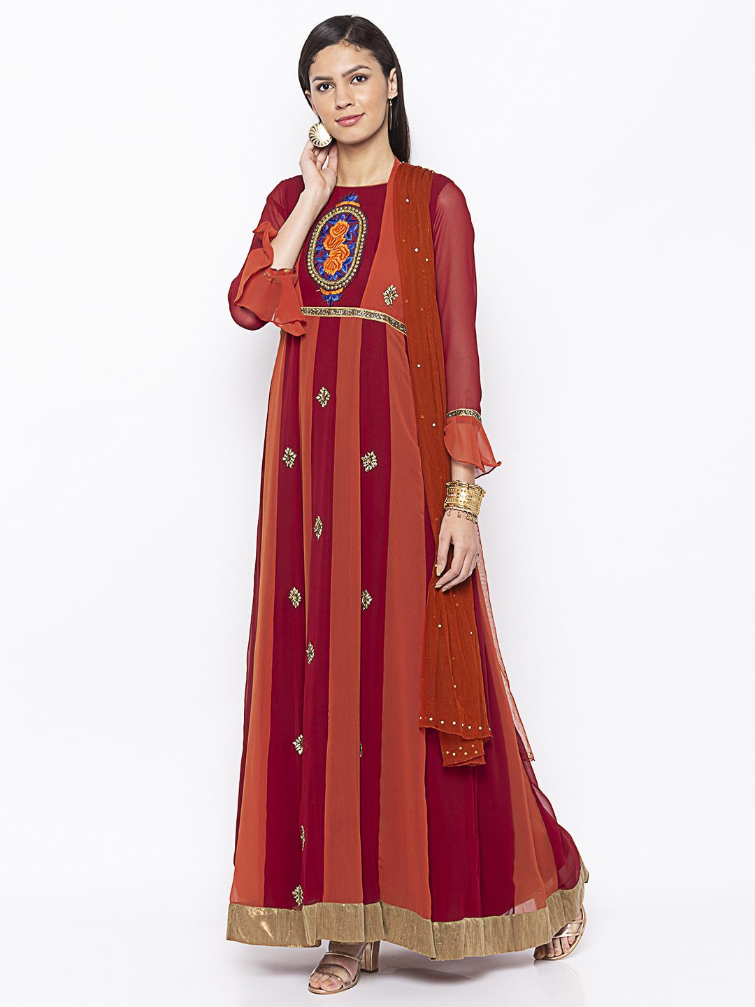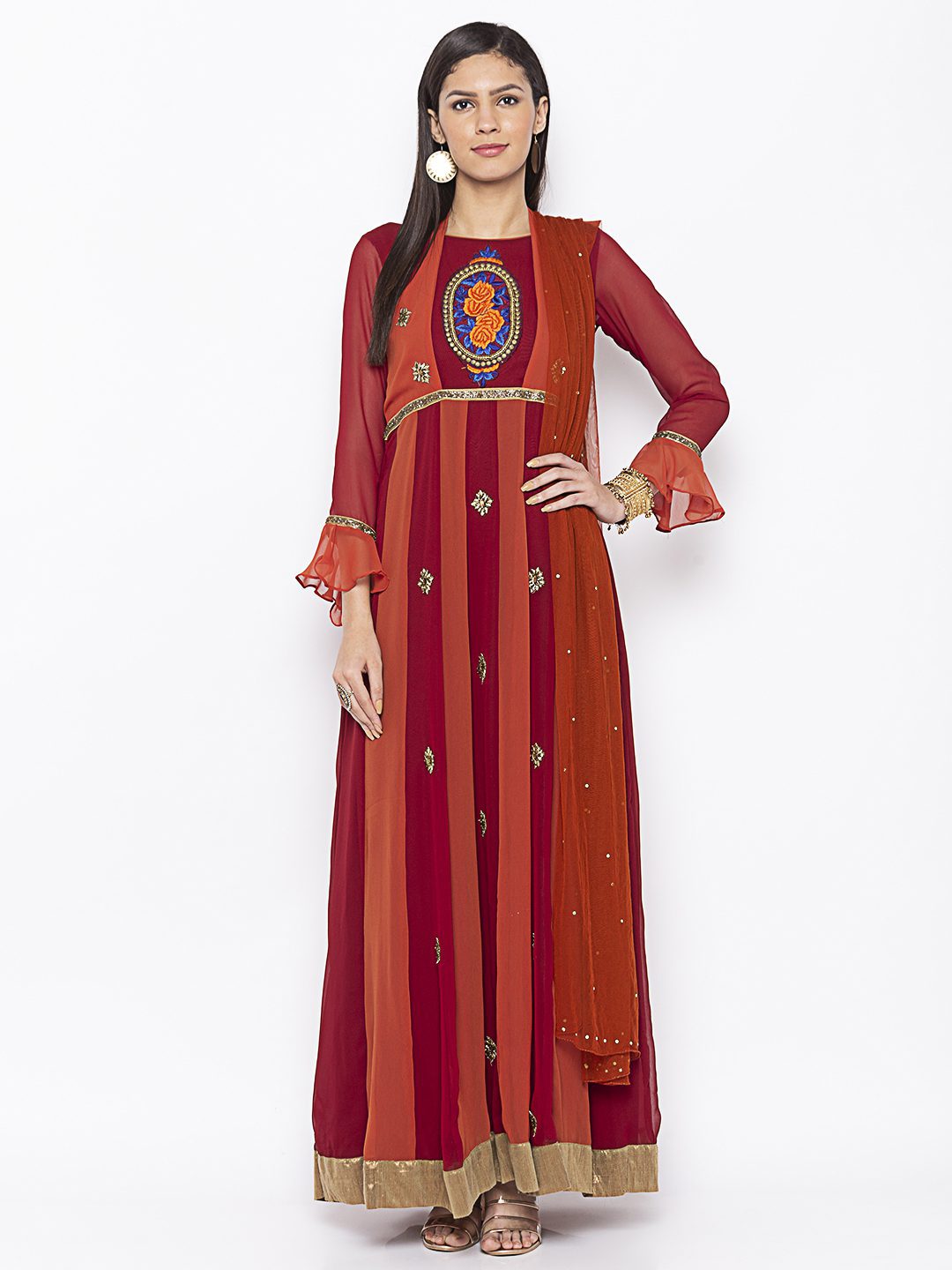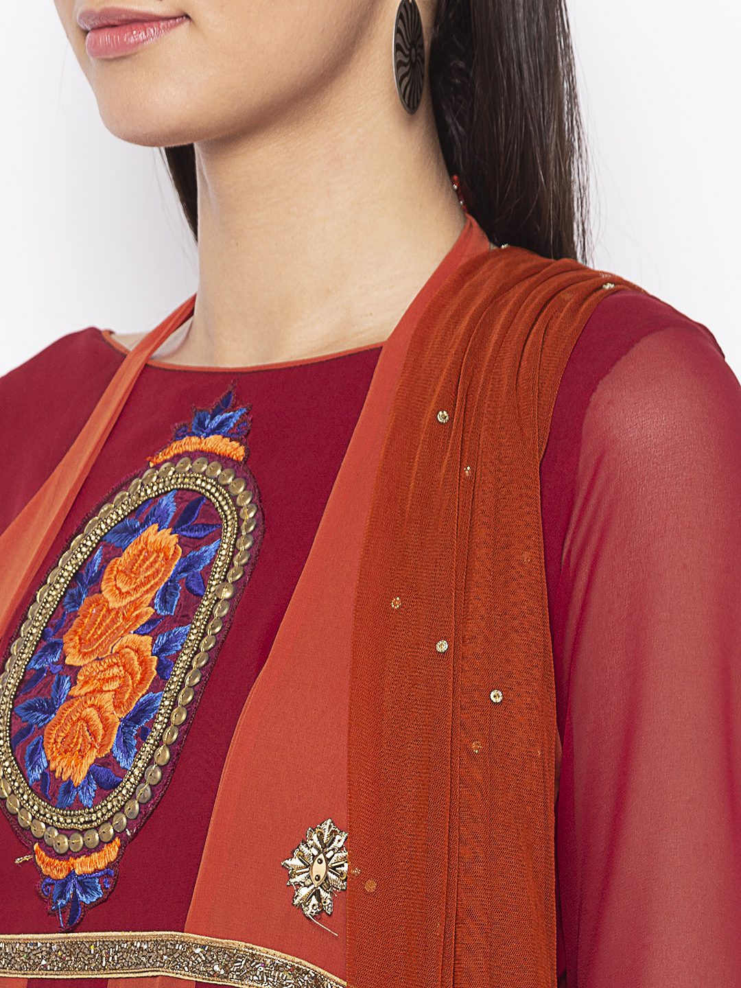 Nikhaar Creations Rust Maroon Embroidered Georgette Anarkali Pants Kurta Dupatta