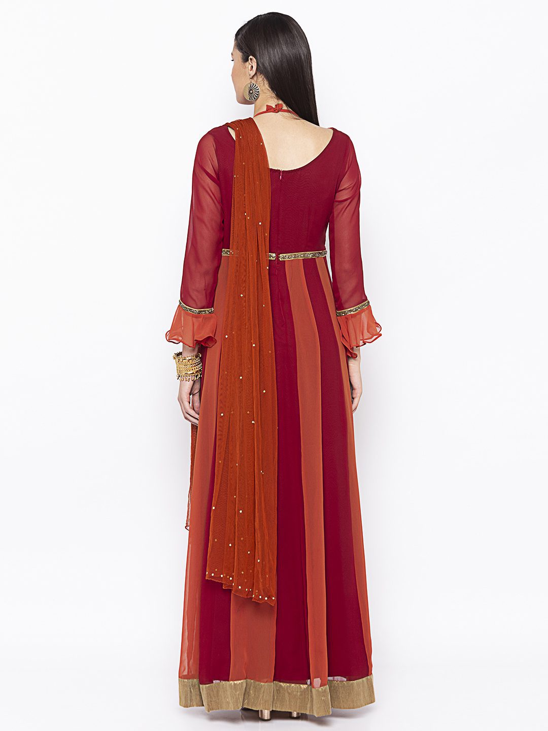 Rust Maroon 2 Colored Georgette Full Length Kalidaar Kurta With Mock Rust Halter In Front With A Boat Neck Hand Embroidered Motifs All Over The Front On Waist Band..Full Sleeves With A Slight Bell At End And Neckline Worn With Maroon Cigarette Pants And Net Gold Dimand Diamond Dupatta.