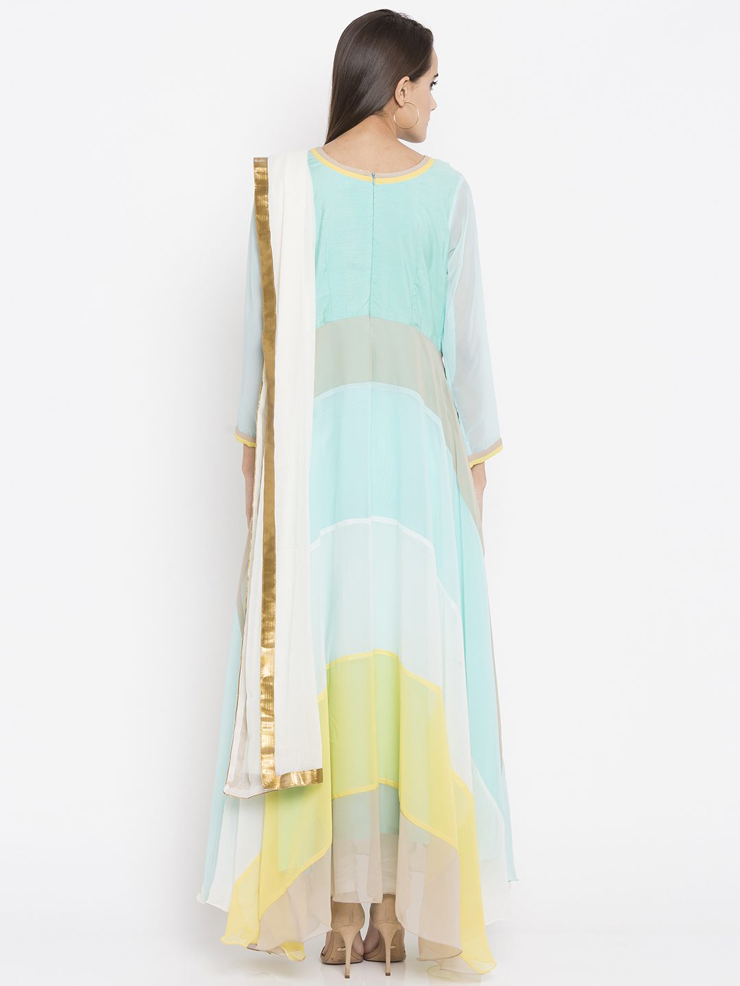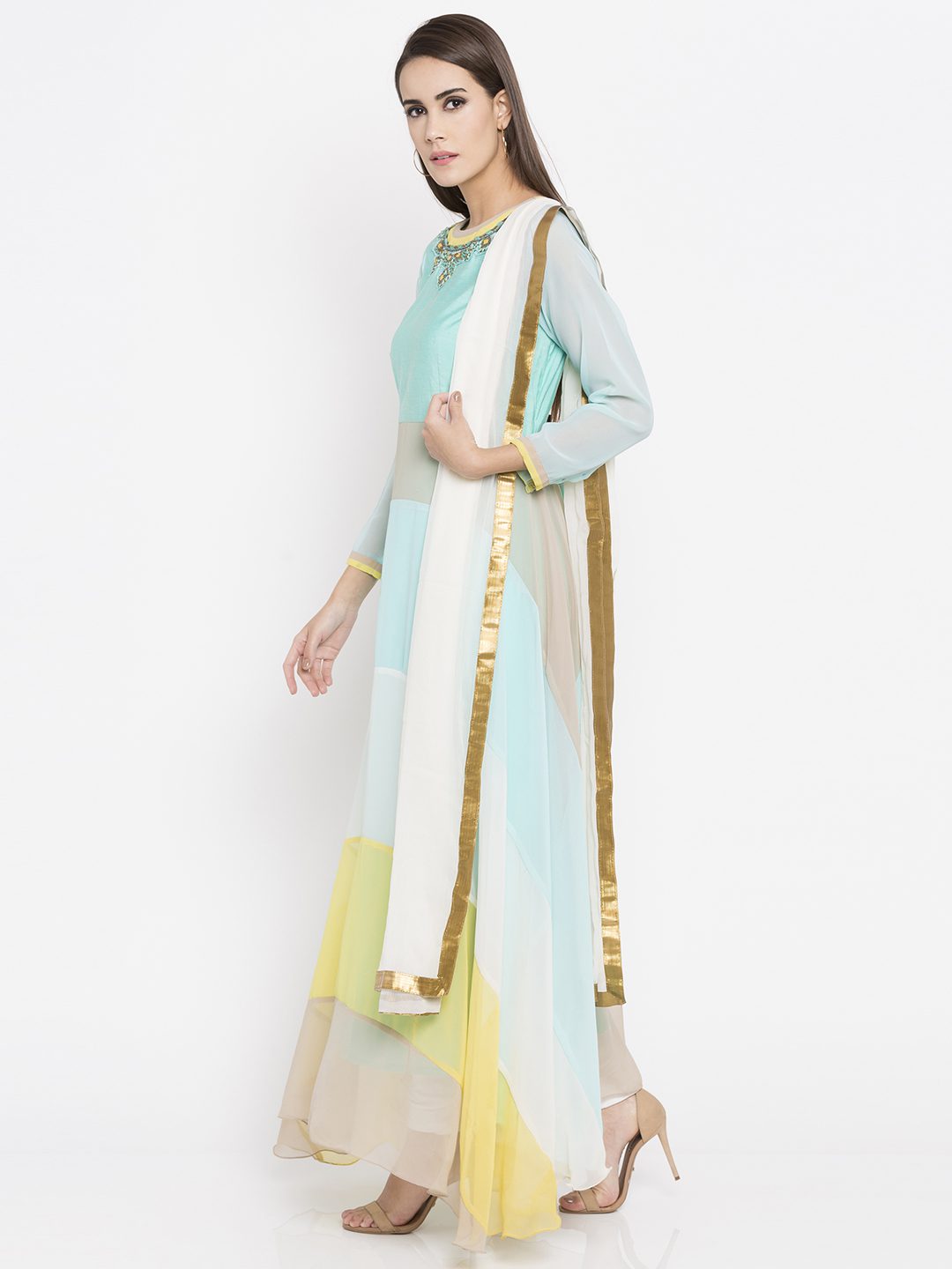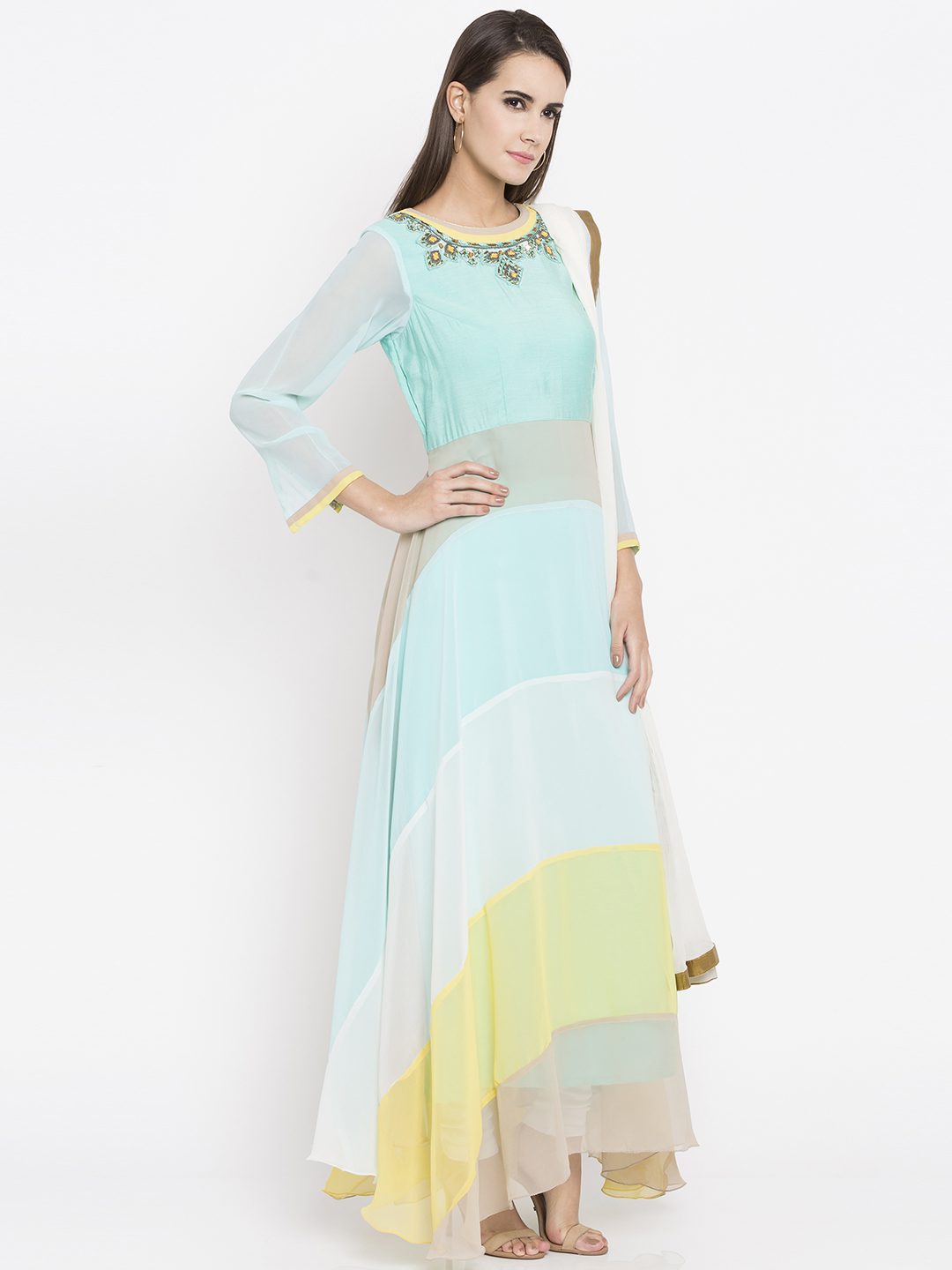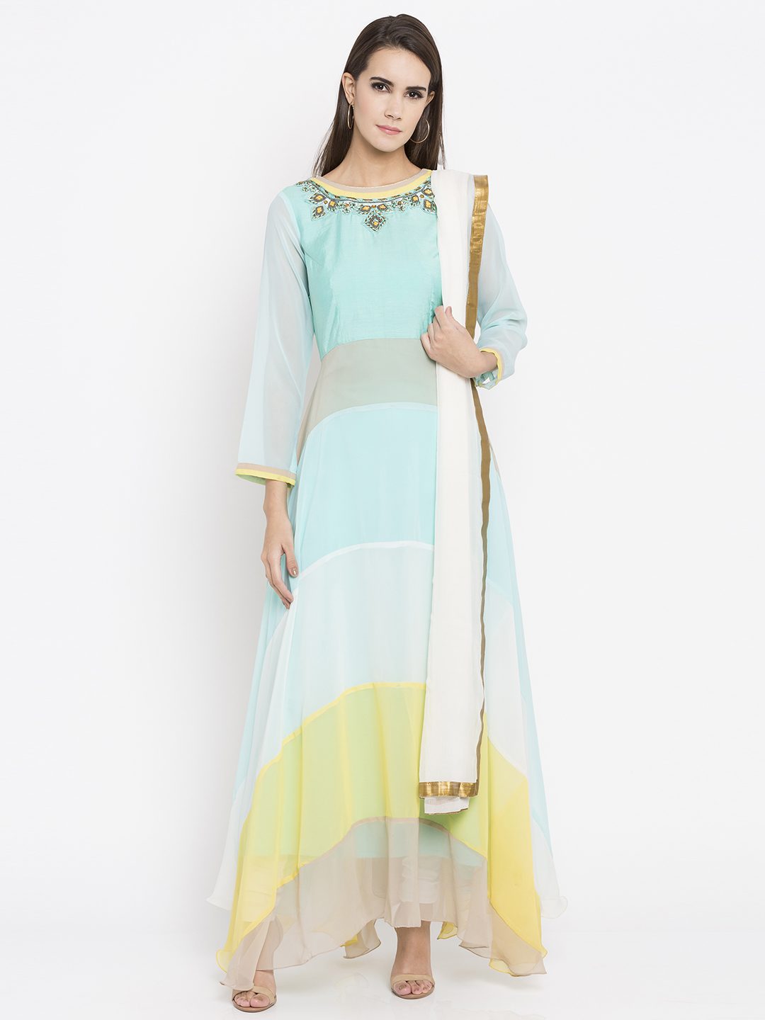 Teal Green Readymade Faux Georgette Long Kurta in Pastel Blue and Yellow This Round Neck and Quarter Sleeve attire with Faux Crepe Lining is Prettified with Resham, Beads, Bullion and Patch Border Work. worn with off white Churidar and off white Chiffon Dupatta.