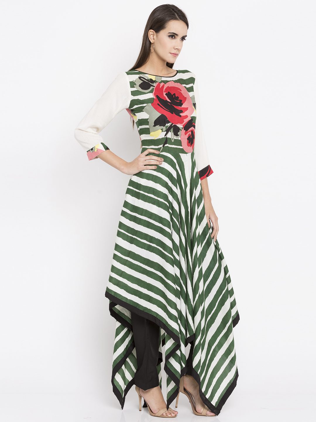 Nikhaar Creations White Printed Cotton Asymmetrical Kurta