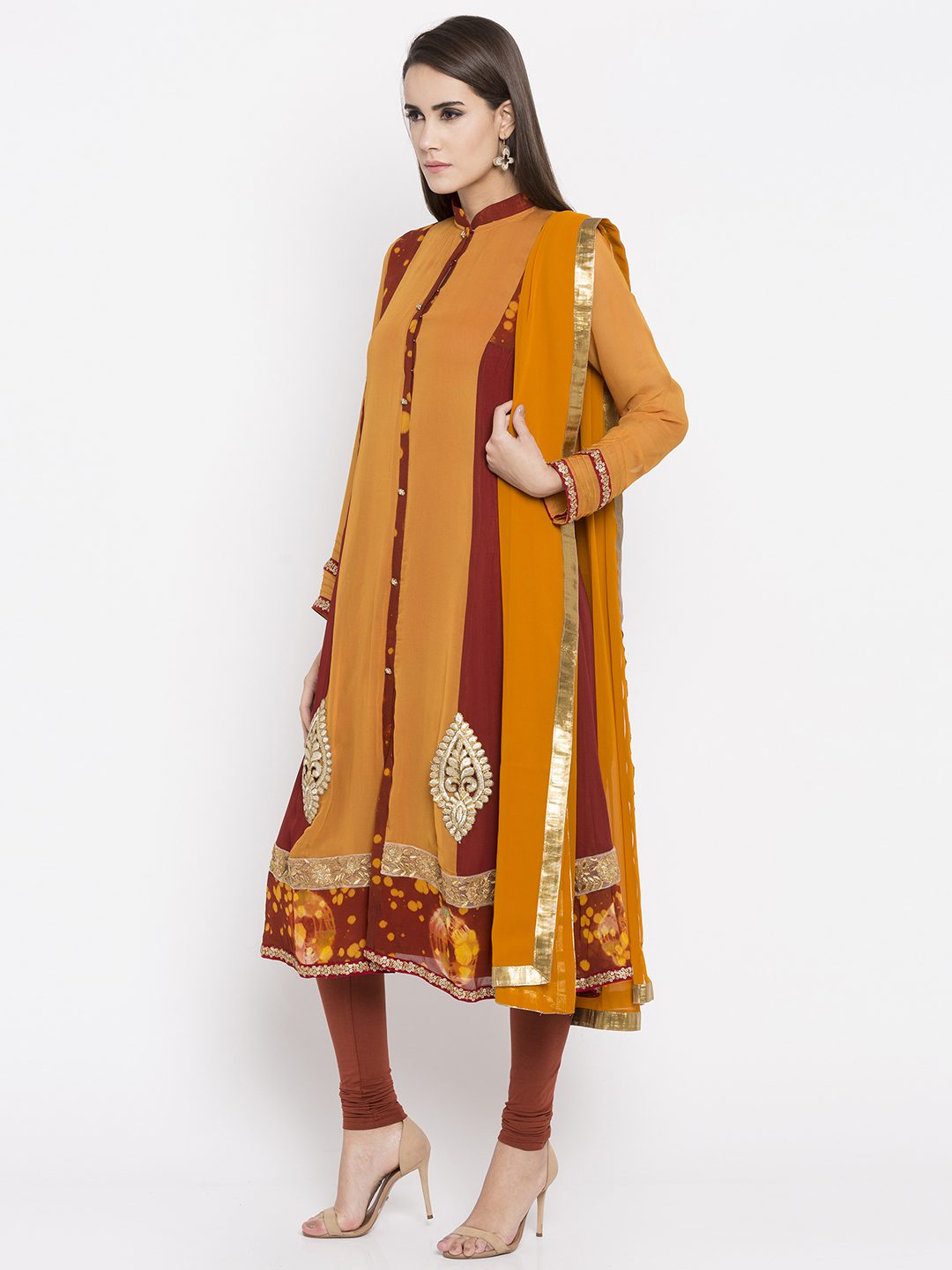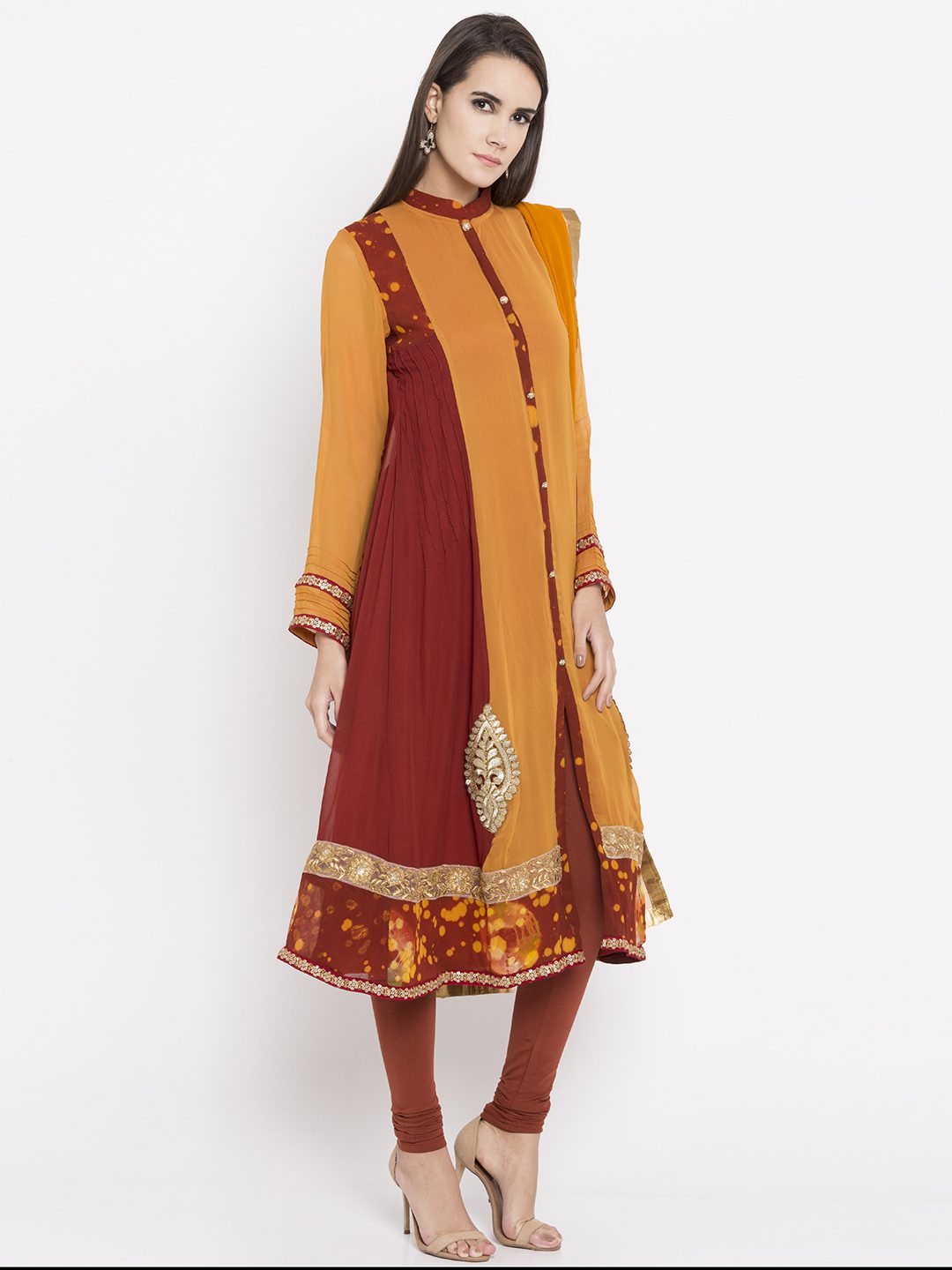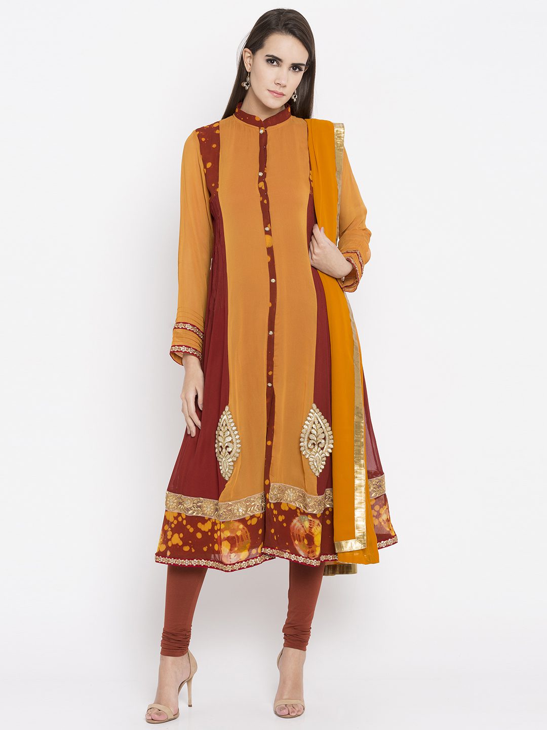 yellow flared readymade kameez in georgette designed with striking shibori print detailing enhanced by embroidery work at the hemline and buttoned down front.worn with Rust Churidar And Yellow Chiffon Dupatta.