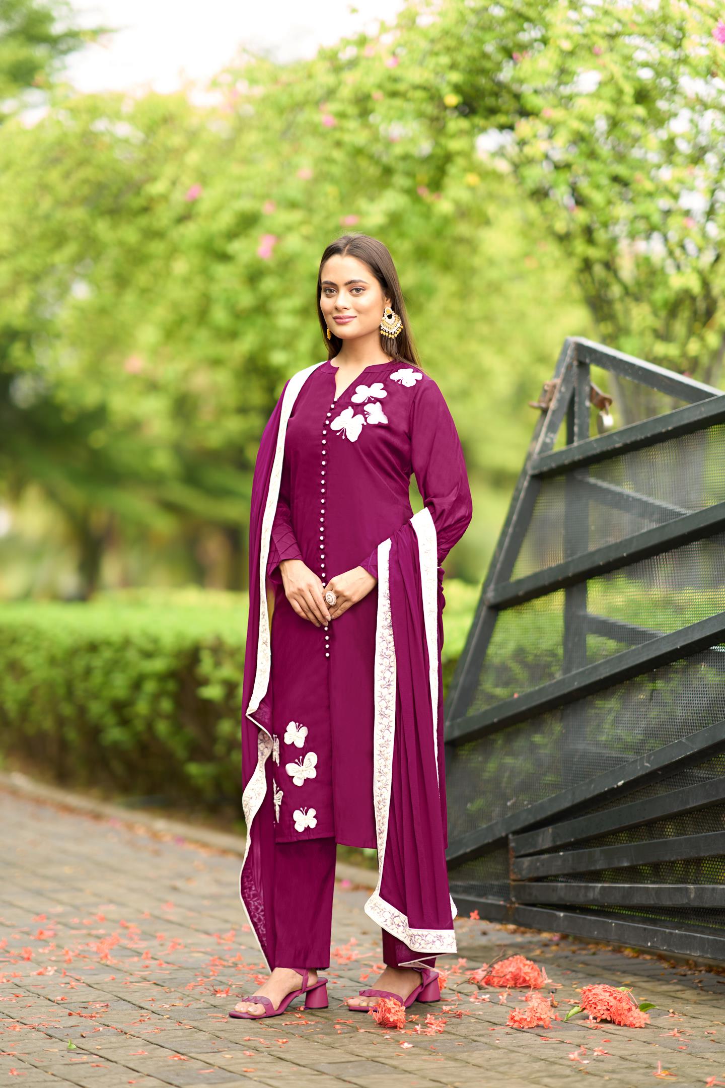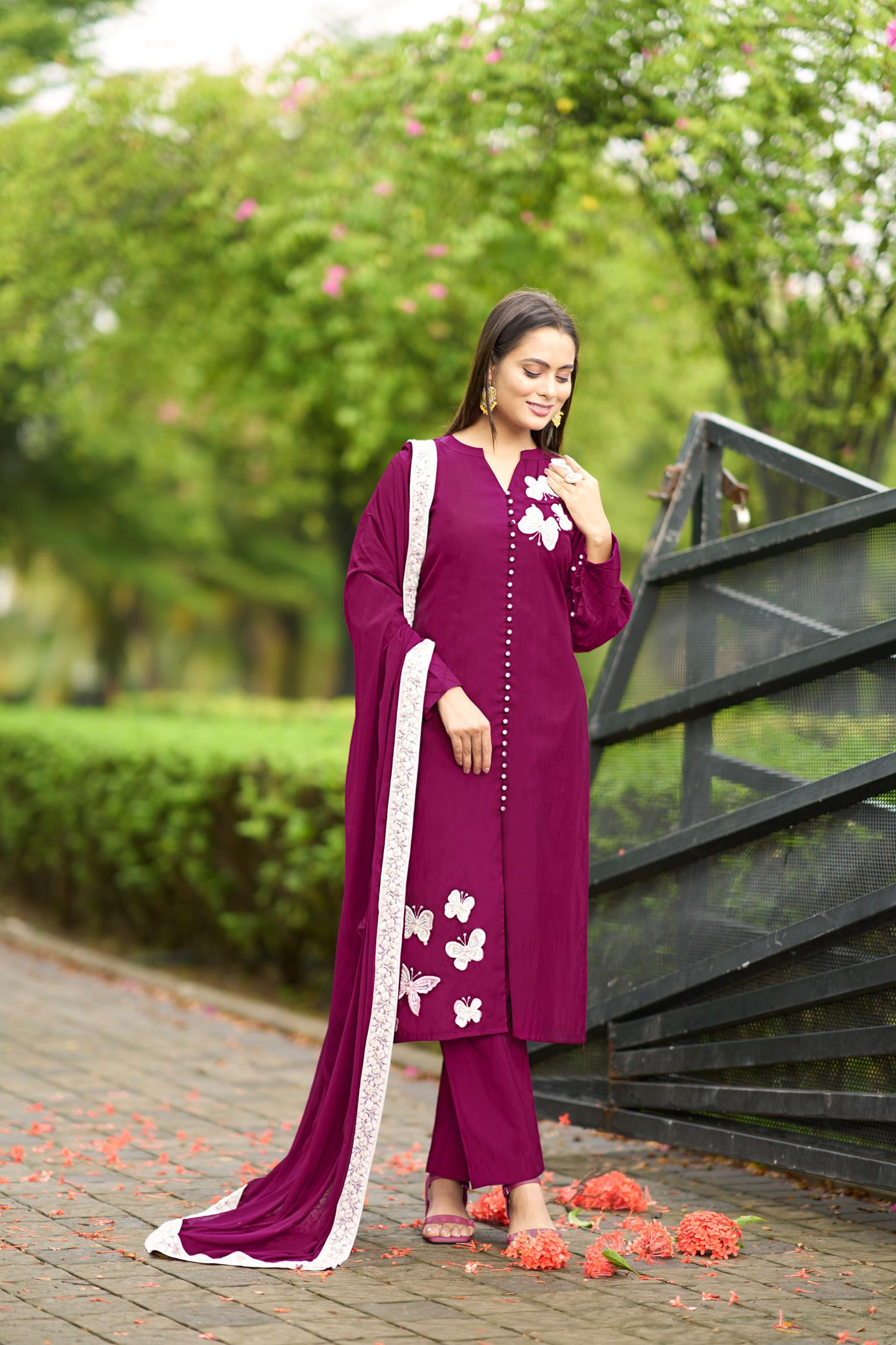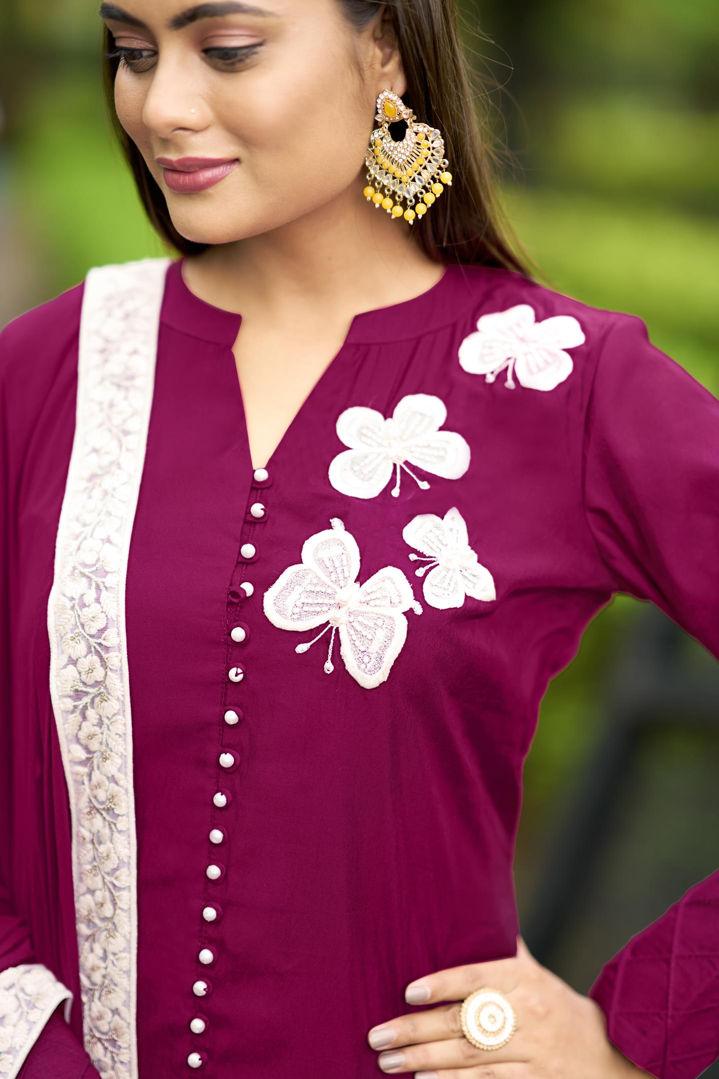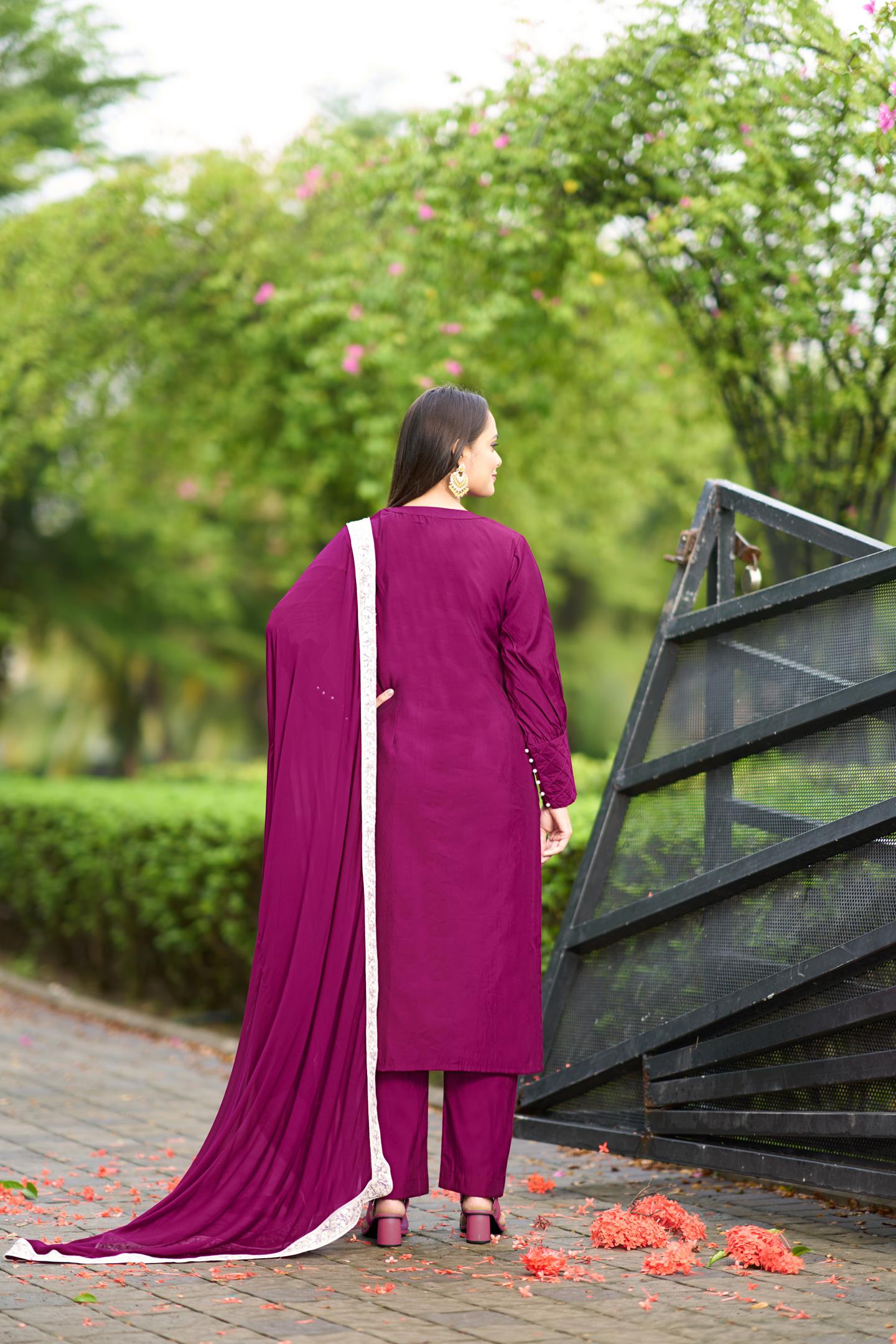 Dark Pink Art Silk Straight Kurta with machine work embroidery detailing along with pearl and hand work embellishments. Paired with Art Silk Cigarette Pants and Chiffon Dupatta with Lace Border on all sides.