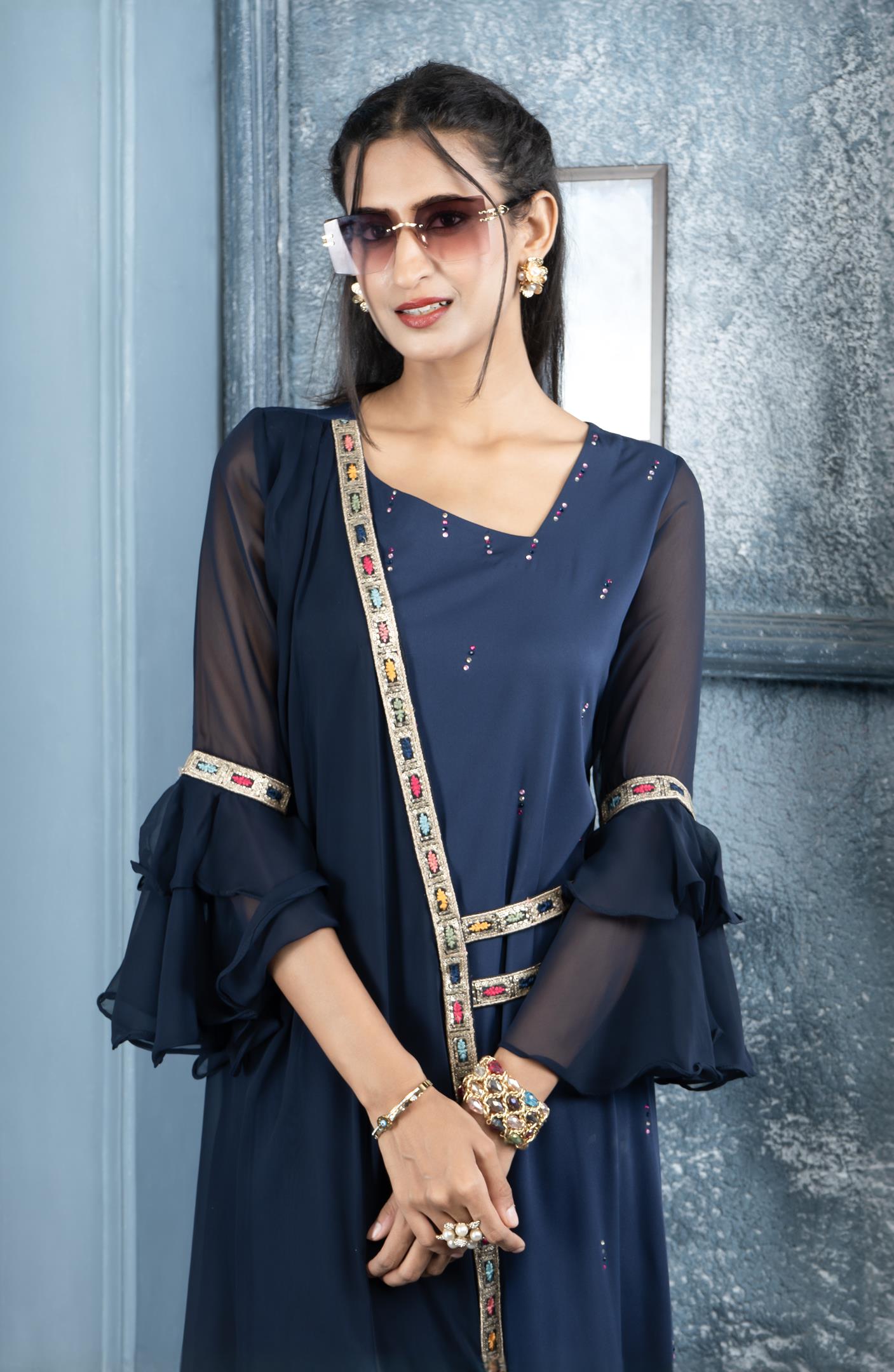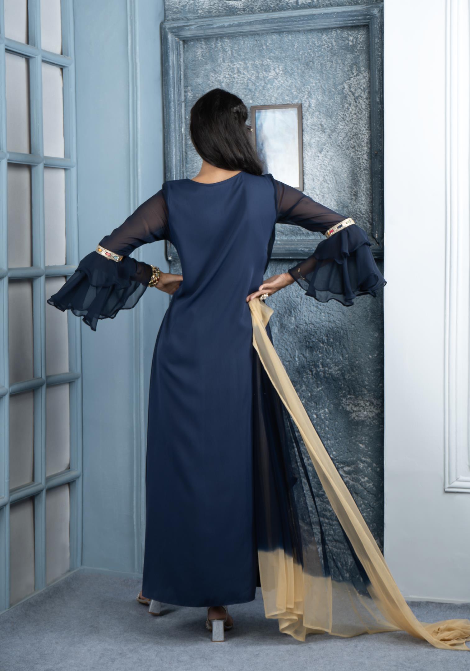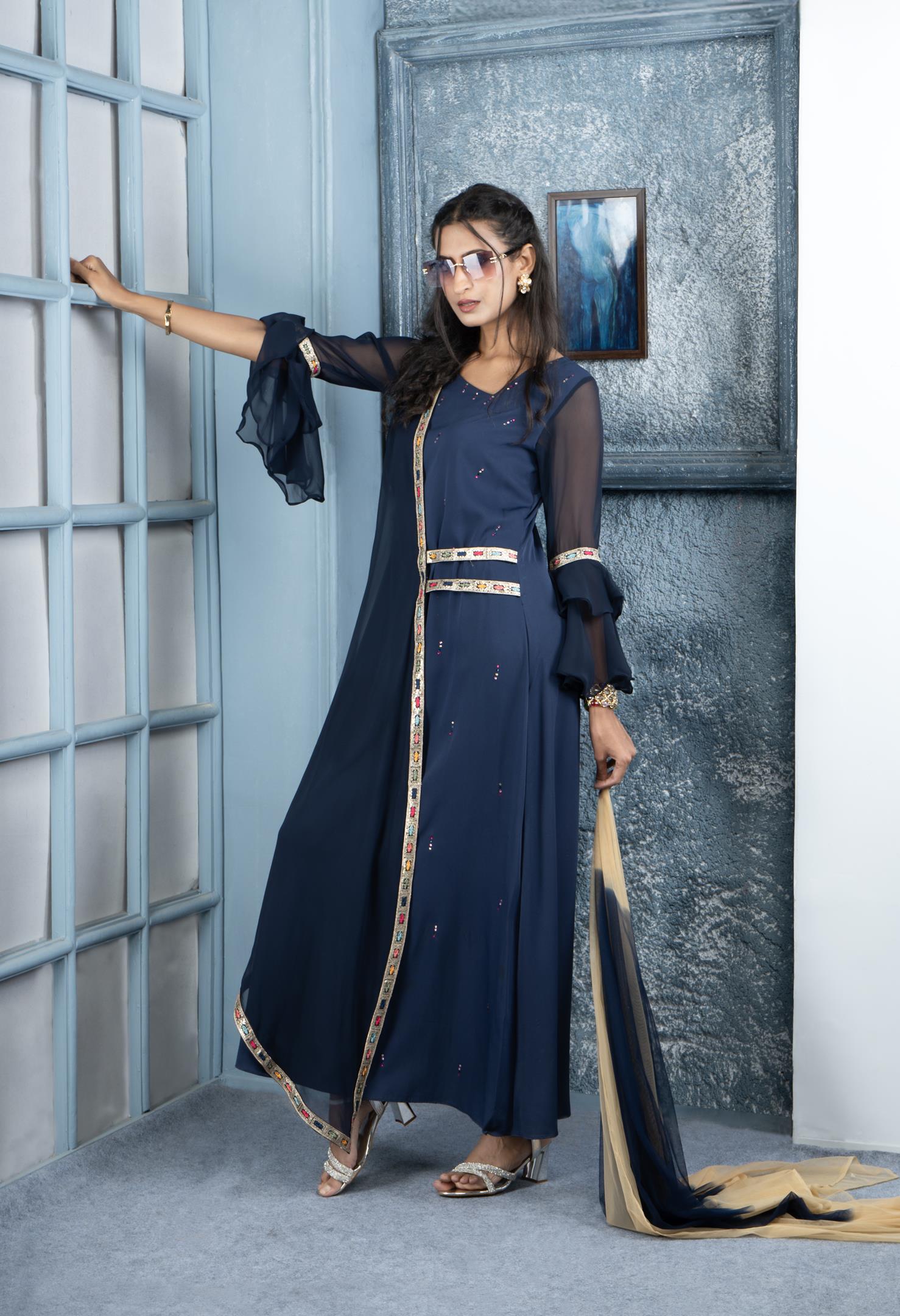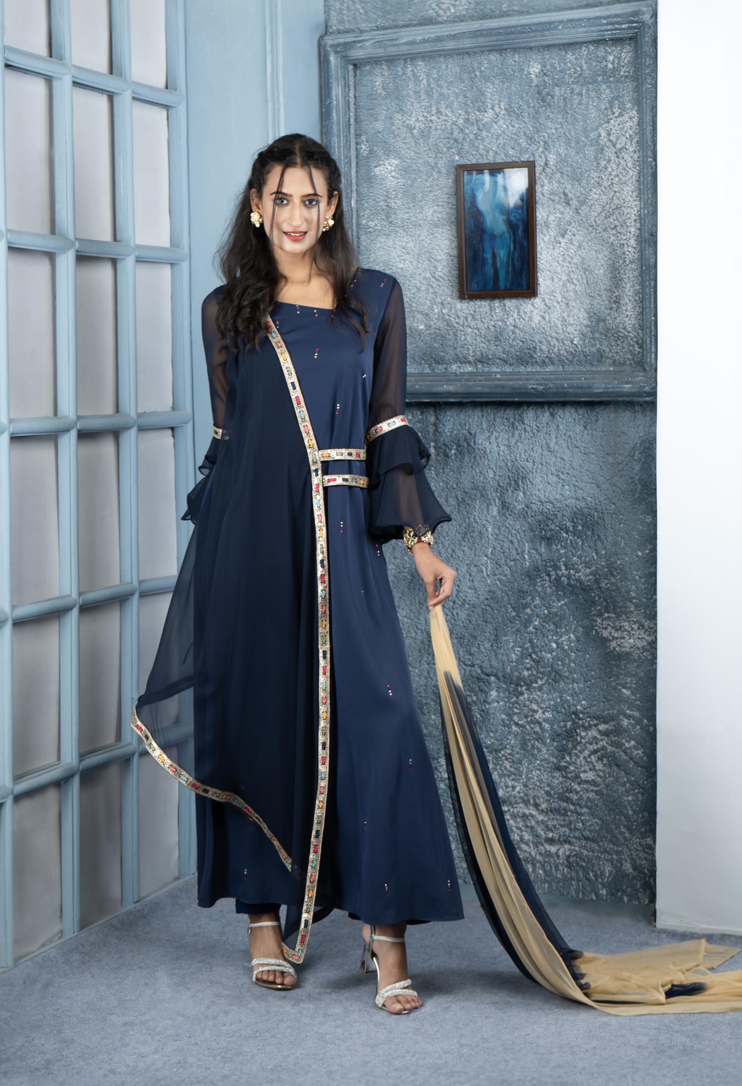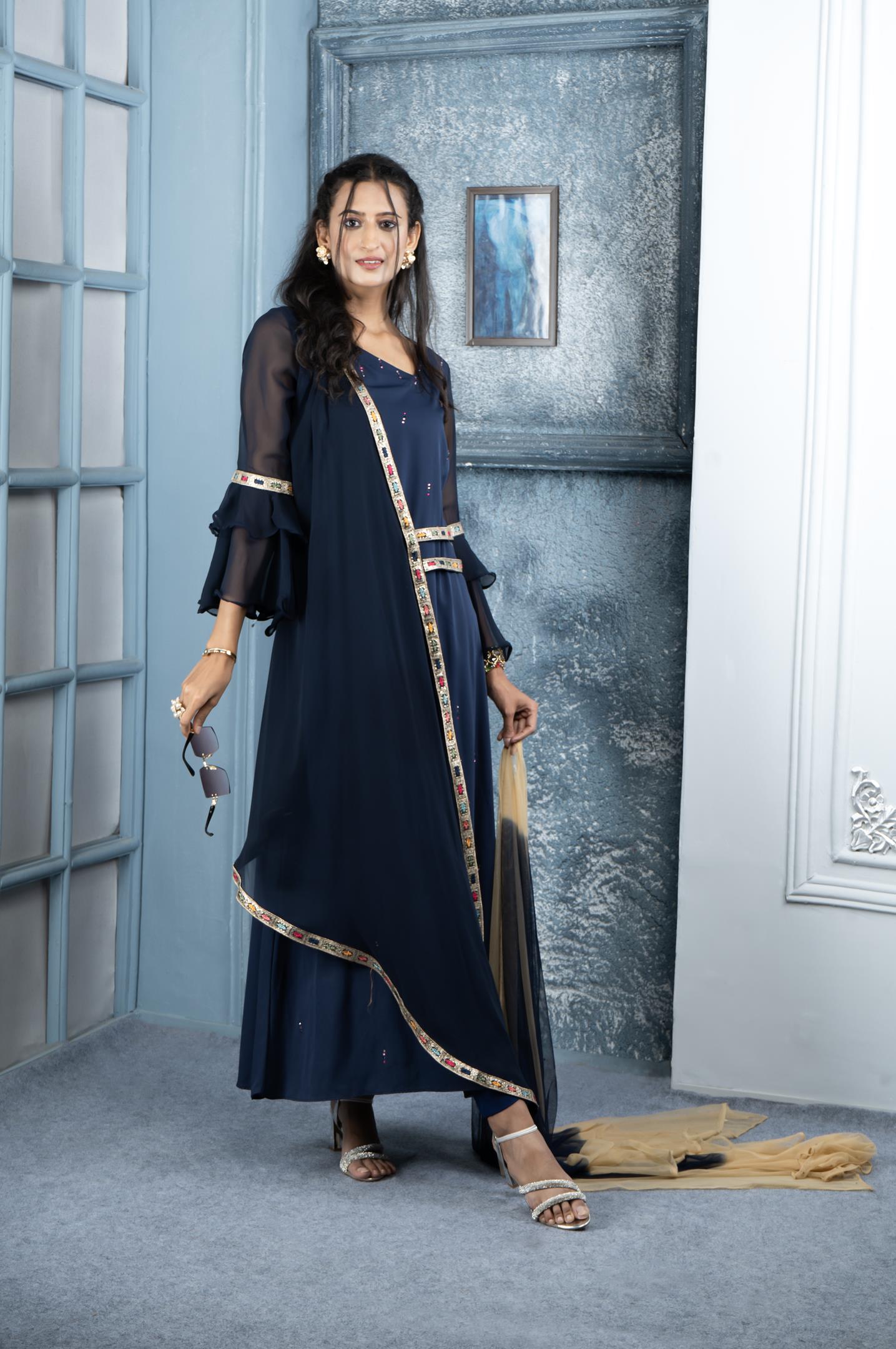 Navy Blue Georgette Asymmetrical Full Length Kurta With Double Umbrella Full Sleeves. Swarovski On The Inner Kurta And Embroidery Border On Asymmetrical Panel And Waistband And Sleeves. Worn With Matching Cigarette Pants And Beige Blue Shaded Chiffon Dupatta With Gold Diamantes.