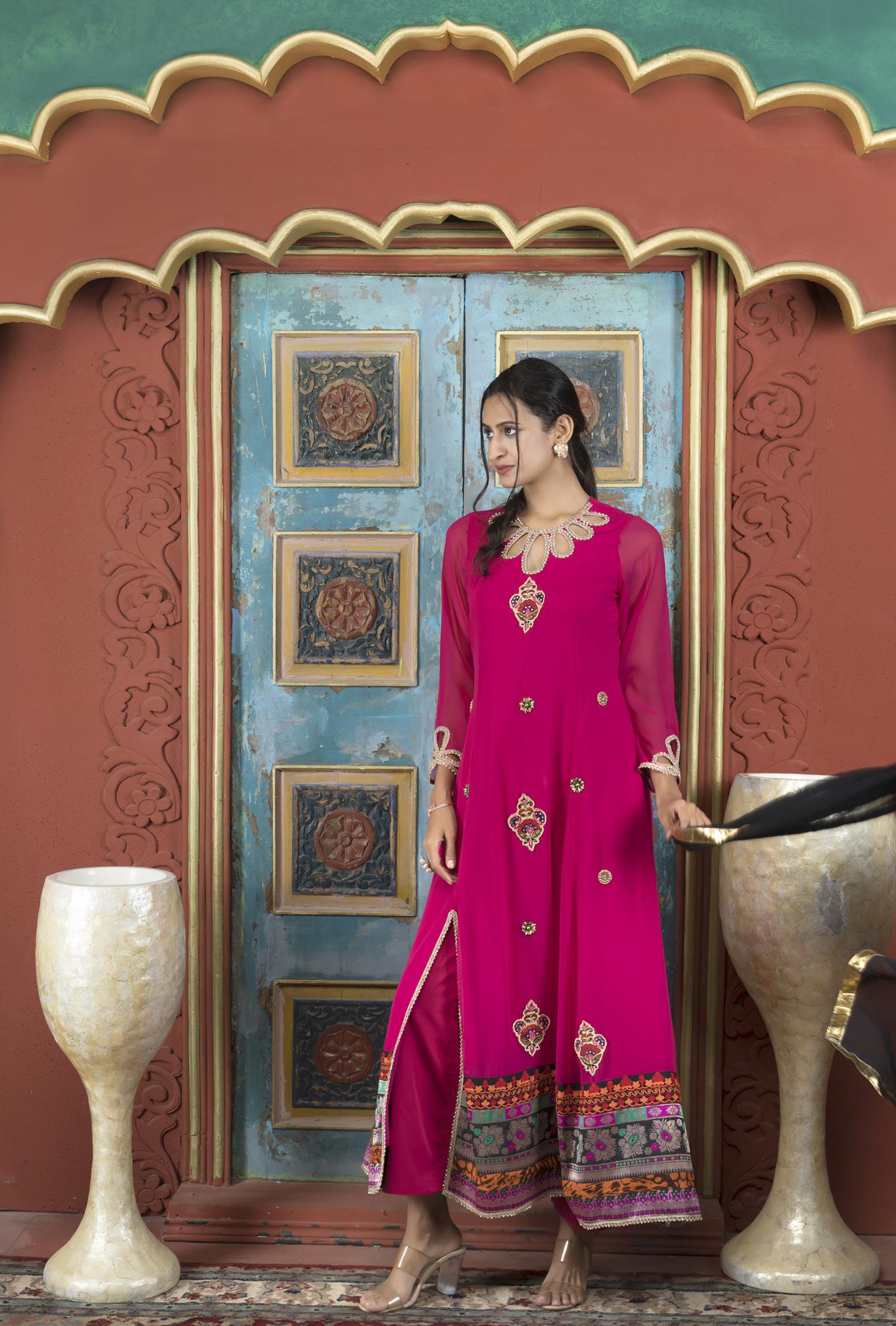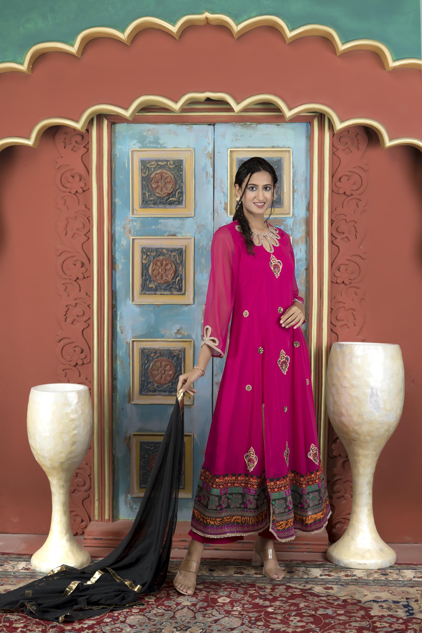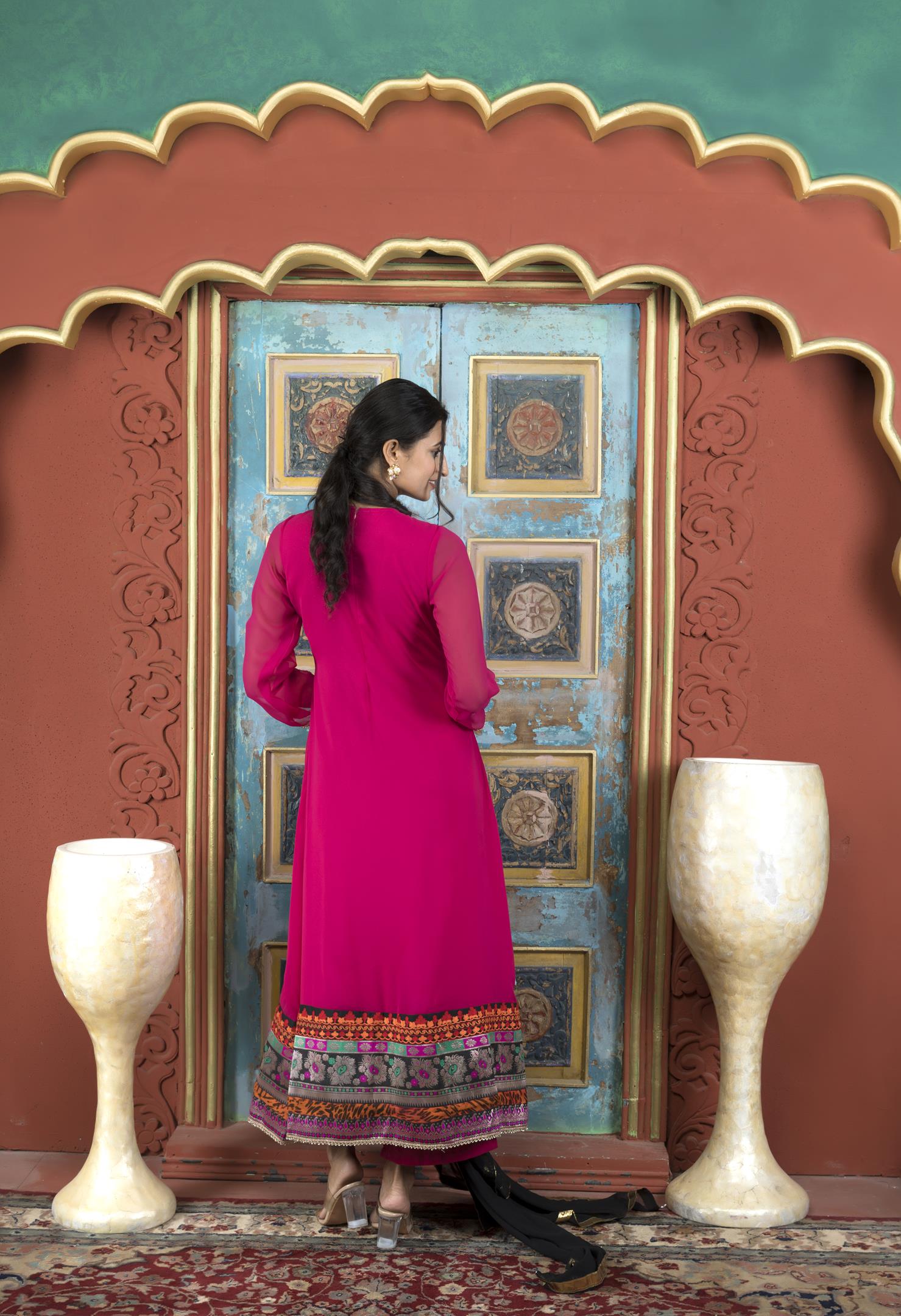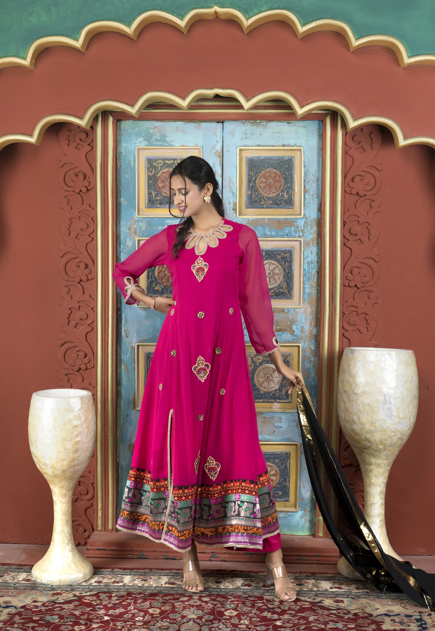 Pink Georgette Full Length Kalidaar Kurta With Hand Embroidered Border Detailing On Neckline, Full Sleeves And Lateral Slit, Cutwork Detailing On Neck And Sleeves, Hand Embroidery All Over The Front With Banaras Brocade Hand Embroidery And Print Border Detailing On Hemline. Worn With Pink Cigarette Pants And Black Chiffon Dupatta With Gold Tissue Borders On All 4 Sides.