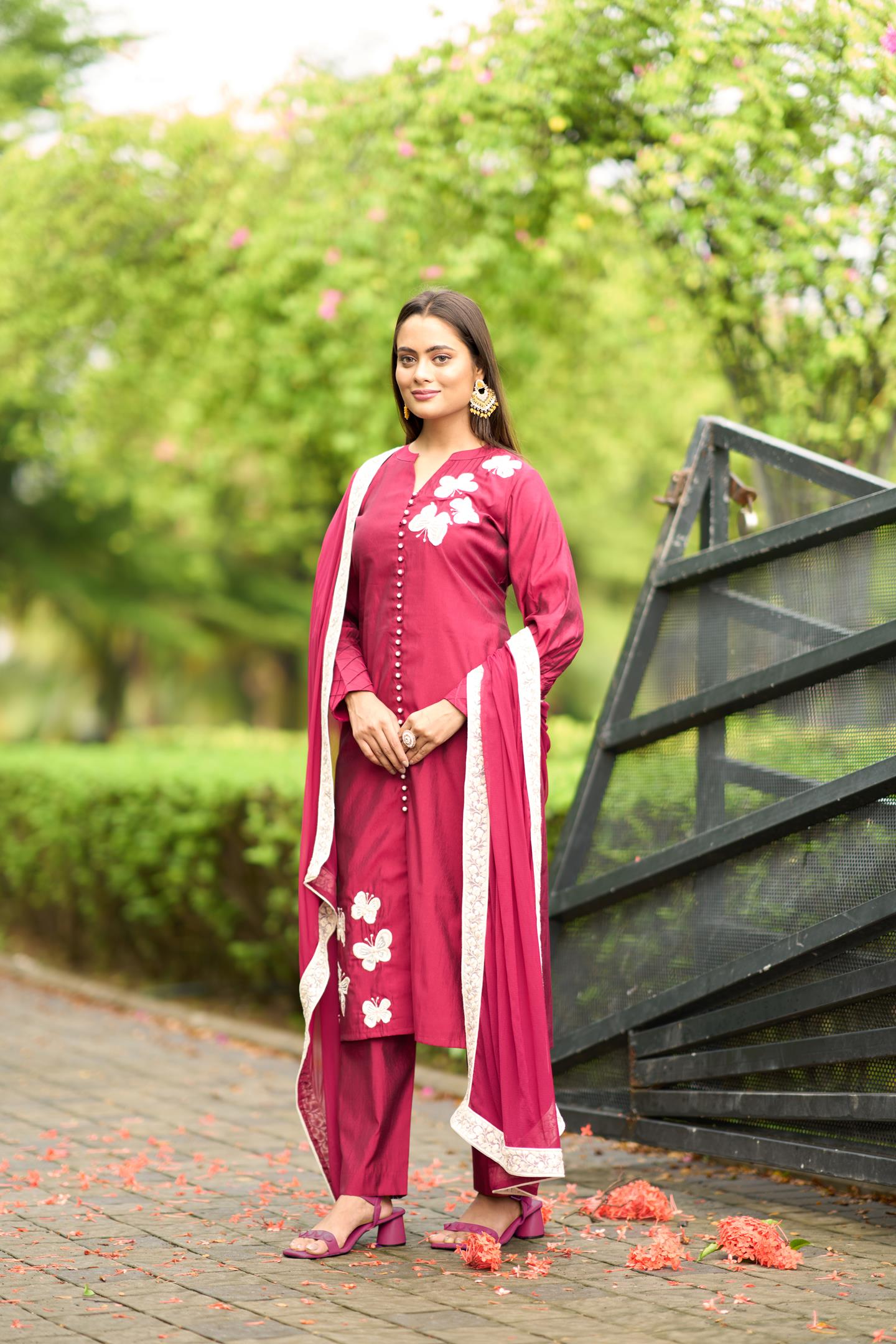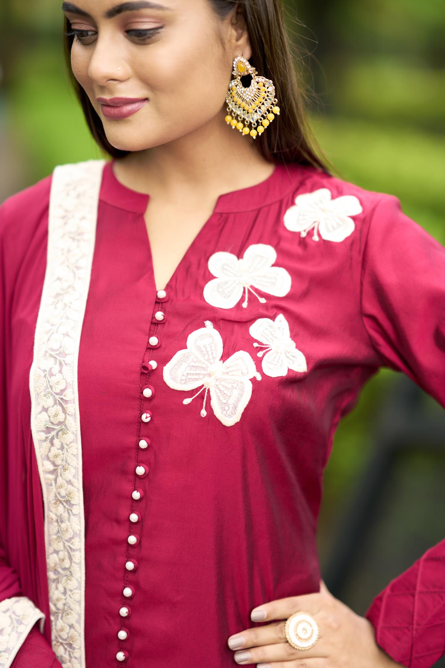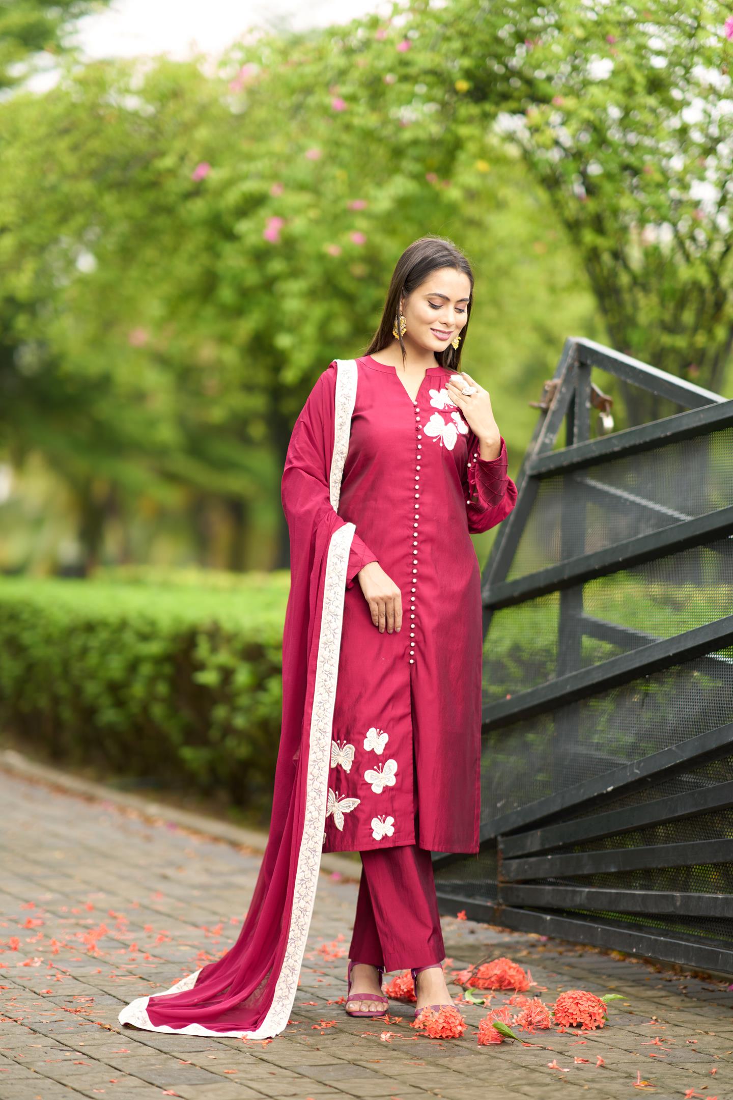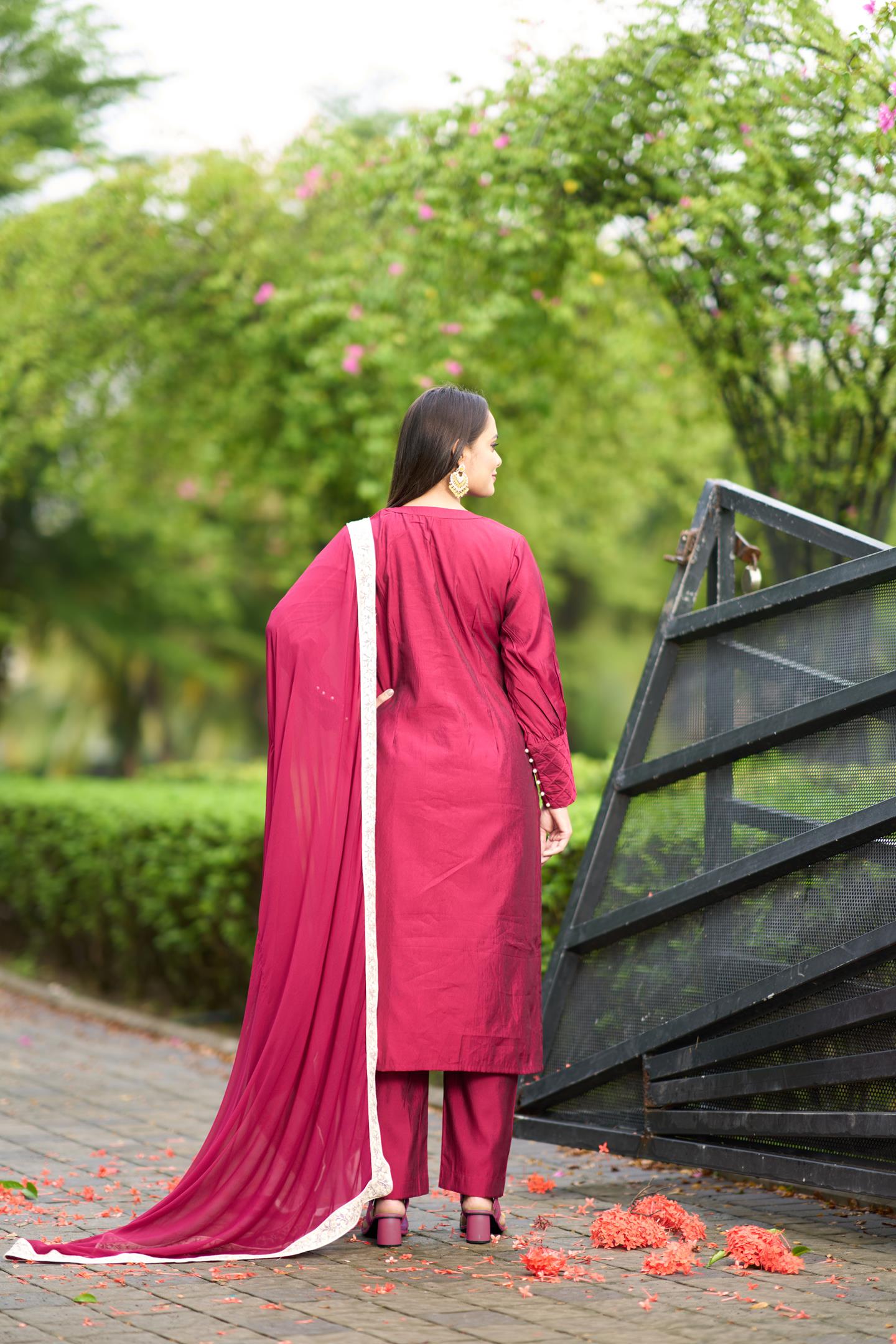 Pink Art Silk Straight Kurta with machine work embroidery detailing along with pearl and hand work embellishments. Paired with Art Silk Cigarette Pants and Chiffon Dupatta with Lace Border on all sides.