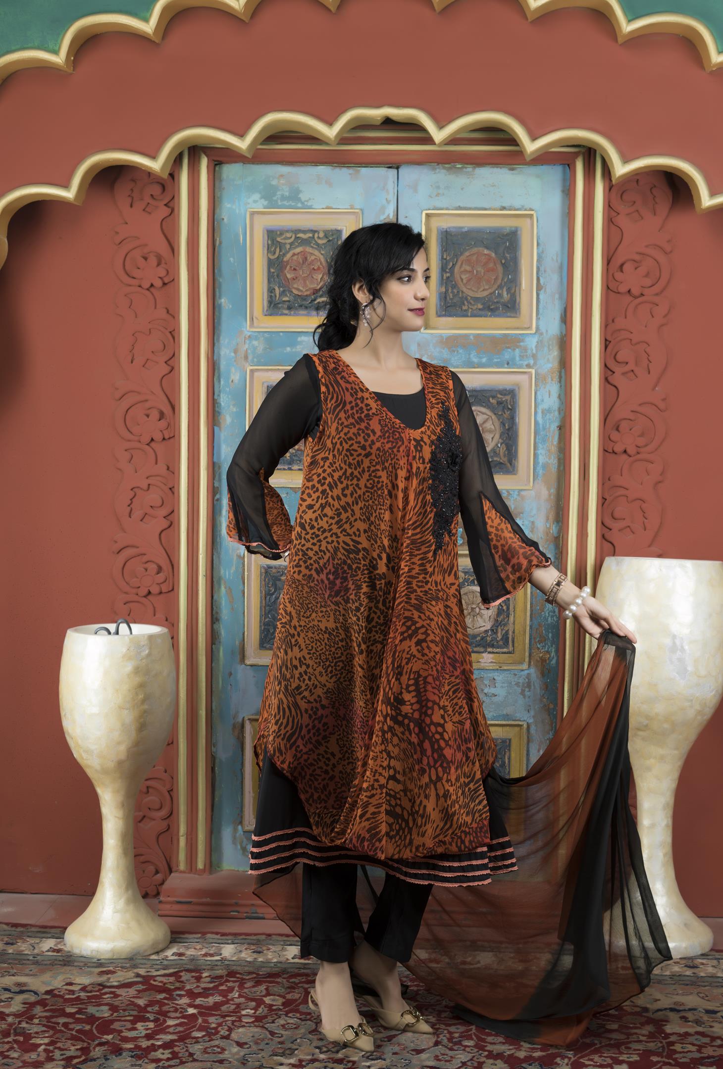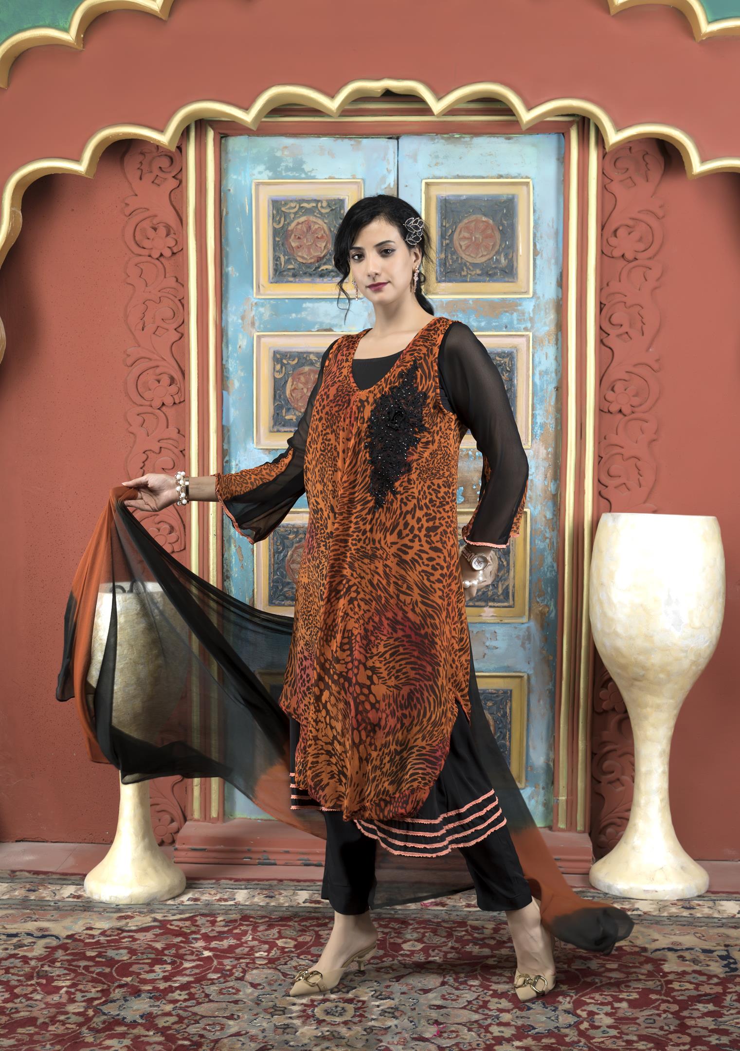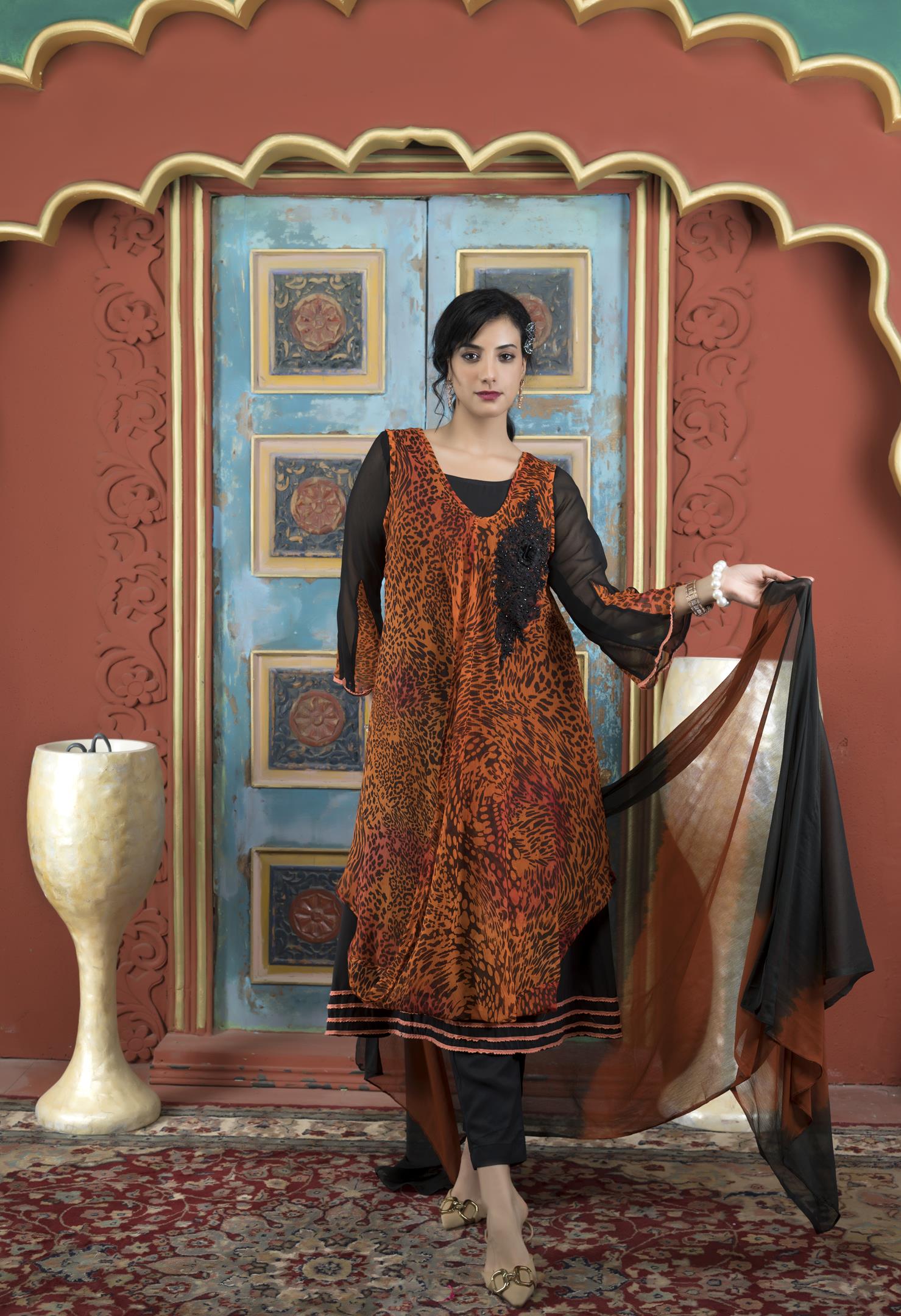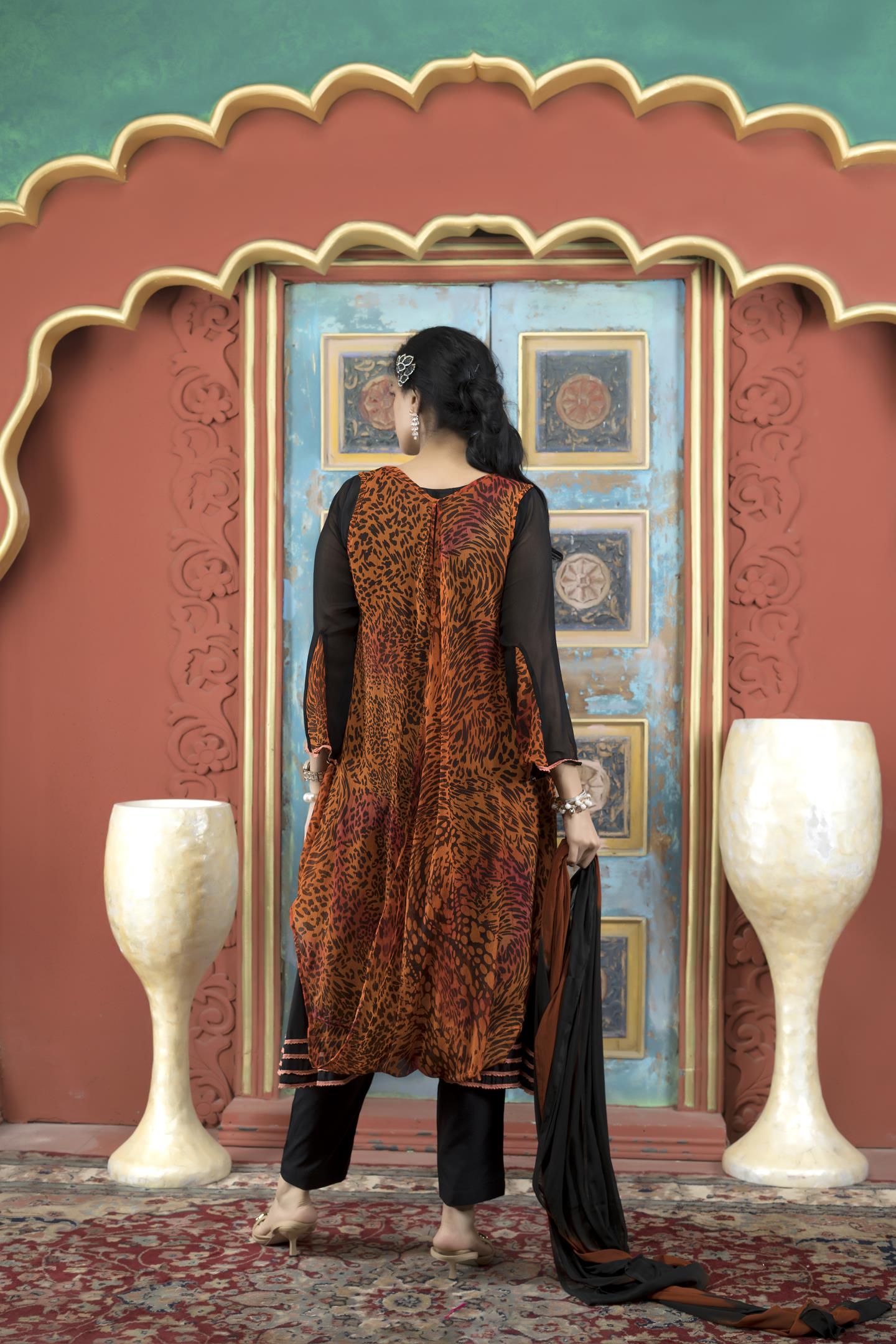 Rust Black Leopard Print Chiffon Georgette Asymmetrical Draped Kurta With Black American Crepe Kurta Inside, Hand Embroidery Around Neckline, 3/4 Black Georgette Bell Sleeves With Print Detailing, Rust Detailing On Sleeves And Hemline Edge. Worn With Black Cigarette Pants And Black Rust Shaded Chiffon Dupatta.