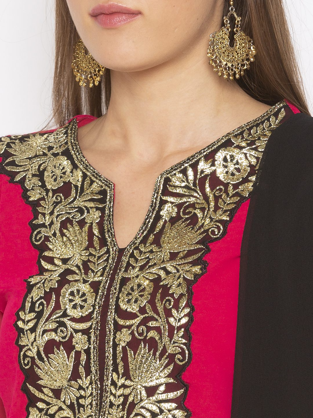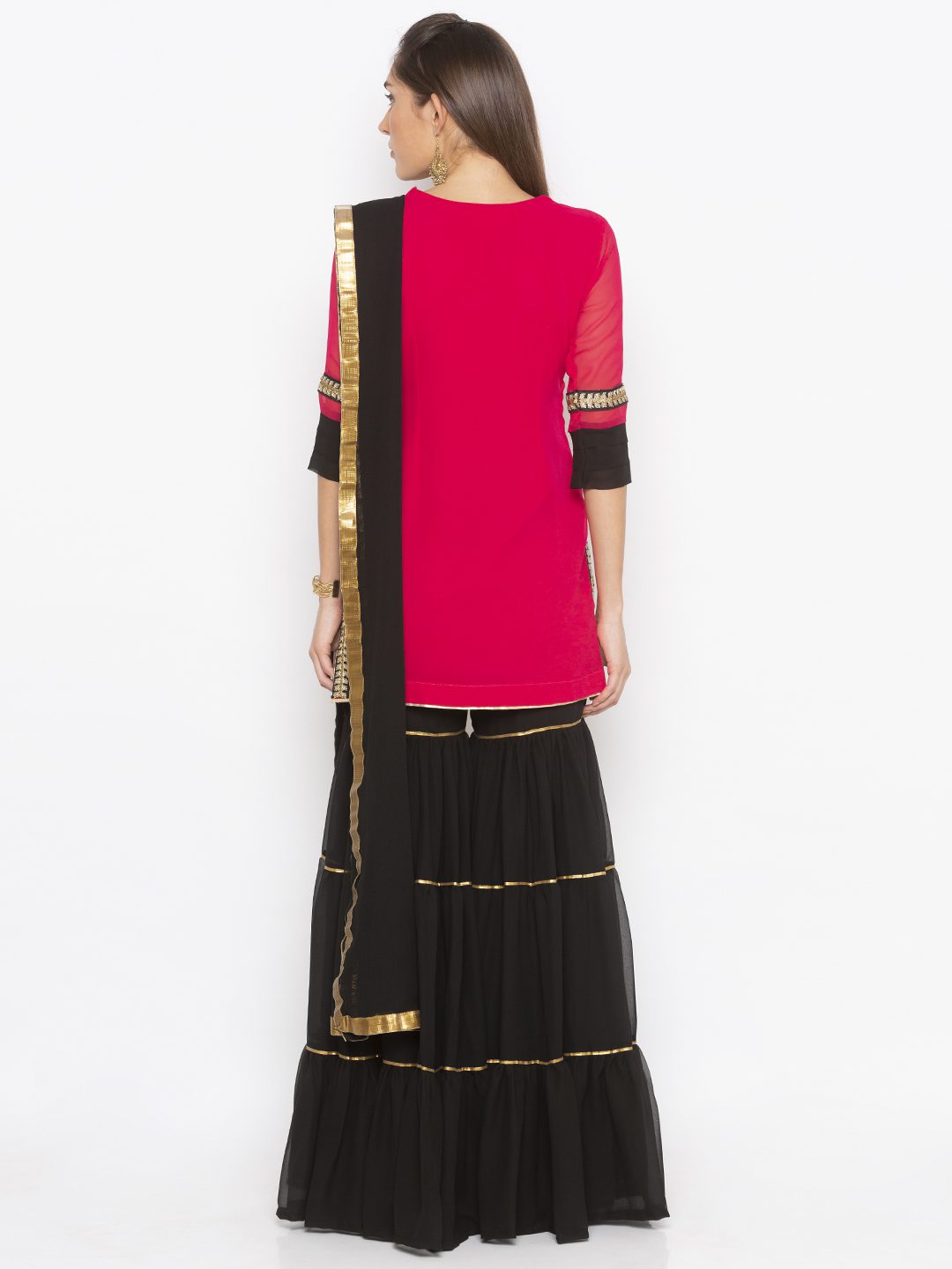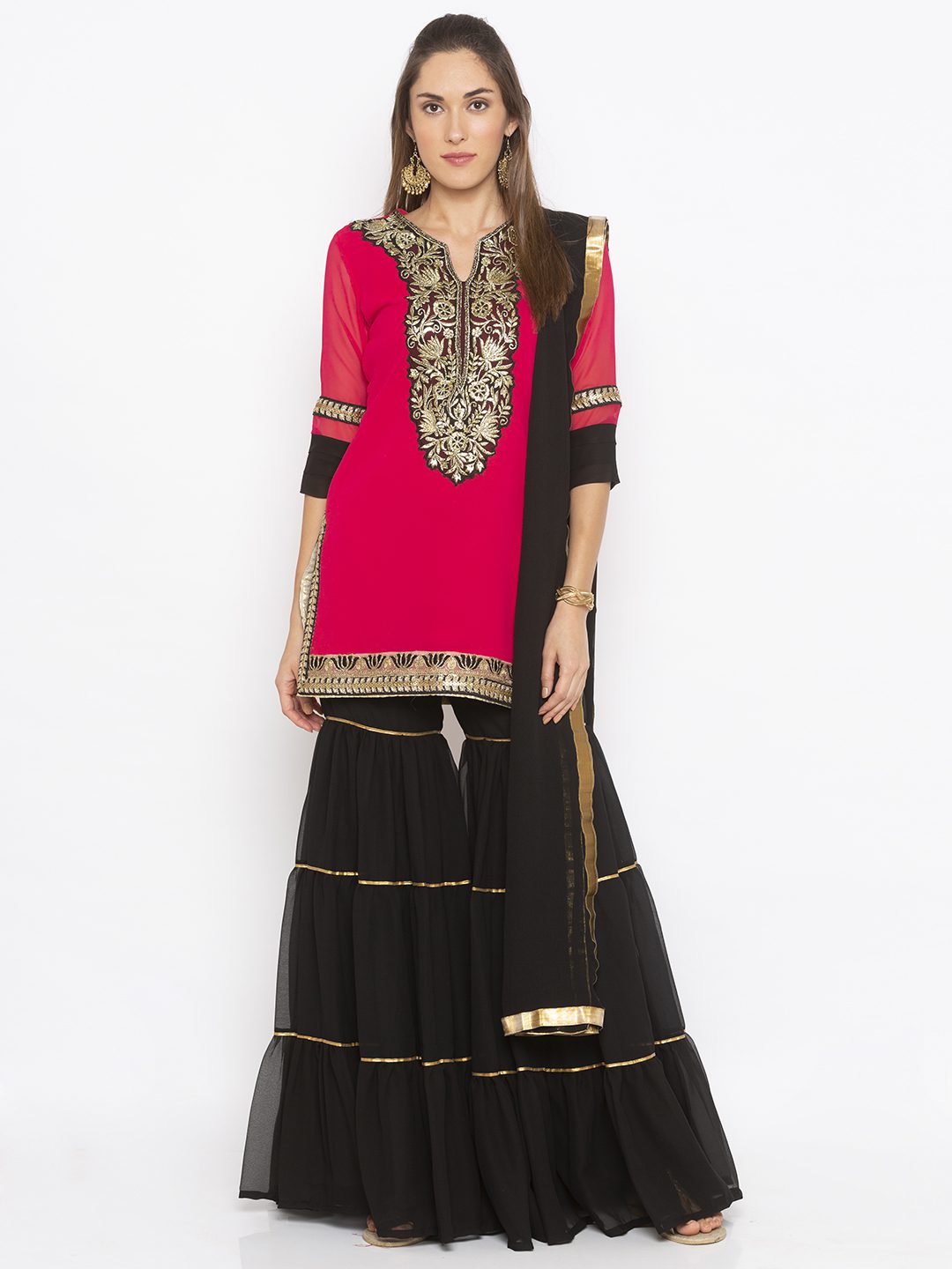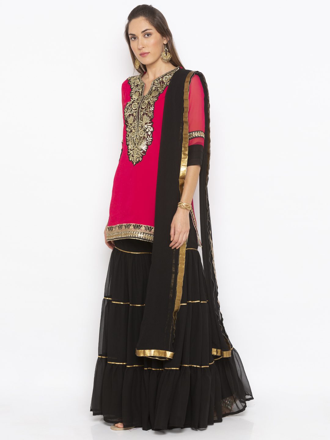 Rani pink ggt short kurta with heavy Gold embroidery on neckline pleated three-quarter sleeves and embroidered borders on side slits and hemline worn with black tiered Georgette Sharara with Gota Patti and black chiffon Dupatta with gold borders on it