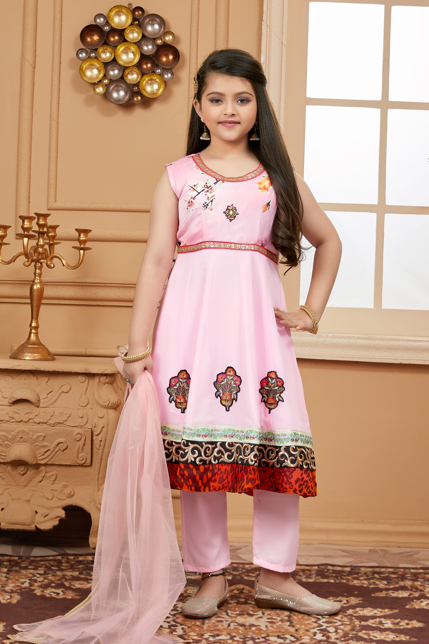 Pink Embroidered Satin A Line Kids Salwar Suits