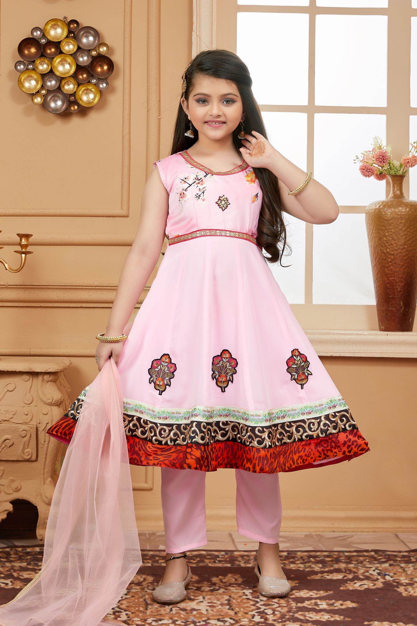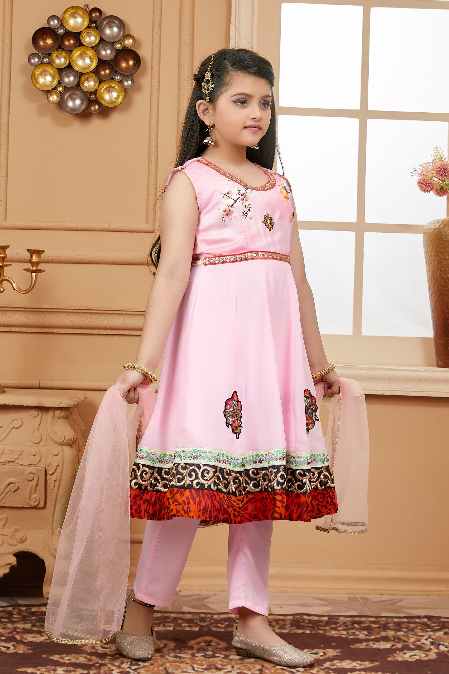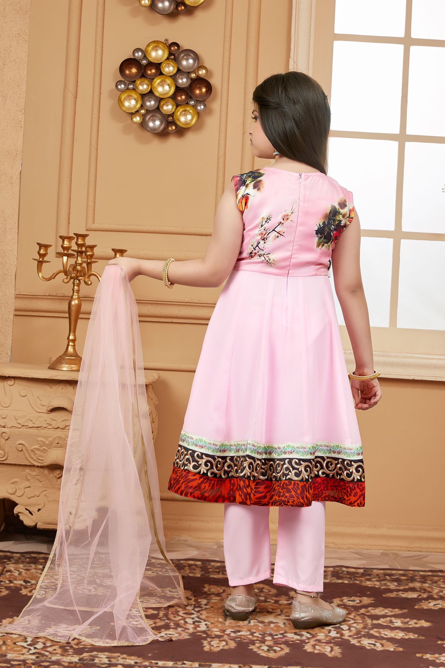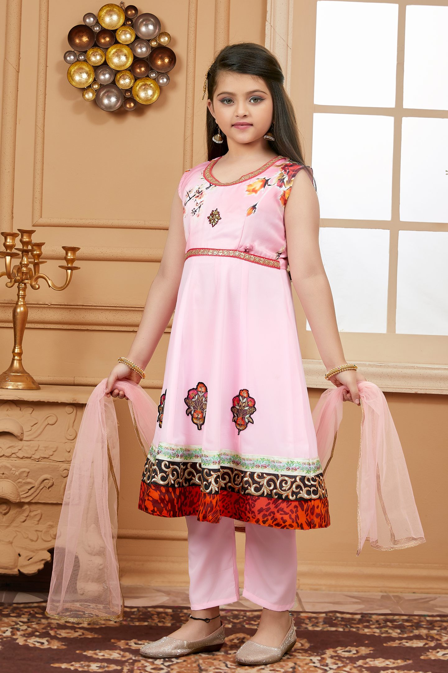 pink printed kalidar kurta with Satin printed upper bodice and plain Georgette kalis …gold embroidery on neckline and embroidered multi colour motifs on ghera with satin embroidered border ..Resham embroidery of black and gold combined with print border in the ghera worn with pink cigarette pants and pink net dupatta with gold gota patti on all sides.