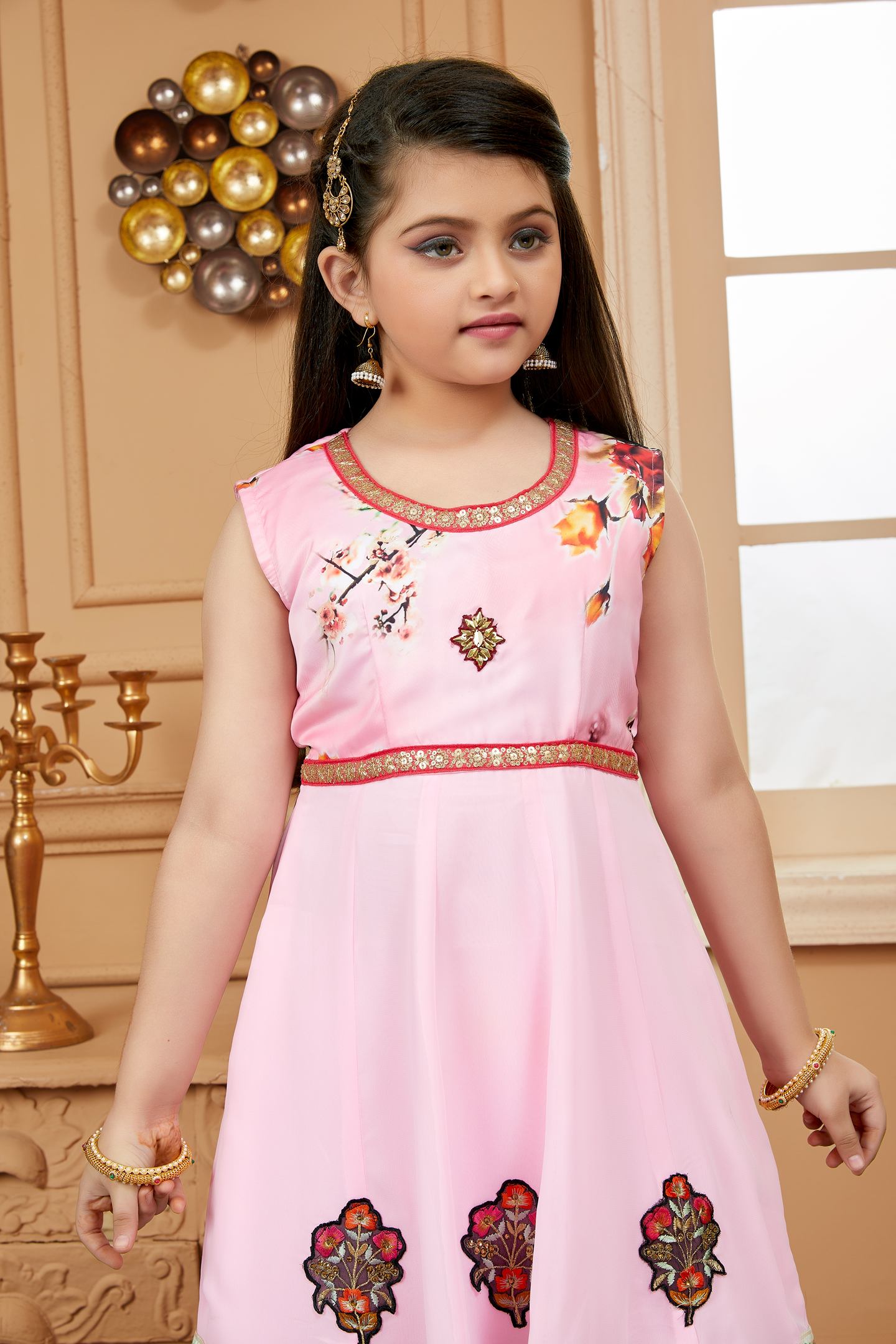pink printed kalidar kurta with Satin printed upper bodice and plain Georgette kalis …gold embroidery on neckline and embroidered multi colour motifs on ghera with satin embroidered border ..Resham embroidery of black and gold combined with print border in the ghera worn with pink cigarette pants and pink net dupatta with gold gota patti on all sides